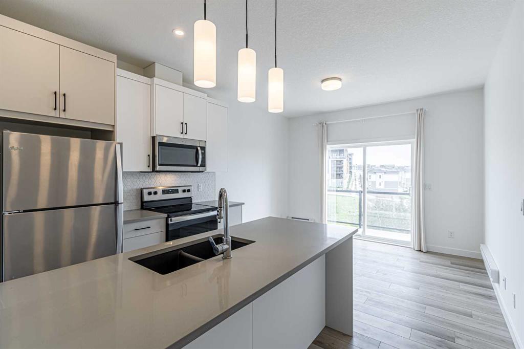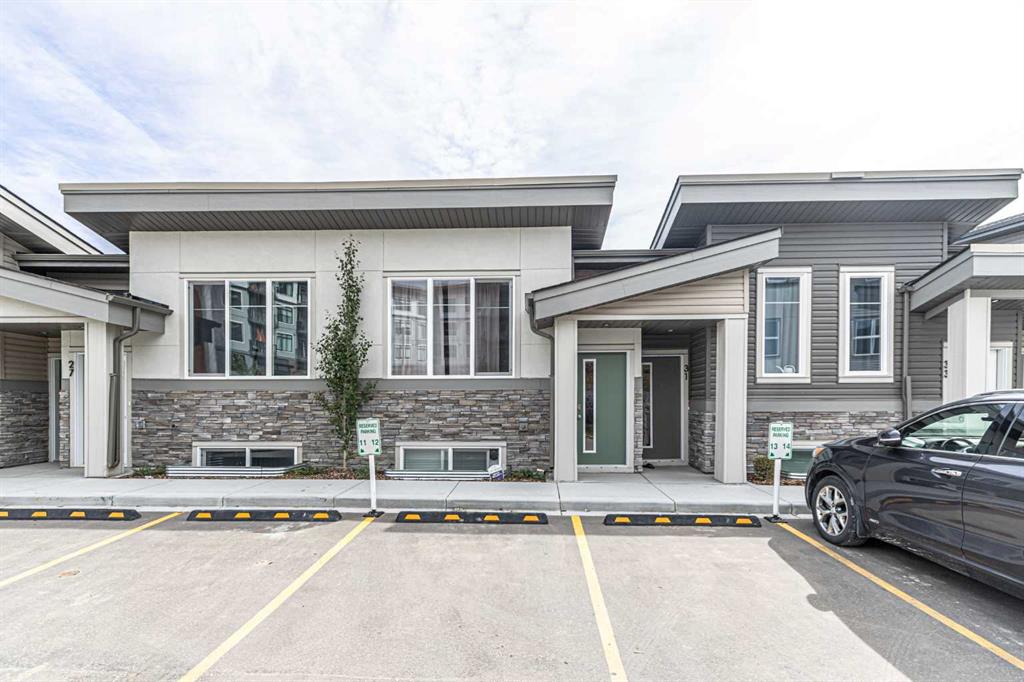 Welcome to a new upscale build in Springbank Hill! Immediate Possession! This stylish, open-concept Bangalow-style townhouse unit on the main level offers affordable luxury and convenient living near the Aspen Landing Shopping Centre and facing the ENVIRONMENT RESERVE PARK (East) from the balcony. It is thoughtfully designed with expansive double pane windows, 9ft ceiling, waterproofed luxury vinyl plank flooring with cork underlay throughout, a spacious living /dining room, and a sliding door to the balcony. The bright and open concept of a large double-glazed window. The European-inspired kitchen is completed with quartz countertops, high-quality cabinets, soft-close doors, drawers, under-mounted upgraded double Bowl Charcoal Sink, a faucet, the standard Whirlpool stainless steel appliances, and stacked washer/dryer. For the environmentally conscious, This Carter Townhome is bordered by a serene natural reserve with abundant walking trails and bike paths that connect throughout this vibrant and burgeoning community. This unit offers a rare opportunity to seamlessly combine urban and rural living and is perfectly located for an active lifestyle and ultimate relaxation. It comes with a titled surface parking stall.