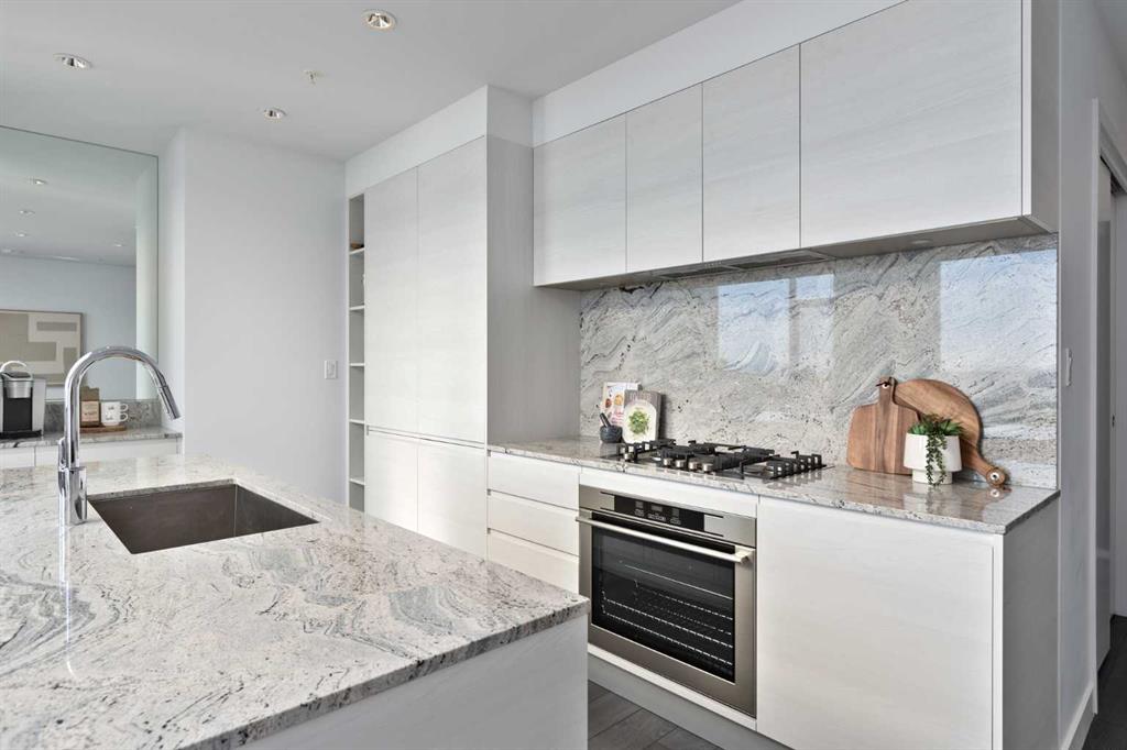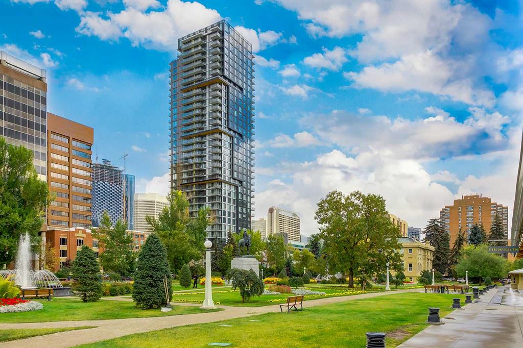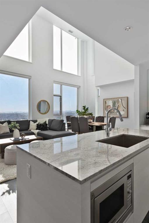 ** CHECK OUT THE VIDEO TOUR ** LUXURIOUS PENTHOUSE - Live in the Sky at Park Point Residences - Prime Calgary Downtown Location. Step into luxury with this REMARKABLE penthouse unit nestled within the esteemed Park Point Residences, offering an unparalleled lifestyle in the heart of downtown Calgary. Boasting nearly 1,000 sq ft of meticulously crafted living space, this LIVE IN THE SKY penthouse impresses with SOARING HIGH CEILINGS and floor-to-ceiling windows that flood the interior with an abundance of natural light, providing CAPTIVATING VIEWS of the dynamic Calgary downtown skyline and the majestic Rocky Mountains beyond. The CUSTOM KITCHEN is a chef's dream, featuring EXQUISITE Italian cabinetry, top-of-the-line appliances, Liebherr built-in fridge and freezer, AEG gas cooktop, and sumptuous GRANITE countertops and backsplash, all complemented by the timeless ELEGANCE of luxurious flooring that extends seamlessly throughout the unit. Perfectly suited for LUXURY modern living, this penthouse comprises of two bedrooms, a den/office, and two bathrooms, each adorned with SPECTACULAR spa-inspired finishes and offering a serene retreat from the bustling city below. Wake up to BREATHTAKING PANORAMIC VIEWS of the cityscape and the rugged beauty of the Rockies right from the comfort of your PRIMARY RETREAT, complete with a generous walk-in closet and a stunning ensuite bathroom. Step into the luxurious ensuite bathroom, adorned with exquisite spa finishes to indulge your senses and elevate your daily routine. Opulent MARBLE countertops and sleek, modern fixtures exude sophistication and style, while soft ambient lighting creates a serene atmosphere. Slip into the deep soaking tub and rainfall shower, and let the stresses of the day melt away. Enhancing the allure of this EXTRAORDINARY residence are the thoughtful touches, including custom motorized roller blinds for added privacy, a spacious DEN/OFFICE area that beckons with its inspiring views - making it an ideal work-from-home sanctuary, in-suite laundry, a dry bar for modern entertaining, and full central air conditioning. Residents of Park Point enjoy access to an array of exceptional amenities, including a fully-equipped fitness facility, rejuvenating sauna, and a serene indoor and outdoor lounge area where you can unwind amidst lush greenery and modern amenities. Whether hosting guests or enjoying a cozy evening by the fireplace in the private social lounge, every moment at Park Point is infused with luxury and sophistication. Convenience is key, with secured underground visitor parking, car and bike wash facilities, and gorgeous front reception and lobby area. Plus, with the assurance of a 24-hour concierge service, your every need is catered to with unparalleled attention to detail. Don't miss this RARE OPPORTUNITY to elevate your lifestyle in one of Calgary's most coveted addresses. Schedule your PRIVATE TOUR TODAY and discover the EPITOME of URBAN LUXURY at Park Point Residences!!