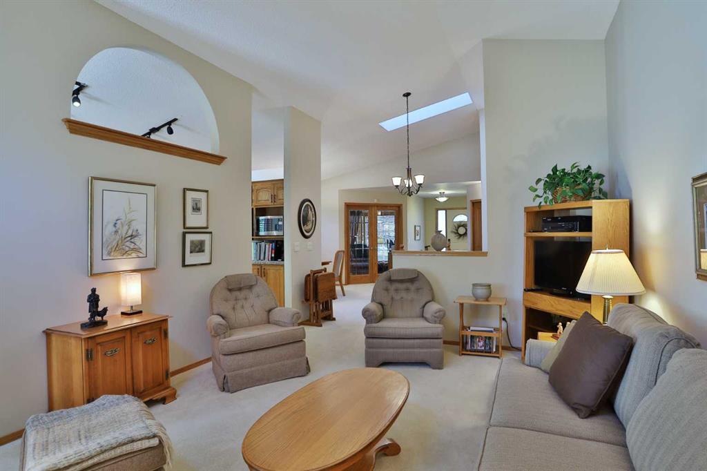 You won't want to miss out on this chance to make your home in the exclusive villa project of HAMPTONS PARK CHATEAUX in the popular golf course community of Hamptons. This lovely 3 bedroom + den bungalow enjoys soaring vaulted ceilings & heated garage, 3 full bathrooms, oak kitchen with engineered granite countertops & a host of improvements including furnaces & hot water tank, lighting, LUX windows & Unicrete concrete tile roof. You will just love the warm & inviting feel of the air-conditioned main floor, with its spacious & airy formal dining room, great-sized living room with decorative archways, dining nook with bay window & updated kitchen with walk-in pantry, loads of cabinet space & stainless steel appliances including Whirlpool dishwasher (2019) & LG stove/convection oven plus white Bosch dishwasher (2018). The main floor master bedroom has a walk-in closet & jetted tub ensuite with separate shower & skylight. The 2nd main floor bedroom is conveniently located across from the 2nd full bathroom. The lower level - with oversized windows, is finished with 3rd bedroom & renovated full bath (2021), large office with French doors & games/rec room with fireplace & built-in cabinets. Dedicated main floor home office with French doors. Main floor laundry with built-in cabinets & full-sized washer & dryer. Additional extras & features include new Hunter Douglas blinds in 2018, sump pump with back-up battery (installed in 2013), new skylights in 2011 (with the new Unicrete roof), motorized awning & gas BBQ line on the deck, roughed-in vacuflo, Toto toilets & new concrete patio (2016). Both furnaces & the hot water tank were replaced in 2014, & triple-pane LUX windows in 2018. The monthly maintenance fees cover snow shoveling & grass cutting so you can throw away your lawn mower & shovel! Prime location in the complex just a few short steps to the tennis courts & bus stops, only minutes to the Edgemont Superstore complex & quick access to Sarcee & Shaganappi Trails so the University of Calgary, LRT, hospitals & downtown are all within easy reach!
