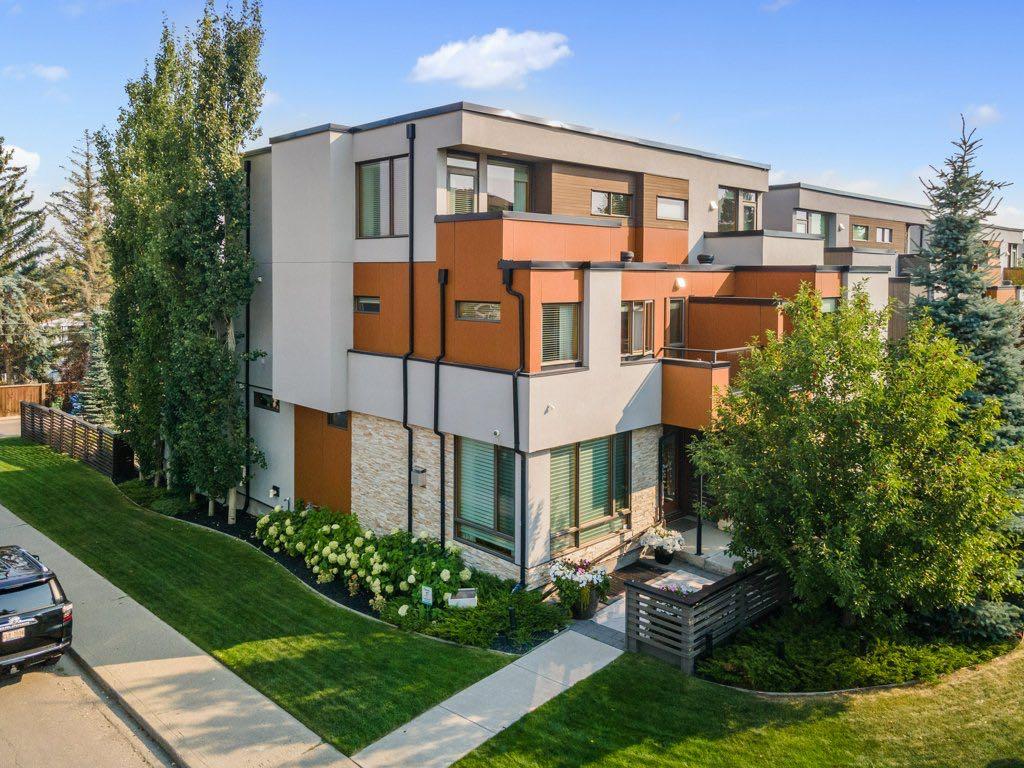 Welcome to this stunning corner-lot property, with professional landscaping, mature trees, and meticulously manicured yard. As you approach, a charming ground-floor front patio leads to the striking custom wooden front door. Once inside, you’ll be bathed in natural light that pours into every corner of the home, highlighting the rich hardwood floors that stretch across three levels, including the elegant open-riser staircase with GLASS WALLS. The living room is a warm and inviting space, featuring a gas fireplace with a tasteful tile surround, wood veneer accents, and custom shelving. Just beyond is the chef’s kitchen, a culinary masterpiece with a generous quartz waterfall countertop and a glass tile backsplash that adds texture and movement. The kitchen is fully equipped with top-of-the-line BRIGADE and MIELE appliance package, including 36-inch six-burner gas stove, built-in dishwasher, wall oven, built-in microwave, oversized fridge and freezer, and wine/beverage fridge. Don’t miss the Miele coffee bar station, a perfect finishing touch to this impressive kitchen. Throughout your tour, be sure to take in the abundance of natural light thanks to the elevated and thoughtfully placed windows throughout. An ELEVATOR provides ease of movement across all levels and is a game-changer when bringing in groceries or larger items. The second floor offers two oversized bedrooms with sculptured carpeting. One bedroom features a private balcony, while the other boasts a his-and-her closet tucked behind double french doors. This level is completed by a full four-piece bathroom, soaker tub and oversized STEAM SHOWER, along with a full laundry room that includes a window, pantry, and sink. Retreat to the third-floor master suite, where luxury and comfort merge seamlessly. This space includes a wet bar with beverage fridge, a cozy living area, walk-in closet, and a private balcony. The grand master ensuite offers a separate shower, oversized deep soaker tub, his-and-hers sinks, backlit mirrors, and under-cabinet lighting. The Fully finished basement added even more versatility to this home, with a multipurpose room perfect for a home theatre or workout area. A full four-piece bathroom and a mudroom with custom cabinets complete this level. The basement’s IN-FLOOR HEATING extends to the oversized, insulated, and freshly painted garage which features an epoxy overlay floor. This home is outfitted with soft water, instant hot water, Vaccu-flo, Aqua Flo Platinum advanced reverse osmosis system, and sprinkler system. Truly an architectural gem with thoughtful design elements and high-end finishes throughout, offering an unparalleled living experience. Discovery the vibrant and evolving community of Marda Loop, where urban charm meets a thriving local economy. Currently undergoing an exciting revitalization project with lively markets, coffee bars, boutique shops and trendy restaurants. This is a highly walkable community and it awaits your arrival!