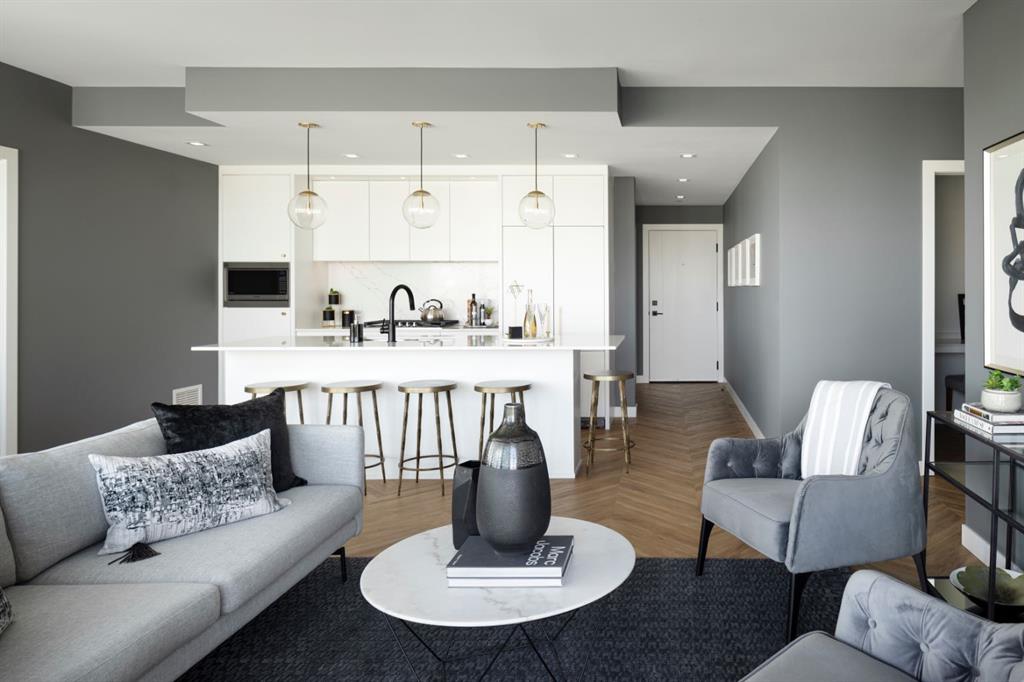 Discover refined living in Gateway, nestled within the prestigious Master-Planned West District community. This concrete-constructed residence features 2 spacious bedrooms, 2 bathrooms, a dedicated home office, and a titled underground parking stall. From the moment you enter, you'll appreciate the meticulous attention to detail. The home showcases the timeless elegance of Chevron luxury wide plank flooring throughout. Both bathrooms are adorned with stunning custom penny round mosaic tiles, adding a touch of sophistication. With soaring 9-foot painted ceilings and ample windows in this corner unit, the space feels bright and welcoming. The chef-inspired kitchen is truly the heart of the home, featuring a striking Matte finish complemented by brushed gold hardware. High-end appliances—including a 36” integrated Fisher & Paykel fridge, panelled dishwasher, gas cooktop, and wall oven—enhance your culinary experience. Soft-close custom cabinetry, under-cabinet lighting, and Quartz countertops and backsplash complete the upscale aesthetic. One of the standout features of this home is the expansive corner wrap-around balcony, offering breathtaking panoramic views and serving as the perfect outdoor retreat. Large floor-to-ceiling windows flood the interior with natural light, creating a seamless connection between indoor and outdoor living spaces. Additional conveniences include an in-suite washer and dryer, along with stylish window coverings throughout, ensuring both privacy and elegance. *Stay tuned for the Photo Gallery*