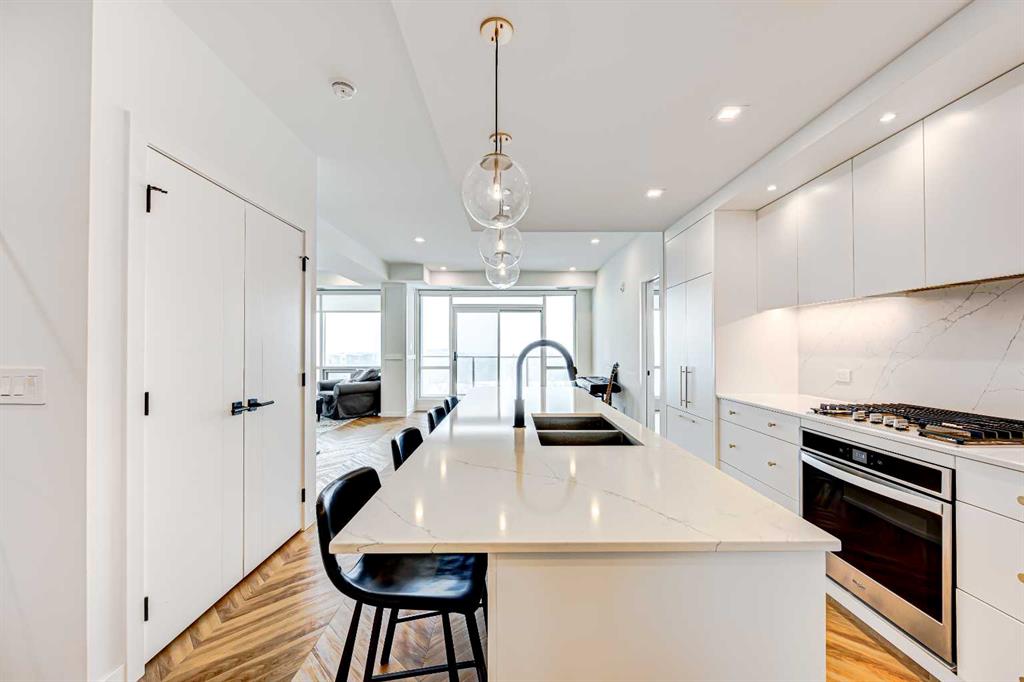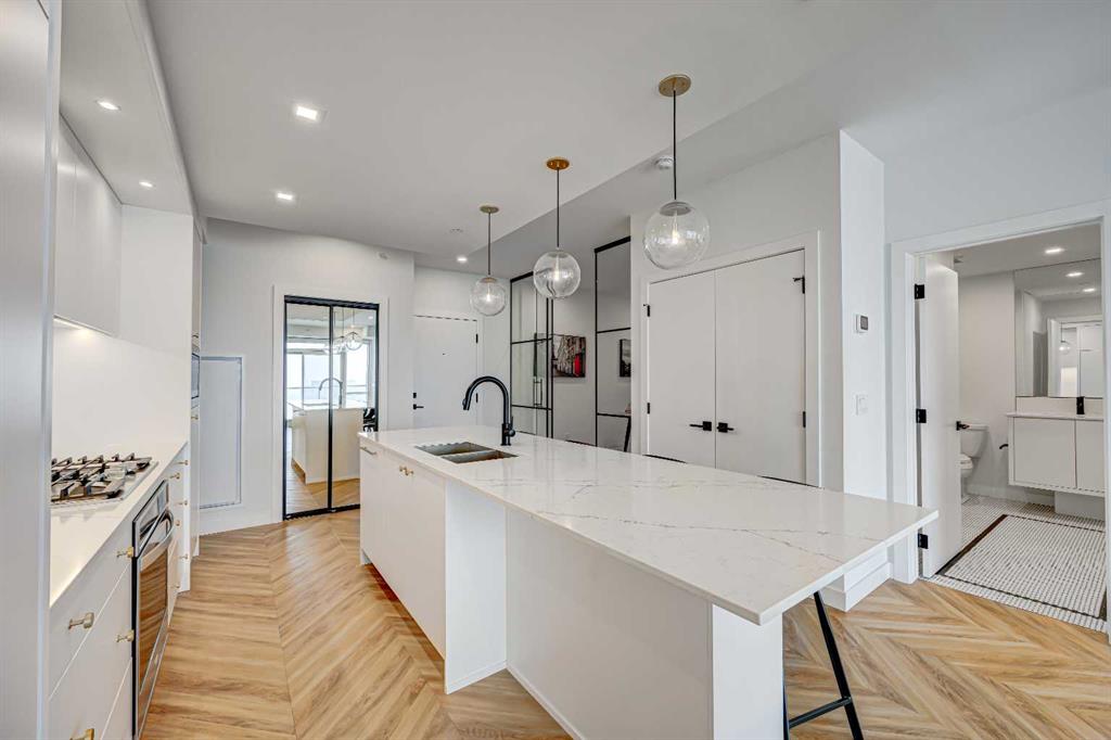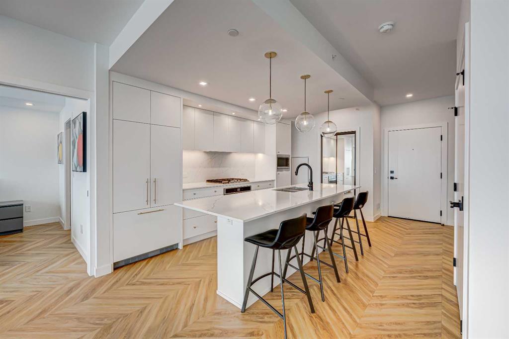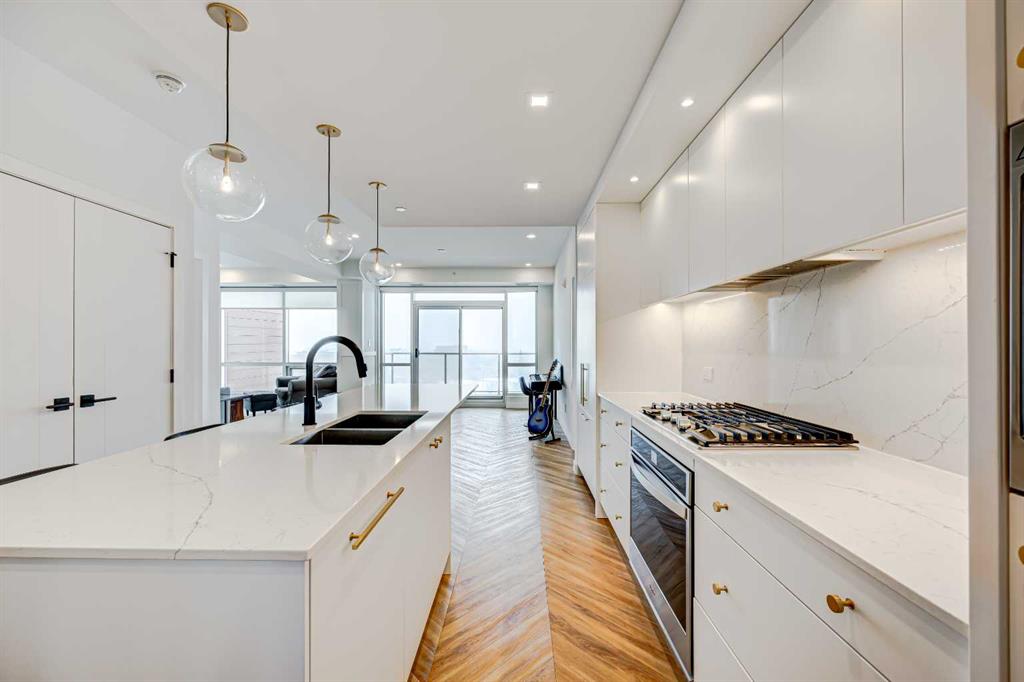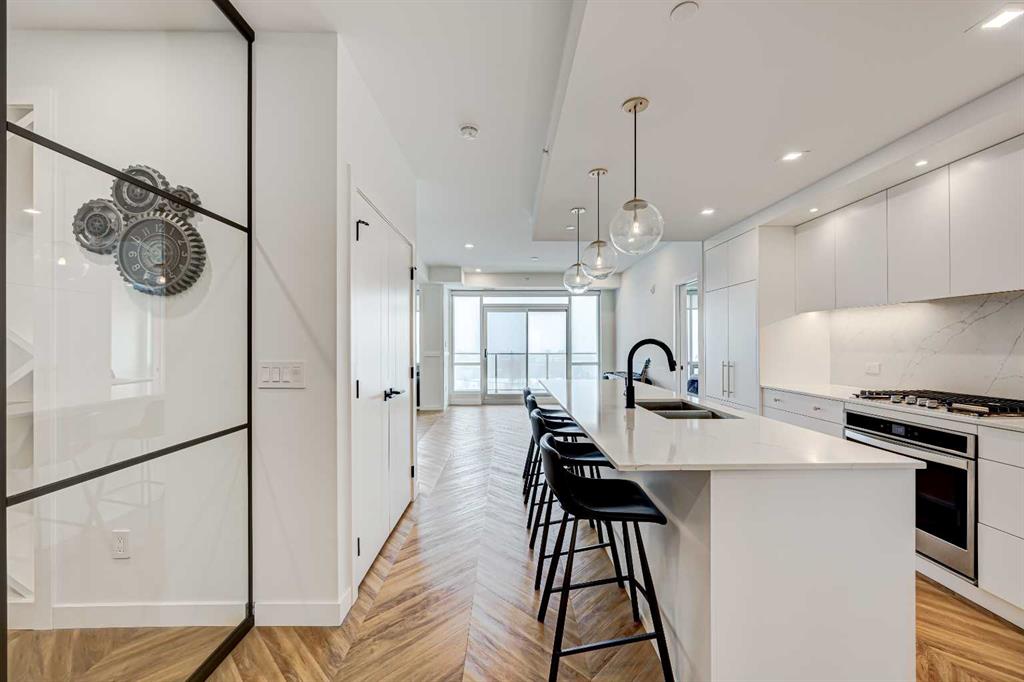 Step into elevated living at The Gateway, located in the vibrant West District. This Pinnacle floor plan features a modern 1-bedroom, 2-bath suite with a versatile glass-enclosed den, perfect for a home office or guest space. The kitchen is a chef’s dream, boasting premium Fisher & Paykel appliances, quartz countertops, and a gas cooktop. The primary bedroom offers a walk-in closet and ensuite, creating your own private retreat. This suite benefits from mixed retail and dining options conveniently situated on the ground floor. Residents can indulge in the local restaurants and shops without leaving the building. The expansive living and dining area is perfect for hosting, and the southwest-facing windows and large balcony offer stunning mountain views and vibrant sunsets, complete with a BBQ gas line for outdoor dining. Additional conveniences include in-suite laundry, air conditioning, and proximity to schools, shopping, and easy city access via Stoney Trail. Make this West District gem your new home—schedule a viewing today!
