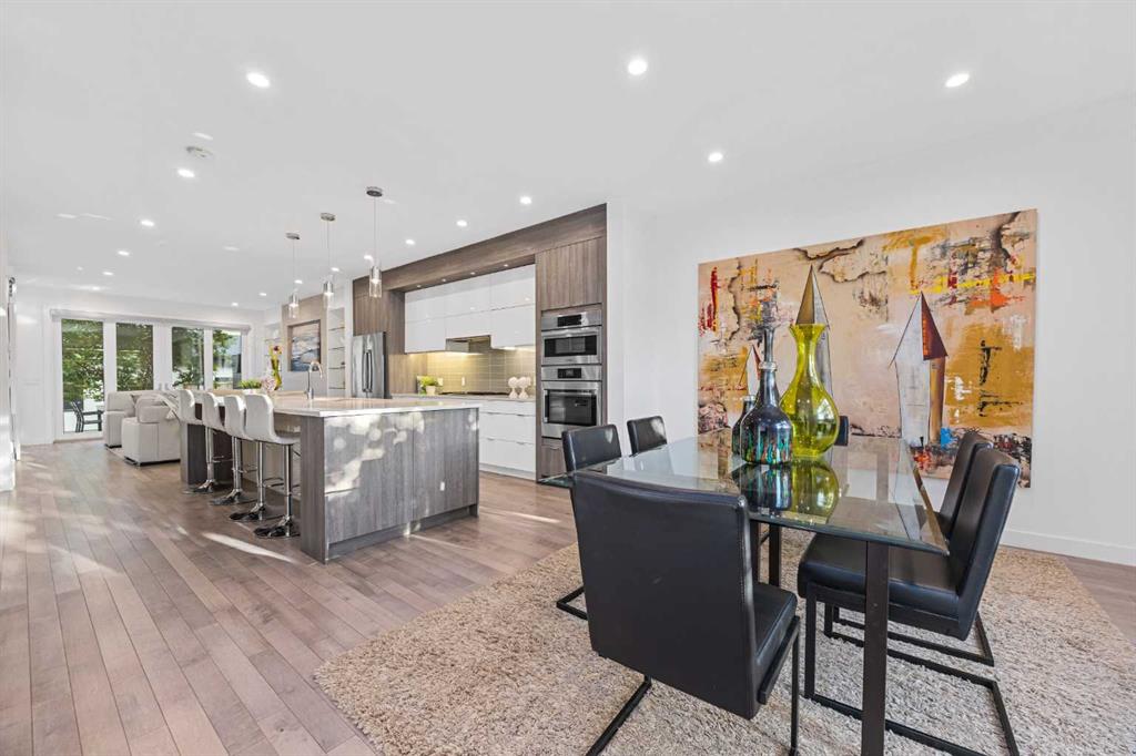 Public Remarks Discover the perfect blend of style and comfort in this beautifully crafted home. Designed for modern living, the main floor is an entertainer's dream, showcasing an open-concept layout with impressive 9-foot ceilings. The front foyer opens to a large dining room with oversized windows. Chef’s kitchen features abundant storage, custom cabinets, a large walk-in pantry, and high-end Bosch appliances. Quartz countertops and two-tone cabinetry add an elegant touch. The living room is spacious with a linear fireplace clad in stone and surrounded by built-in storage. Patio doors lead to a secluded East facing backyard with a deck and gas-burning fireplace. A discreet half bath and mudroom provide functional convenience. An open riser staircase with glass wall leads to the upper floor. Primary bedroom features soaring vaulted ceilings, a spacious walk-in closet with custom built-ins, and large windows that flood the space with natural light. The 5-piece ensuite is a luxurious space with a free-standing soaker tub, dual sinks, heated floor and a steam shower with rain feature. The walk-in closet has plenty of custom cabinetry. Ideal for families, the two secondary bedrooms offer plenty of space for kids, complemented by a stylish 4-piece bathroom . Enjoy the convenience of the dedicated laundry room, equipped with a sink and storage cabinets, also situated upstairs. The fully finished basement boasts a spacious fourth bedroom with a walk-in closet, a family/media room with a wet bar and wine fridge, and a stylish 3-piece bathroom. This home is complete with central air conditioning and is wired for sound. Striking rooflines and beautiful rock accents on the exterior add to the modern feel. Close to parks, playgrounds, and schools, this lovely home is within walking distance to the C train, transit, and an easy commute to the downtown, Mount Royal University and Rockyview Hospital.