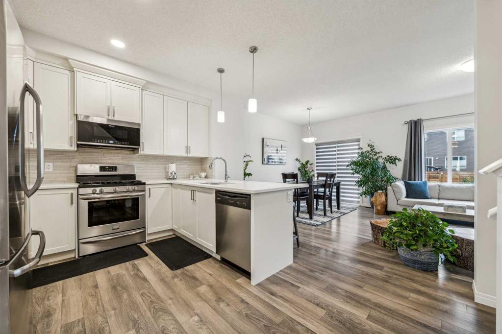 Welcome to this beautiful 3 plus 1 bedroom semi-detached home in the peaceful community of Carrington, offering over 1,900 square feet of fully developed living space on all 3 levels. The home includes a insulated/drywalled single attached garage with an oversized driveway providing plenty of parking. As you step inside, you’ll notice the open and airy main floor, thoughtfully designed with laminate flooring and impressive 9 feet ceilings. The spacious kitchen is perfect for anyone who enjoys cooking featuring a central island, enclosed pantry space, gas stove, stainless steel appliances, and a microwave hood fan. The gleaming white shaker cabinets with crown molding and the quartz countertops gives the kitchen modern by refined look. The living room is features a contemporary electric fireplace with a bracket and prewriring for a TV to be wall mounted above it. The living and dining areas are flooded with natural light, thanks to a large window and patio door that open up to the large expansive wooden deck with cascading stairs to the spacious backyard lawn. This outdoor space is ideal for hosting guests or simply enjoying quiet evenings, complete with meticulous landscaping with apple and cherrry fruit trees and a fully fenced yard for added privacy and comfort. A stylish half-bath on the main floor adds both convenience and practicality. Upstairs, you’ll find a tranquil master bedroom designed for relaxation. It boasts a generously sized walk-in closet and a luxurious 3-piece ensuite, complete with a standing shower and a large vanity that has space for a 2nd sink. The upper level also offers two more bedrooms, a 4-piece bathroom, and a modern laundry room. There are also custom blinds and curtain rods throughout for all of the windows throughout the house. The fully finished lower level features a 4th bedroom and 3-piece bathroom and is perfect for customizing to fit your needs, whether it be a home office (prewired with ethernet), gym area, media room with a dry bar or as additional family space. The 4th bedroom has a window and closet and a door can easily be added as well. There lower level also offers plenty of storage space in the utility room. With its proximity to the community pond and scenic walking paths, you’ll love the outdoor lifestyle this home provides. Plus, major roadways like Stoney Trail are just minutes away, making it easy to get around or head to work. There are direct bus routes to Tuscany train station and Northpointe bus terminal. New roofing and sidings are scheduled to installed in the next few months. This is a fantastic opportunity to own a stylish and functional home in a serene location, offering both quality and affordability. Don’t miss out—schedule your viewing today!