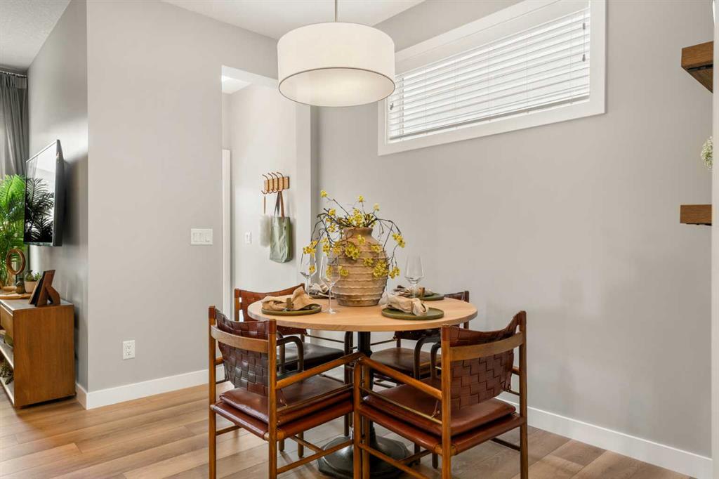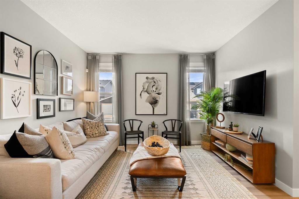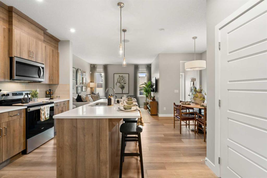 Very rare opportunity to own an impeccably designed Former Showhome in Ambleton! This stunning 4-bedroom, 2.5-bath residence features a long list of upgrades including; Double detached garage (insulated and roughed in for electric or gas heating) underground sprinklers, fully landscaped with rear deck & gazebo, separate side entrance, Ceiling speakers, A/C, Quartz Counters throughout and all Window coverings! From the moment you walk in this home you are drawn into its inviting floorplan, you are first welcomed into the spacious foyer and main floor bedroom (or office) a powder room, and a large pantry. The modern kitchen boasts a sizable island with seating for four, seamlessly connecting to the family room—perfect for entertaining. Upstairs, the luxurious primary bedroom includes a 5-piece ensuite with double sinks and a generous walk-in closet, along with two additional large bedrooms and upper laundry for convenience. The expansive basement offers 9 ft ceilings, bathroom rough-ins, and large windows for future development. Located in one of Calgary’s fastest-growing communities, you’ll enjoy parks, pathways, schools, and a variety of retail shops and restaurants nearby, with easy access to major highways. Don’t wait—schedule your viewing today! Furniture is negotiable in addition to the purchase price.