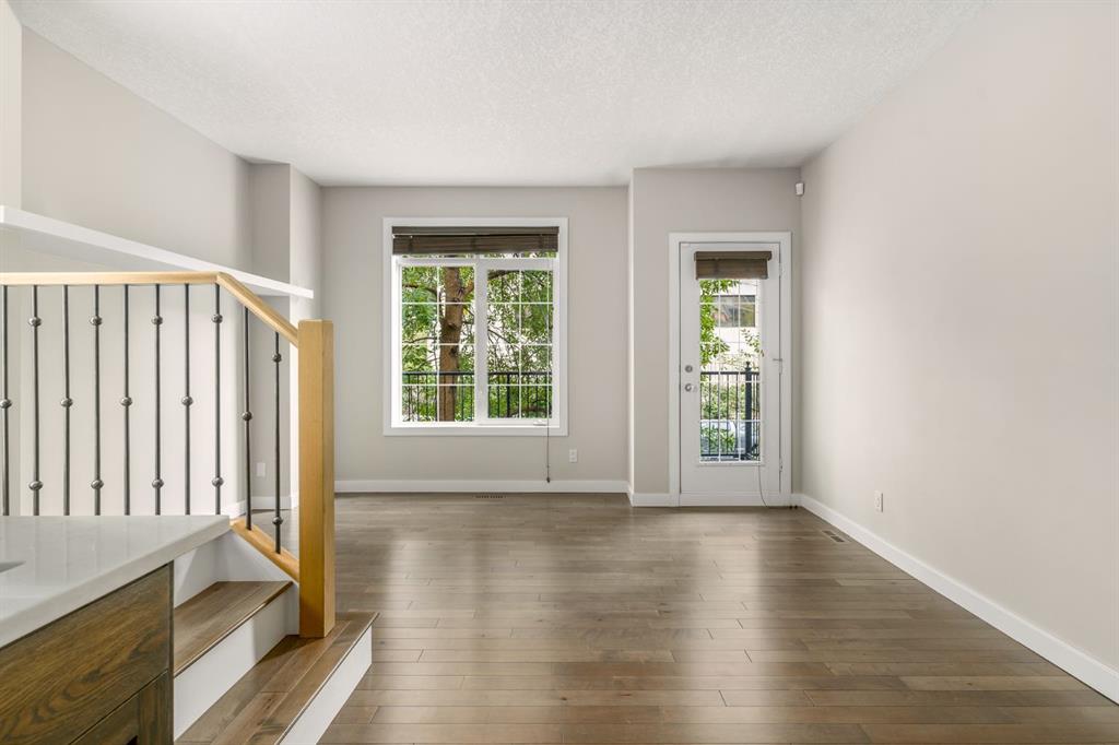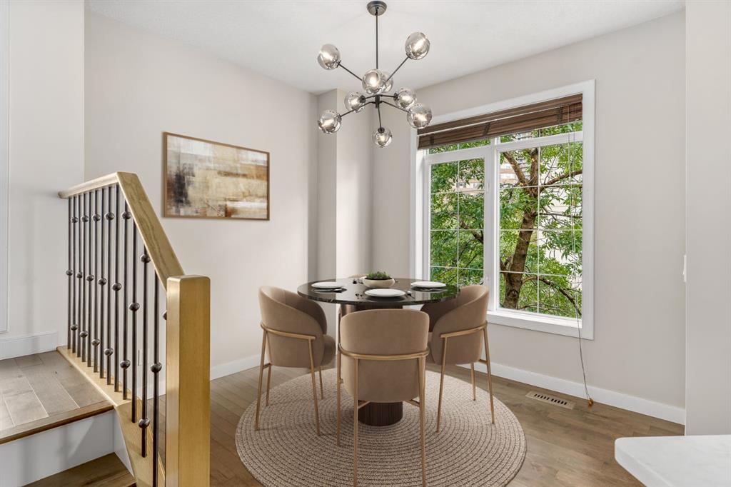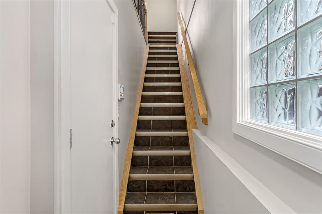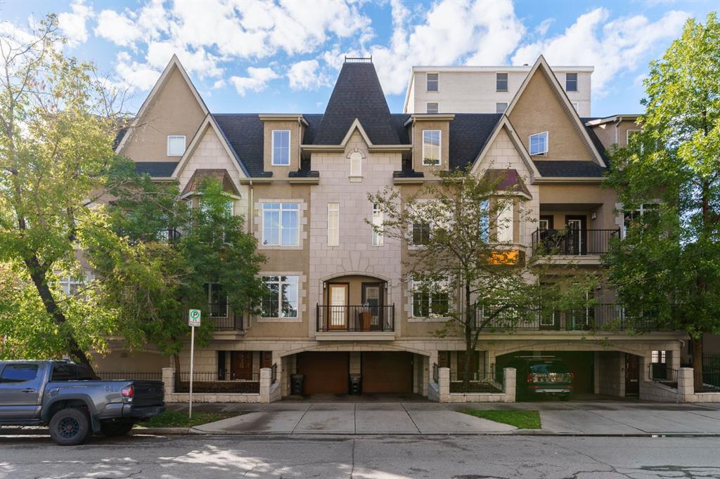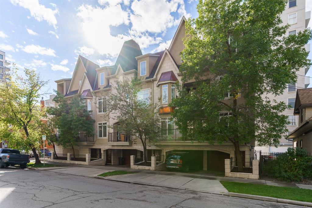 Indulge in an enviable inner city lifestyle with this stunning townhome in the heart of the Beltline. Optimally located and beautifully maintained, this functional space is an investment opportunity that truly encompasses urban living. Central to an abundance of amenities, this end unit is flooded with natural light from carefully placed glass block windows adjacent to the stairwell. Enter through the foyer and ascend a tiled staircase into the vast second floor living space with 9' ceilings, immaculate dark stained maple hardwood and a tile faced electric fireplace. A wet bar with an under mount sink and quartz counter, bar fridge, wine rack, and balconies off both the front and back are perfect features for entertaining guests. The nearby bathroom includes a standup shower in order to fully maximize use of the space. On the third level you can find a chef's kitchen that has been thoughtfully renovated, including oak kitchen cabinetry, double basin stainless steel sink, stainless steel refrigerator, glass tile backsplash and quartz counters. Another outdoor amenity space can also be accessed through the adjoining dining room, a balcony perfectly suited for BBQing. On the other end of this level is the spacious second bedroom, equipped with a Murphy Bed and closet organizers; a versatile space that can easily be converted into a guest room or home office if needed. On the top level is the impressive primary retreat, with a giant walk-in closet, private west-facing balcony, and conveniently located laundry. The connected ensuite includes a water closet, extra deep soaker tub, rain shower with glass doors and double faucet sink. Enjoy ample opportunities for storage throughout the home, along with an attached single garage that is heated, drywalled and insulated and fit with built-in shelving. Additional upgrades include a new hot water tank and high efficiency furnace both installed in November 2022. Security system hardware and cameras are also included with the sale. This breathtaking home is part of a healthy condo with low fees and is fully self-managed, and is favourably zoned for potential commercial use. Ideally situated amongst endless parks and inner city attractions in a charming pedestrian-oriented community. Commute anywhere in minutes thanks to the nearby 12 Avenue Cycle Network, and visit boutiques, restaurants, and coffeeshops mere steps from your front door, including the many shops along 17th Avenue Retail and Entertainment District, and so much more.