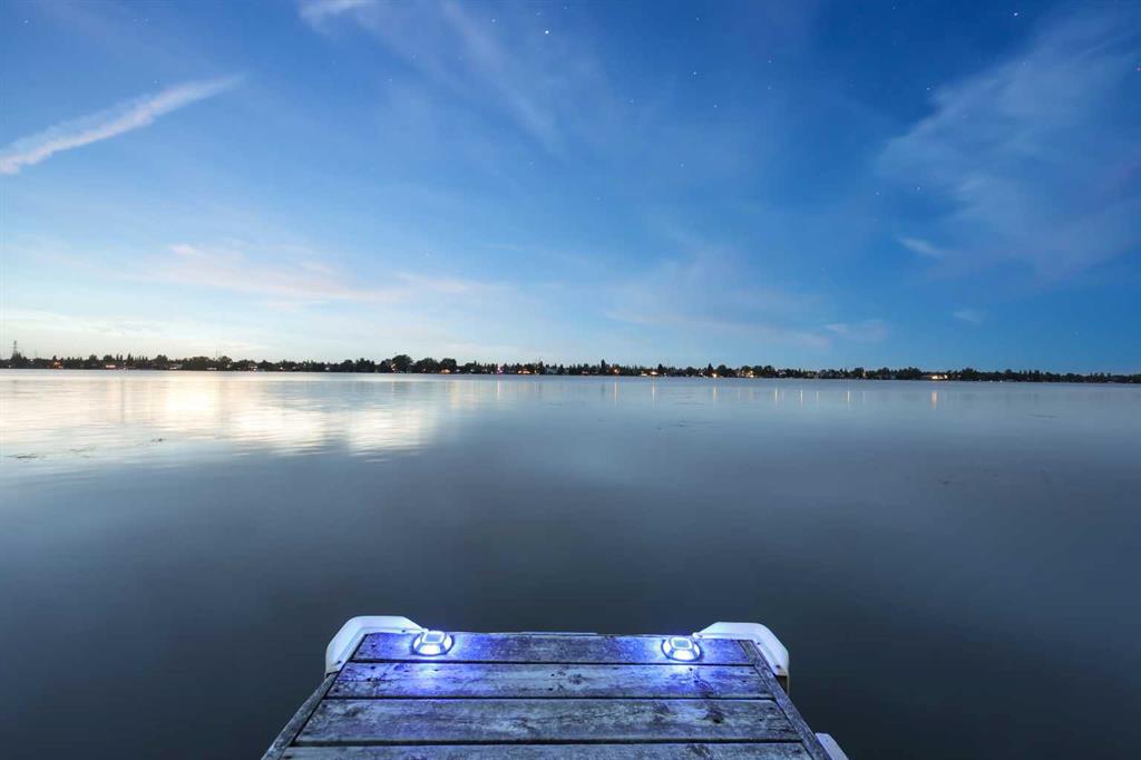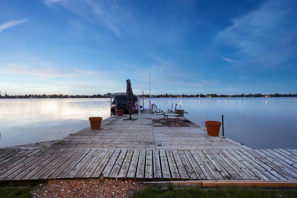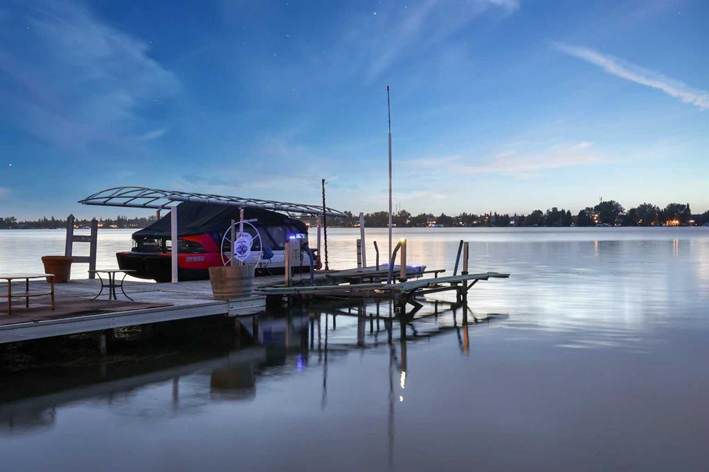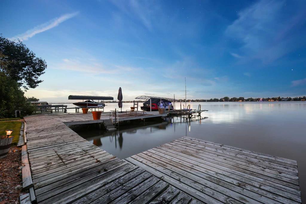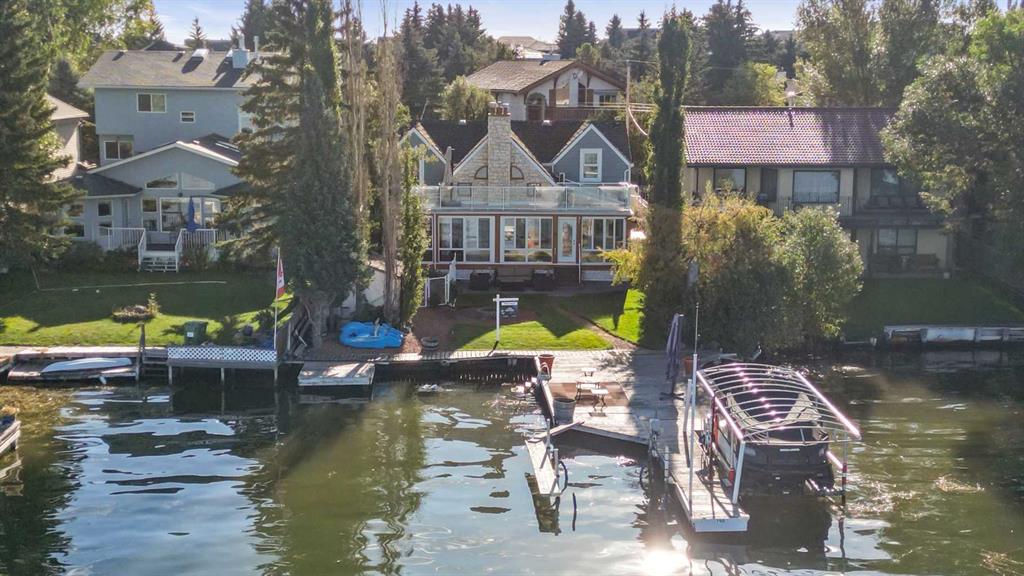 **OPEN HOUSE ALERT - SAT+SUN 2:00 to 4:00 pm** Discover Estate Lakeside Living with all the best at your doorstep! Water sky anyone? 2300+ square feet of indoor and outdoor living space with a lake in your backyard. Act fast, Move in, Have fun! PREMIER CHESTERMERE LAKE LOCATION on the EAST SIDE – MOUNTAIN VIEWS, EVENING SUNSETS, and RESORT COTTAGE LIFESTYLE LIVING. Enjoy this home's quality finishing and prized wealth in a quiet private yard with a west-facing lake exposure. It is a family-approved location with a backyard to relax and unwind—a private dock for two boats. The owners have lovingly maintained this fully finished two-story split with an extensive list of luxury upgrades and updates. This bright open design features 1620 sf on the main floor with high 18' ceilings, a central family room with a stone-faced fireplace, and all overlooking the kitchen/dining room. Main floor living also includes an open foyer, study area, 37' wide sunroom with a gas fireplace, sizeable primary bedroom suite, kitchen, mud room & laundry area. This fantastic space offers a CHEF's remodeled dream kitchen with tall custom cabinetry and doors, modern granite counters, modern stainless steel appliances, a dramatic central island with an undermount prep sink, and a large corner pantry. The upper primary bedroom retreat features more views, a walk-in closet with organizers & a large modern spa-like owner's suite featuring granite top vanities, and a separate tiled shower with 10-mil glass. The upper level includes another bedroom with a Murphy wall bed, a private door to the upper deck with 240SF more entertaining room, and west views of the lake. Other upgrades include outdoor glass railing, A/C, two detached oversized 27'x11' garages with more storage, and one with a car lift. Bonus: three sheds, 34'x16' gated front patio, enclosed front covered porch, off-street front parking for 4+ cars, another 26’x11’ concrete patio plus firepit area on the lakeside with a pathway to your private dock, cement fiber board exterior, stone detail, cedar shake roofing, and mature landscaping. You are living at its best with nature, community, and navigable water at your doorsteps. Take advantage of this sought-after lake community just 10 mins east of the city. Truly quality lifestyle being so close to first-class golf courses, schools, parks, transit, shopping, road and highway infrastructure access all nearby. Quick possession date available. Call your friendly REALTOR(R) today to book a viewing!