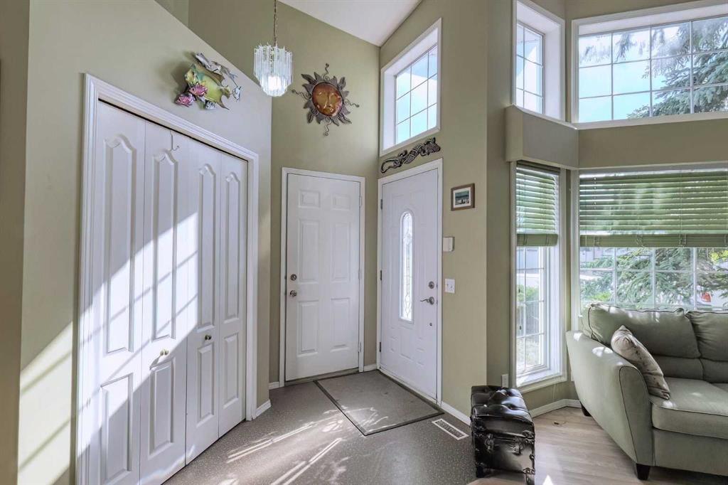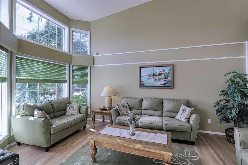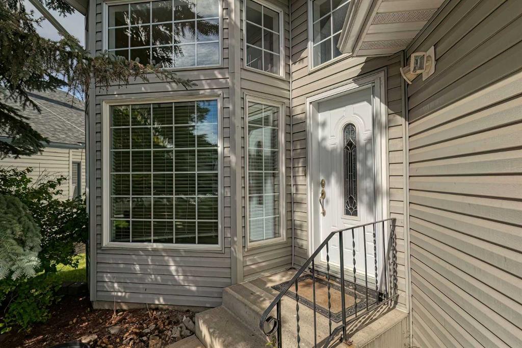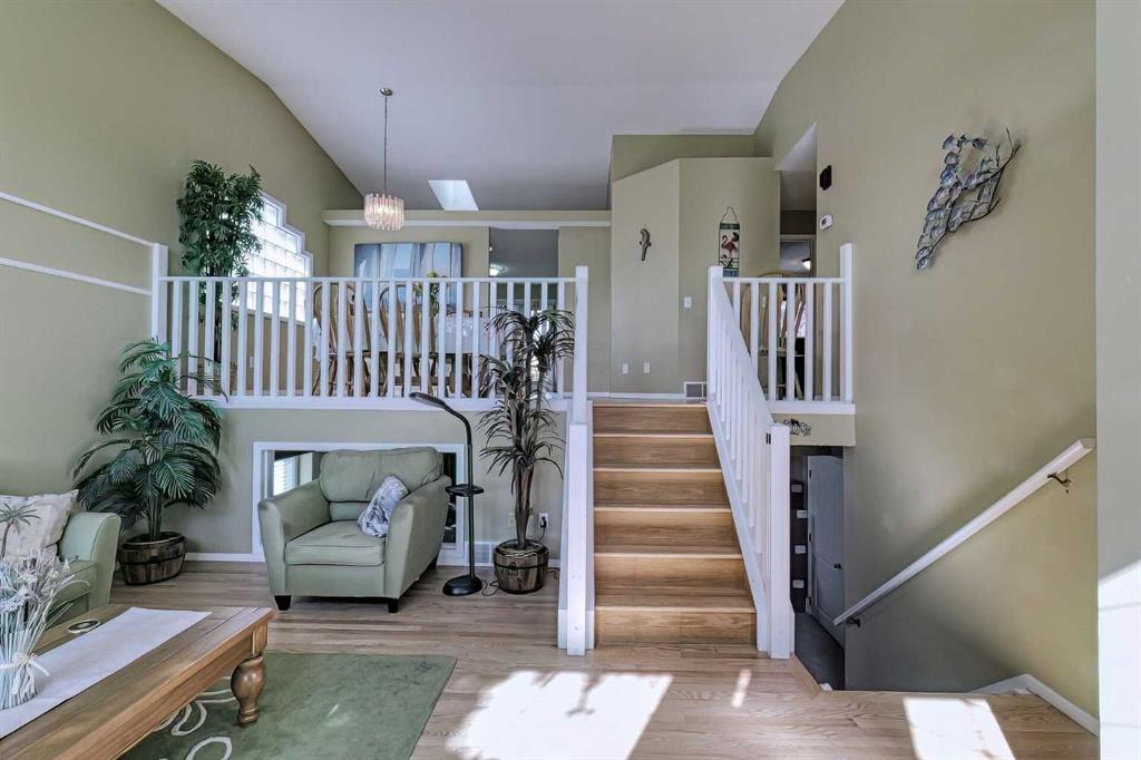 Excellent Airdrie Location and great curb appeal in this former showhome with FOUR Beds / 3 Full Baths close to schools, parks, pool, Genesis Place and shopping in a FAMILY FRIENDLY AIRDRIE Neighbourhood. Fully Finished WALKOUT to a fenced yard with 6 ft vinyl fencing, a covered deck on the ground level, firepit, garden shed and mature trees and landscaping. The asphalt shingle roof was replaced in 2014 and the windows feature a higher R-factor. A spacious foyer welcomes you home to a bright living room on the ground floor featuring a two storey vaulted ceiling. A few steps up brings you to the main level with dining room overlooking the living area & adjoining the kitchen with plenty of storage space, additional lighting provided by a skylight, plus a breakfast bar and room for a small eating area if desired. A deck for entertaining and barbecuing off the kitchen overlooks the fenced backyard. Primary suite with 4pc ensuite, & TWO more bedrooms share a 4pc bathroom completes the main level. A stairway at the entry leads down to the WALKOUT level into a huge open recreation room or family room with gas fireplace. Finished space also includes an additional bedroom, a 150 Sq FT Flex area with a laundry area, a 3pc bath plus the Utility room. An insulated crawl space below the living room provides additional storage space. Solar panels were installed in October and are now operational. This will provide a projected substantial saving on utilities to the home owner going forward. This is a great family home in a mature and accessible neighbourhood so don't wait too long to check it out!!