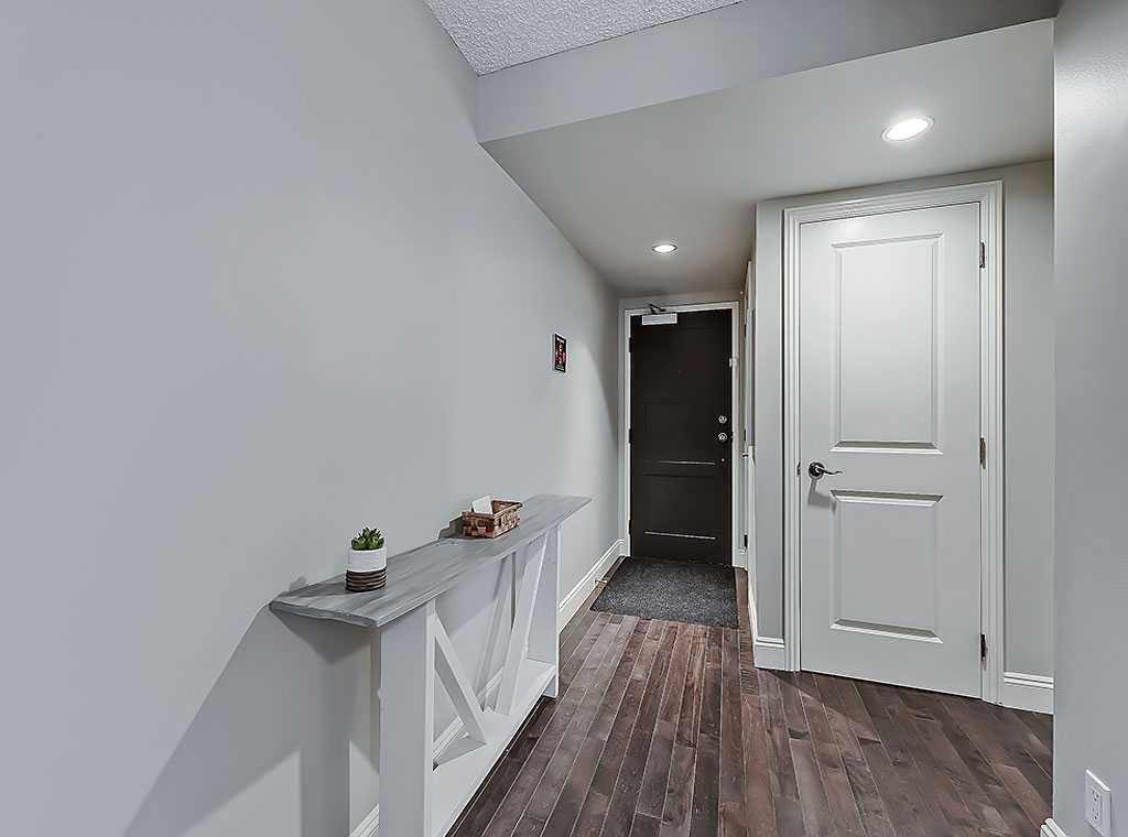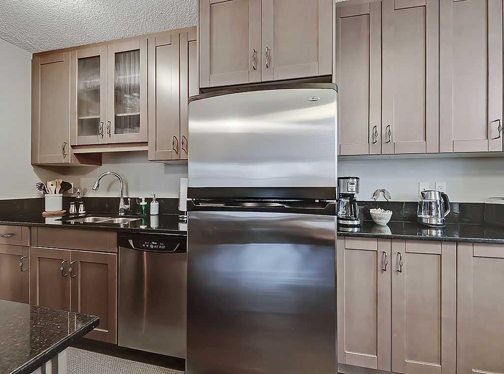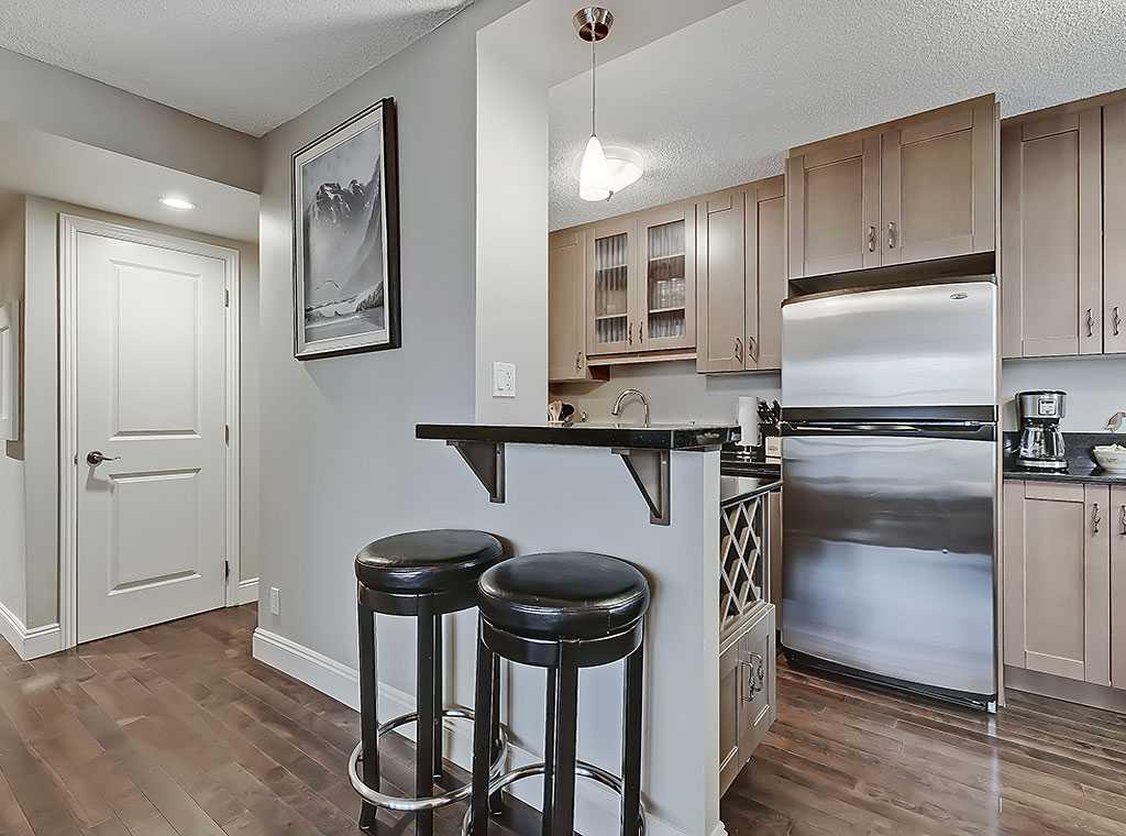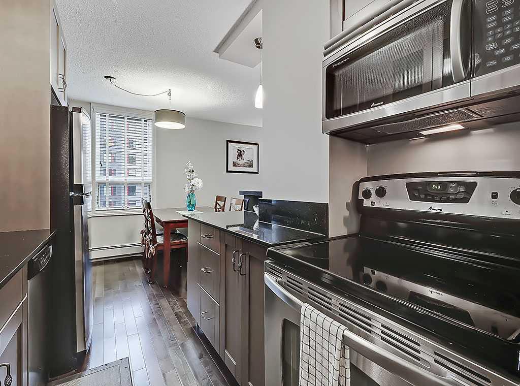 This stylish 2-bedroom, 1.5-bathroom condo at Centro 733 offers the best of downtown living with its prime location just steps from vibrant 17th Ave. Enjoy stunning views of the city skyline and the historic Lougheed House from windows facing north, west, and south. Inside, the unit is packed with thoughtful upgrades, including extended granite countertops, a cozy breakfast nook, and ample storage with built-in cabinetry. The kitchen shines with stainless steel appliances, adding to its sleek, modern appeal. The primary ensuite features a convenient two-piece design, while rich espresso hardwood floors throughout the main living spaces provide warmth and elegance. In-suite laundry adds convenience, and the building also provides three large coin-operated laundry facilities in the basement. Centro 733 offers residents great amenities, including a party room, a fully equipped fitness center, professional management, and secure surroundings. With a designated parking stall and storage locker, this condo combines comfort and peace of mind—an ideal place to call home.