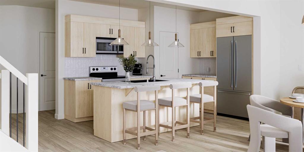 The 'DALLAS' END UNIT Triplex (no fee), Built by Rohit Homes, An award-winning home builder for over 35 years known for its Design Interiors. SEPARATE ENTRANCE | DOUBLE ATTACHED GARAGE | UPSTAIRS BONUS | BRAND NEW | INTERIOR DESIGNED by Louis Duncan-He | 1,726 sq ft 3 bed , 2.5 bath | Built by Rohit Homes & Perfectly located at Sora in Hotchkiss, a neighbourhood known for its natural beauty and warm community feeling. The design interior in this unit is: 'ETHEREAL ZEN' (you can choose other units with different finishings - contact) , creating a Timeless, Classic, Elegant, Poised, Exquisite, Grace and Luxury theme. UPGRADES AND FEATURES INC: quartz counters throughout, kitchen cabinets 42' tall, separate entrance, attached garage and so much more! Step inside to find yourself gravitate towards your large chefs kitchen, which includes SS appliances, quartz counters, large island (with place for bar stools), cabinets to ceiling (42' tall), walk thru pantry to garage (handy) - a perfect place to gather and create masterful meals. Off the kitchen is the nook, and living space. There are windows across the rear, and with the high ceilings as well as open floor plan, it leaves the home feeling bright and inviting. Upstairs, find 3 good size bedrooms, with one being the primary retreat, that includes a large walk in closet, and spa like retreat full en-suite. To complete upper level is another full bath, and laundry. There is separate entrance to basement. To wrap this up is an oversized single attached garage - a must have for our winters! This home is packed with features that make it a great option to consider for your next home purchase. Located just outside the ring-road, east of Stoney Trail, offering quick access to highways and other amenities on the southeast side of Calgary. Get moving on this captivating place - before it's gone!