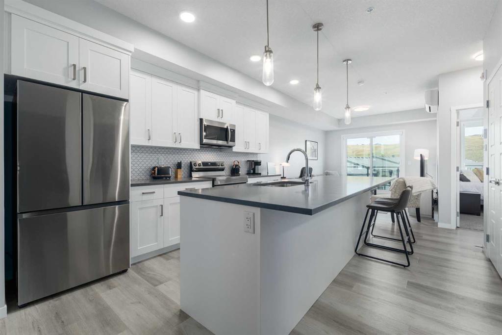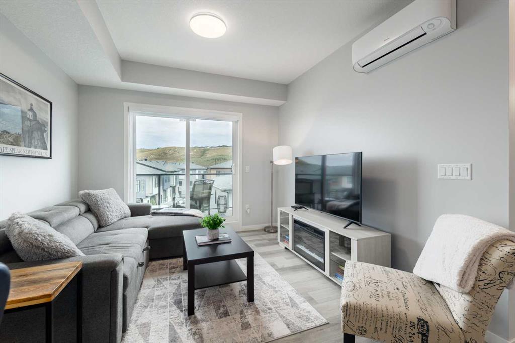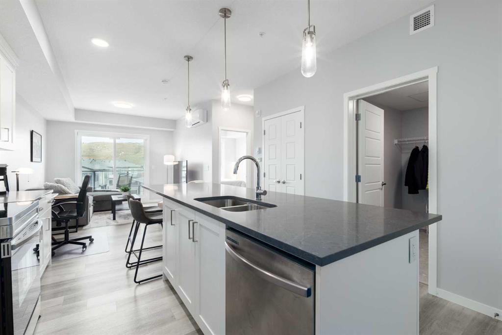 Public Remarks Welcome to Riverstone Manor, located in the picturesque neighbourhood of Cranston's Riverstone! Newly built in 2023 by Cedarglen Living, winner of the "Builder of Choice Award" for the past 5 years, this thoughtfully laid out condo has exceptional finishings. This bright, modern, top floor unit is perfect for first-time home buyers and investors alike (Air BnB friendly on board approval!). Step inside on the luxury vinyl plank and be greeted by the immense kitchen island with built-in dining area, exceptionally crafted with quartz countertops. The extended cabinets along with the full-sized pantry create expansive space, so no need to worry about where to put all your dishware and groceries. The 9-foot ceilings and contemporary colours of the cabinetry and floors make the space feel very spacious and airy. This condo is filled with upgrades you will absolutely enjoy, including A/C, Lifebreath HRV Fresh Air Ventilation System, triple paned windows, BBQ gas line, and much more. Fall in love with the community of Riverstone, situated along the Bow River and Fish Creek Park, filled with pathways and parks to stay active while remaining close by to surrounding amenities. This unit comes complete with plenty of storage space and a parking stall that is just steps outside the building. Call your favourite Realtor and see this amazing unit for yourself!