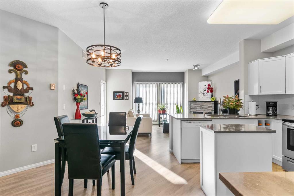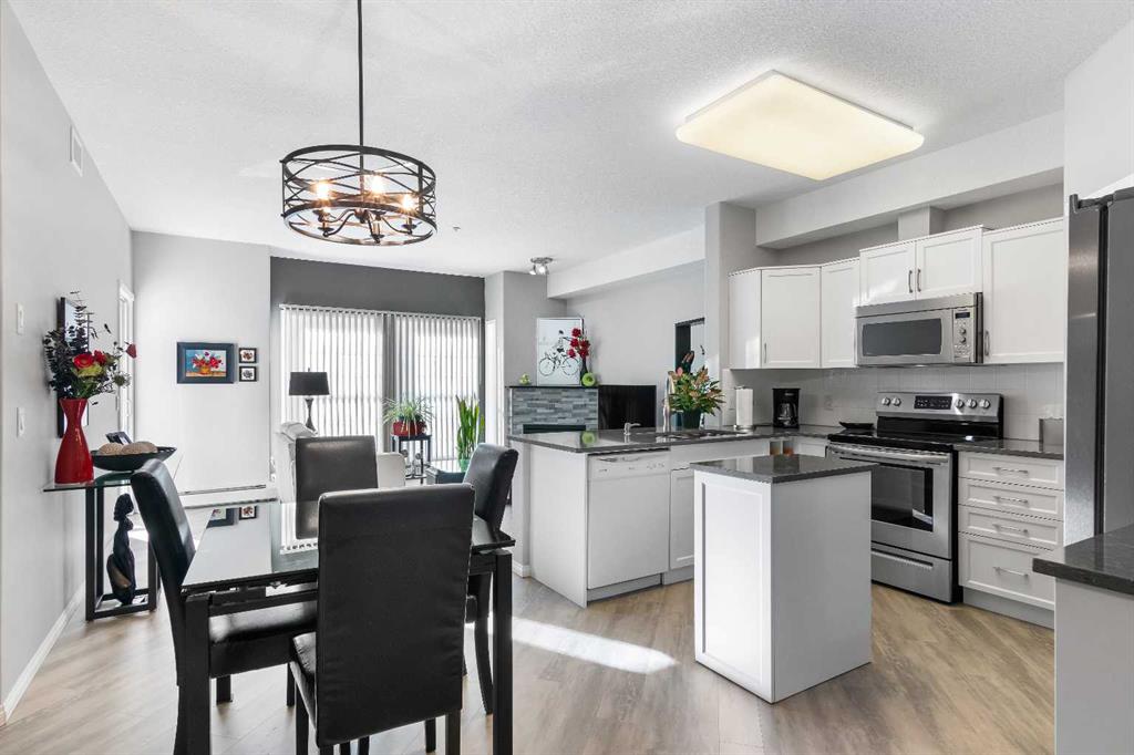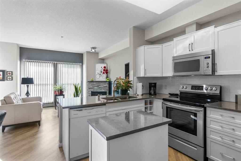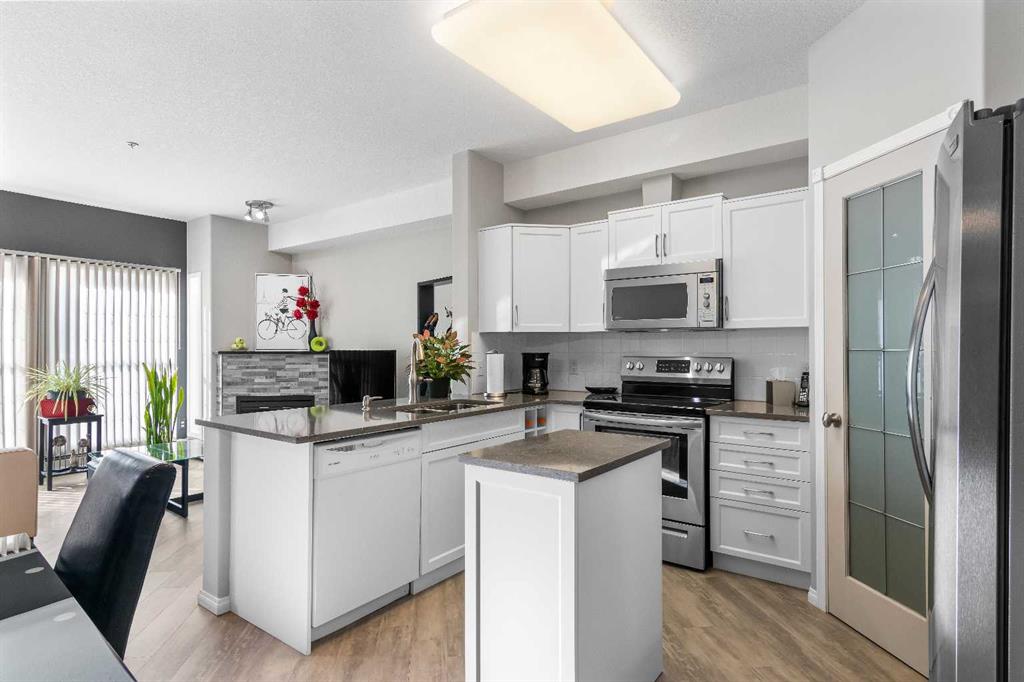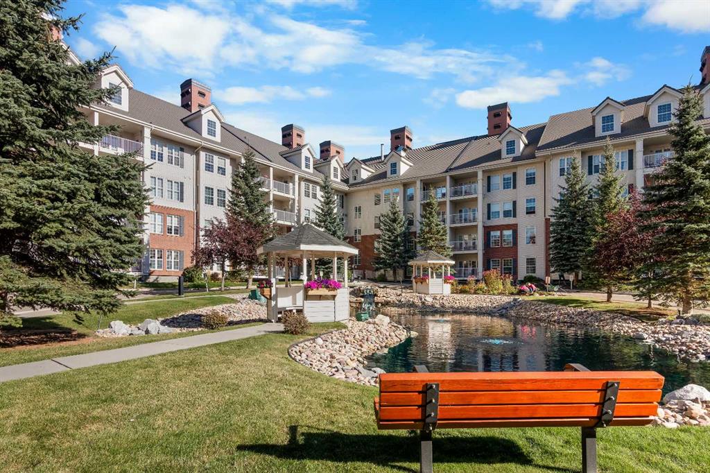Welcome to "Country Estates on the Cove”, the luxurious adult living (40+) complex located in Country Hills Village adjacent to the walking pathway around a large pond. This 1 bed + den, 1 bath apartment condo features 887 sq. ft., 9’ ceilings, and a recently renovated spacious open floor plan including quartz countertops, new paint & light fixtures, and luxury vinyl plank flooring throughout. The south-facing living and dining areas are enhanced by an electric fireplace and a separate french door (with phantom screen) which opens out to a private balcony facing the inner courtyard gardens & water feature. The kitchen is equipped with newer stainless steel appliances and includes a corner pantry and a moveable center island offering plenty of storage space. The primary bedroom is generously sized with a ceiling fan and walk-in closet and the den can easily be converted into a 2nd bedroom. The bath includes a large walk-in shower and quartz vanity countertop. The laundry features a newer pedestal washer & dryer and storage cabinets. Enjoy summer comfort with air conditioning and benefit from a secure titled underground parking stall and storage room. Amenities in this complex abound: large foyers, extensive libraries, party rooms, guest suites, craft room, workshop, bowling alley, theatre, indoor swimming pool, fitness center, car wash bays, outdoor gazebo picnic area, and visitor parking. Close to Vivo Centre, shopping, restaurants, and transit. Don’t miss this chance!
