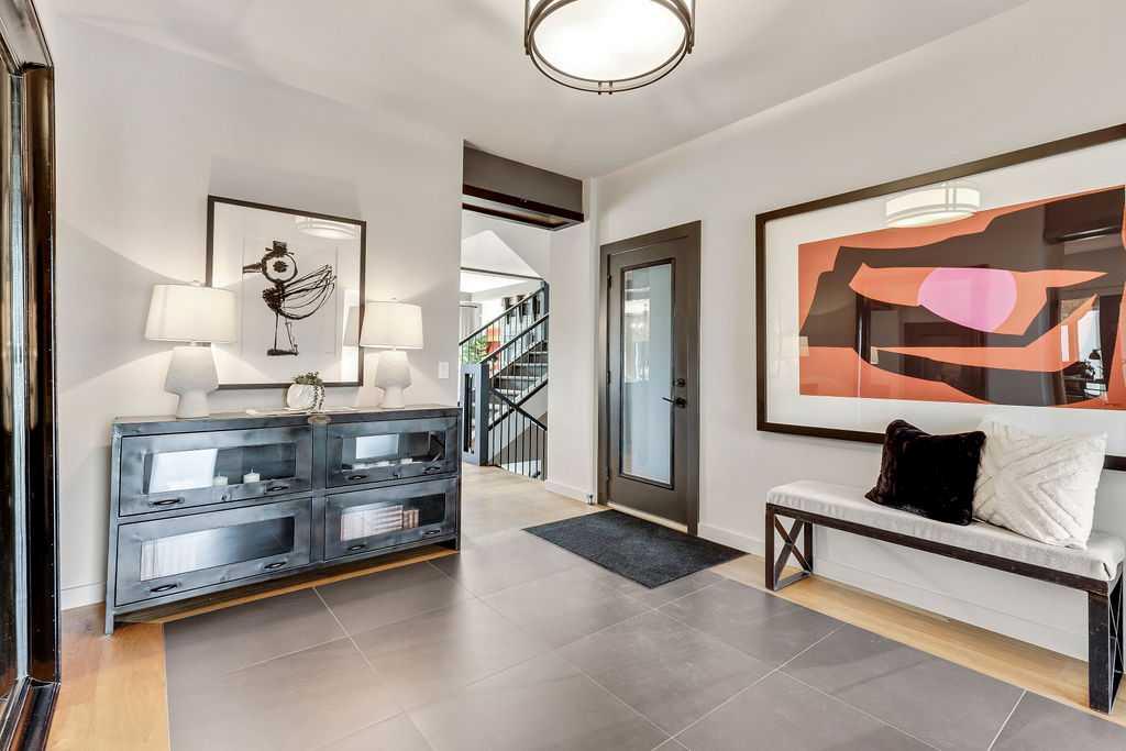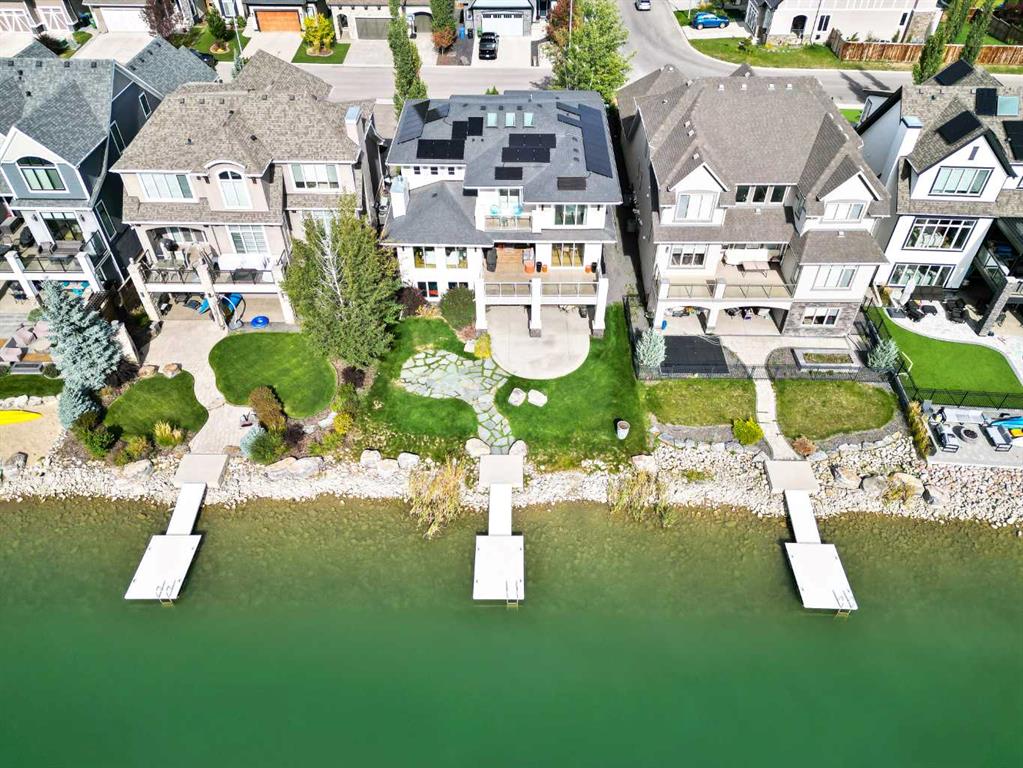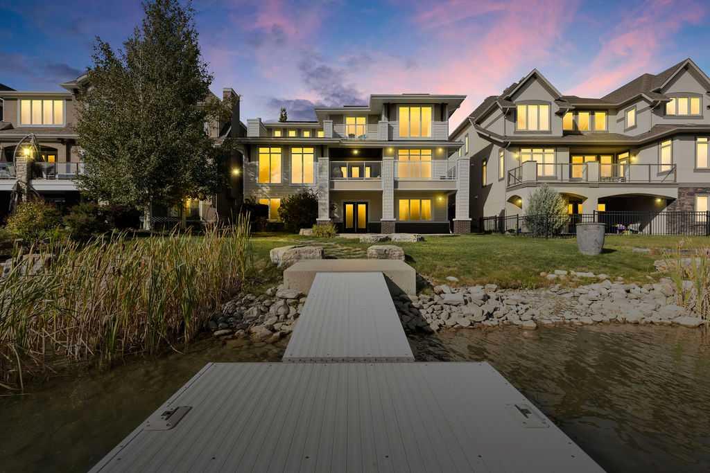 Welcome to this rare opportunity to own a breathtaking architectural masterpiece built by renowned Calbridge Homes on Calgary's largest lake community. This former lottery home was professionally designed and furnished not just to meet the needs of the modern family but to provide an absolutely elevated quality of life. This home is spacious, timeless, and unique. Be welcomed by stepping into the grand entryway that leads into the stunning open kitchen, living room and formal dining area. Expansive south facing windows and large partially covered deck provide the picturesque lakefront views. The kitchen with custom crafted cabinetry, upgraded stone countertops and top of the line appliances comes with an additional butlers pantry with wine storage and additional full secondary pantry. From family gatherings to all out events, entertaining of all kinds is a breeze. The main floor also offers an elevated office space, half bathroom and a large functional mudroom located off one of the 2 attached garages. The upper level continues to impress with a unique breezeway looking down into the kitchen and several skylights making it bright and welcoming. The luxurious primary suite is spectacular with a wall of windows, private sundeck the spectacular views of the lake and mountains. The ensuite bathroom offers a freestanding soaker tub, separate vanities, and large steam shower. The upper level consists of an additional 2 bedrooms with walk in closets, full bathroom, large laundry room with sink and storage and large bonus room that was originally planned to be a 4th bedroom. In the beautiful walkout lower level you will find a well-appointed theatre room featuring tiered cinema-style seating and even fresh popcorn from the popcorn machine! There is a full bathroom, wet-room to house all your water sports equipment and a fitness studio. A recent upgrade was made adding a solar panel system making the home even more energy efficient and utility bills significantly lower. Outside you will find exceptional outdoor areas throughout the property, but of course being lakeside with your own private dock is the true draw. Right across from Mahogany Island, this location is as exclusive as you can get. Imagine being able to swim, fish, skate, kayak, and paddle board right from your own backyard. Beautiful views of the water will have you feeling like you are on vacation every day. This home is the epitome of move-in readiness as the furniture, carefully chosen for this home, is included. Luxury only begins to describe the life you can have here.