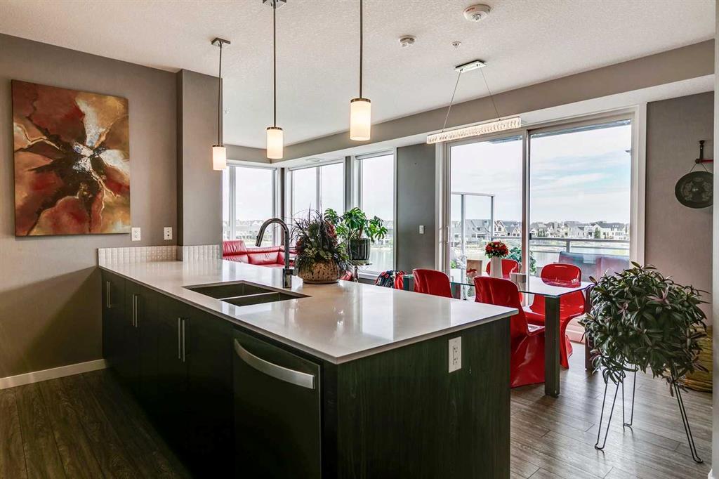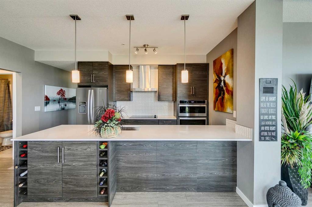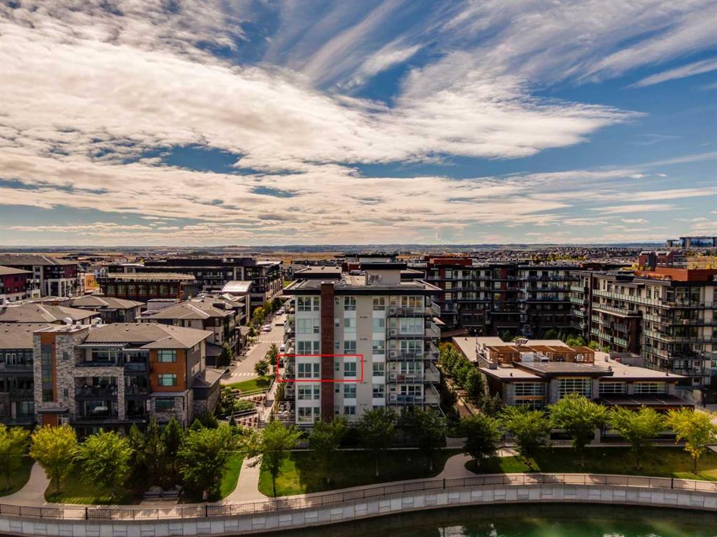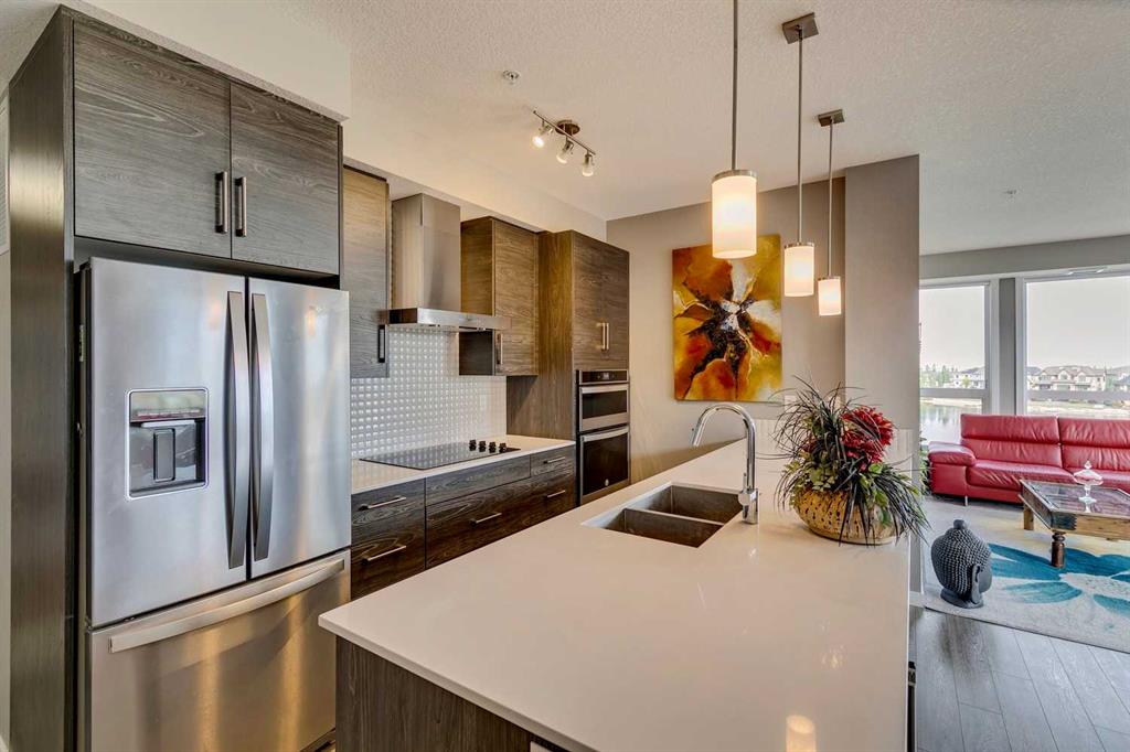 Mahogany - Calligraphy - Westman Village - #302, 11 Mahogany Circle SE. Welcome to this gorgeous, 2 bedroom, 2 bath unit on the 3rd floor of the Calligraphy building in Westman Village, Calgary’s one-of-a-kind lakefront residence. This 1,070 sq ft CORNER UNIT has a beautiful open floor plan and offers picturesque views from the kitchen and living room. The kitchen boasts a large center island with wine storage, and stainless steel appliances including an electric cooktop, chimney hood fan, refrigerator, dishwasher, built-in microwave, and a wall oven; the bright eating nook with sliding door access to the balcony is open to the living room. You will also find a spacious primary bedroom with stunning lake views, and a 3 pce ensuite with sliding glass shower; a 2nd bedroom, and a 4 pce main bath. This unit also includes an in-suite, stacked washer and dryer, A/C, 2 tilted underground parking stalls, and a storage locker. With over 40,000 sq ft of amenity space, Westman Village offers countless amenities including a fitness centre, wine room, indoor swimming pool & hot tub, games room, woodworking shop, movie theatre, indoor garden, library + so much more. Located in the popular lake community of Mahogany, this unit offers quick access to endless amenities such as Mahogany Beach Club, Chairman’s Steakhouse, Alvin’s Jazz Club and short commute to Stoney Trail, Deerfoot Trail (QE II), YMCA, and South Health Campus. This unit is move-in ready, call for more info today!