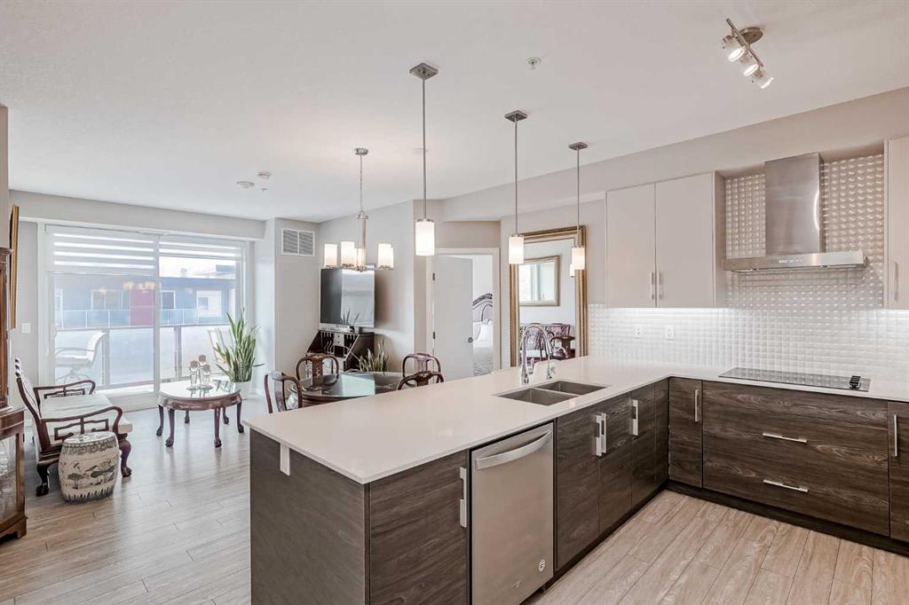 Welcome to luxury lakefront living at its finest! This stunning 2-bedroom, 2-bathroom condo in Westman Village, located in the coveted Mahogany community, has been enhanced with over $35,000 in custom upgrades to maximize convenience and style. With built-in closets, enhanced bathroom storage, a custom laundry room, and a striking upgraded kitchen backsplash, this home offers abundant storage and elevated design throughout. Step into the top-floor oasis and experience a modern, open-concept layout featuring a stylish, bright living area with 9-foot ceilings and luxury vinyl plank flooring. The living room flows seamlessly onto a 32-foot-long balcony—perfect for relaxing or entertaining while enjoying city and mountain views. Equipped with central air conditioning and a gas line for barbecuing, this condo makes every day feel like a retreat. The chef’s kitchen is a culinary dream, featuring upgraded stainless steel appliances, a stunning upgraded backsplash, a built-in wall oven, microwave, electric cooktop, chimney hood fan, and spacious quartz island—ideal for meal prep or hosting gatherings. The primary bedroom is a luxurious haven with built-in closet organizers and a spa-inspired ensuite bathroom. The second bedroom is equally spacious, designed to comfortably fit a queen-sized bed. With additional features like in-suite laundry, enhanced storage options, and a titled, heated underground parking space, convenience is at the forefront of this home’s design. But it doesn’t stop there—the Westman Village community offers an unparalleled lifestyle with access to the 40,000-square-foot Village Centre, brimming with amenities. Dive into two swimming pools, relax in the hot tub, stay active in the state-of-the-art fitness center, or enjoy time in the art studio, wine cellar, billiards room, movie theatre, or library. Additional conveniences include EV charging stations, car wash, dog wash, and more. Located steps from premier shopping, dining—including the exclusive Chairman’s Steakhouse—and vibrant entertainment at Alvin’s Jazz Club, this exceptional residence offers not only a prestigious address but also a walkable lifestyle in a resort-inspired community. Don’t miss the opportunity to make this luxurious home yours!
