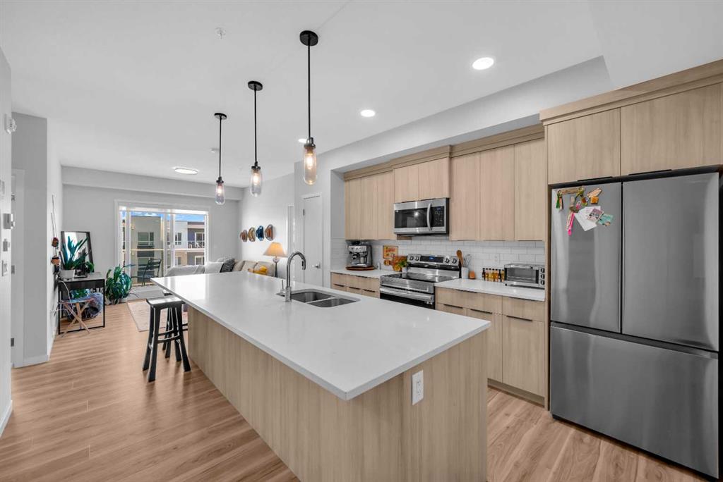 Welcome to unit #3409, 220 Seton Grove SE – a top-floor gem where modern luxury meets unbeatable convenience! Enjoy the peace and quiet of having no neighbors above, while taking in the stunning panoramic views that Seton has to offer. This 2-bedroom, 2-bathroom condo boasts sleek upgrades and a thoughtful design, maximizing every inch of its 852 sq. ft. of interior space (over 900 sq. ft. with the beautiful balcony included, offering a perfect outdoor retreat for you and your family). The unit also includes titled underground parking, perfect for those cold winter months, along with additional storage underground for all your extra belongings. The open-concept layout flows seamlessly, enhanced by premium LVP flooring, and flooded with natural light that creates a bright and welcoming atmosphere. The kitchen is a highlight, featuring stainless steel appliances, warm brown cabinetry that extends to the ceiling for easy cleaning and additional storage, and quartz countertops that beautifully balance the space. The sleek and modern design provides both functionality and elegance. The spacious primary bedroom comes complete with large windows, a walk-in closet, and a 4-piece ensuite that offers plenty of drawer space for all your essentials. The bright second bedroom also features a walk-in closet, making storage a breeze. This top-floor unit is located in the vibrant community of Seton, where you’ll have access to schools, grocery stores, Cineplex, and an LRT station all just steps away. Plus, you're close to commercial plazas and parks for endless convenience. Your underground parking ensures your vehicle stays safe and warm year-round. Don’t miss out on this incredible opportunity—call your favourite realtor today to book a showing for unit #3409 and experience the luxury and convenience it has to offer!