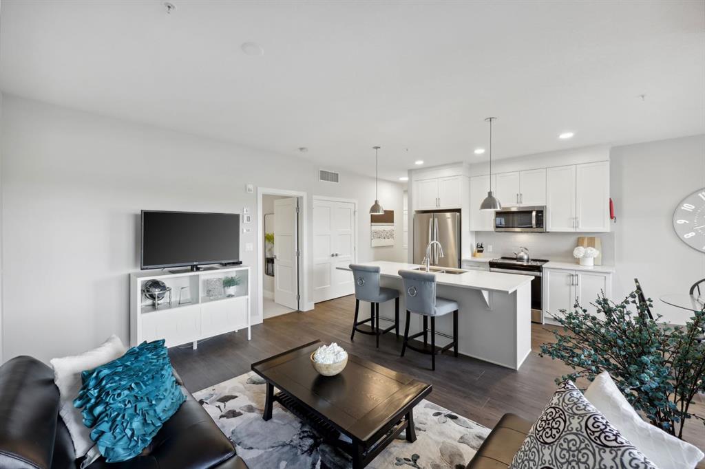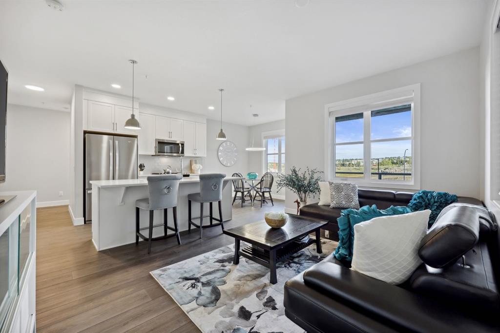 Located in the prestigious 85th & PARK community in Springbank Hill. This Aspen Park Condo is steps away from Shops, Amenities, Restaurants, Schools, and Transportation. Enjoy living beside an environmental reserve (Ravine) with exceptional Walking Paths and easy access to all the spectacular amenities this amazing location and Condo has to offer. Enjoy high end open concept living space, with an additional freedom of the wrap around balcony. Take in the calming colour palette that welcomes you to the beautiful kitchen island, that is surrounded by large windows. Stay cool with the CENTRAL A/C that keeps this unit comfortable for all seasons. This two bedroom unit has a huge Primary Suite with walk through closet and Large Ensuite. Guests and Family will enjoy the privacy of the location of the second very large bedroom, within steps of the 4 piece bathroom. This beautiful condo is with upgraded Carpet, LED lighting, and LVP flooring. Enjoy your Titled Parkade Parking with private storage, Bike Storage, and EV Charging. Safety features include ID tags for all entry points, video surveillance, and well lit parkade courtyard. Amazing Value for this LARGE Condo with, A/C on the 3rd floor, Steps away from all of the in amenities in Aspen Landing, and walking/riding Paths that lead into Rockyview County, in the desirable community of Springbank Hill.