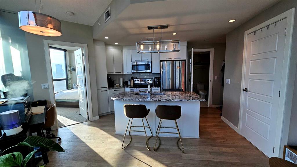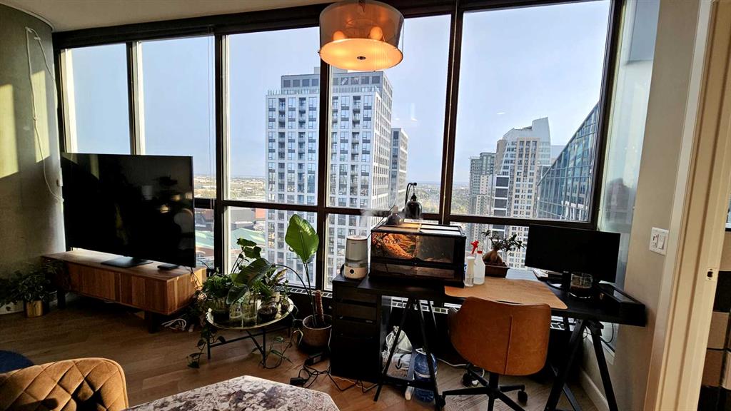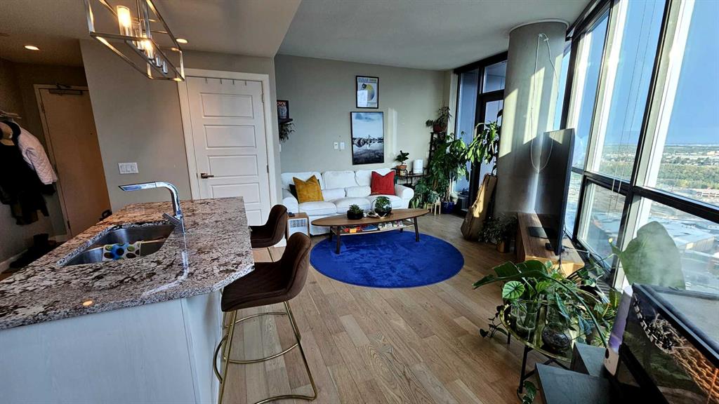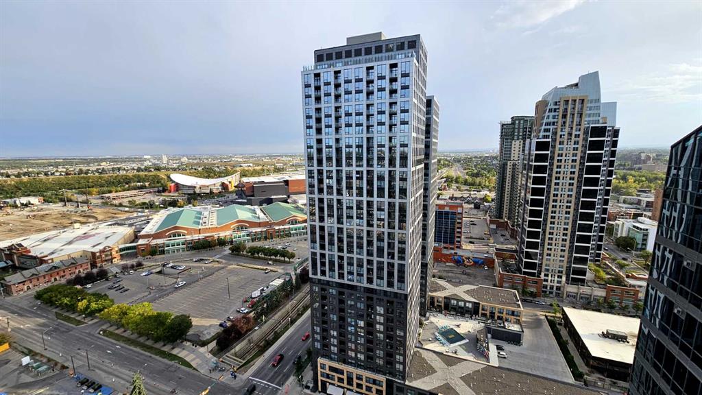 Public Remarks Welcome to this incredible sub-penthouse CORNER UNIT urban retreat offering breathtaking +180-degree views of the Rocky Mountains, Saddledome, and the state-of-the-art new BMO Center. Nestled in one of the city's most desirable locations, this condo boasts 9-foot floor-to-ceiling windows that flood the space with natural light, showcasing its spectacular surroundings. Newly installed hardwood and carpet in 2022, open-concept floor plan, granite countertops, soaker tub, stacked laundry in-suite. Amenities include an elaborate all in one fitness center. 1 titled underground parking.