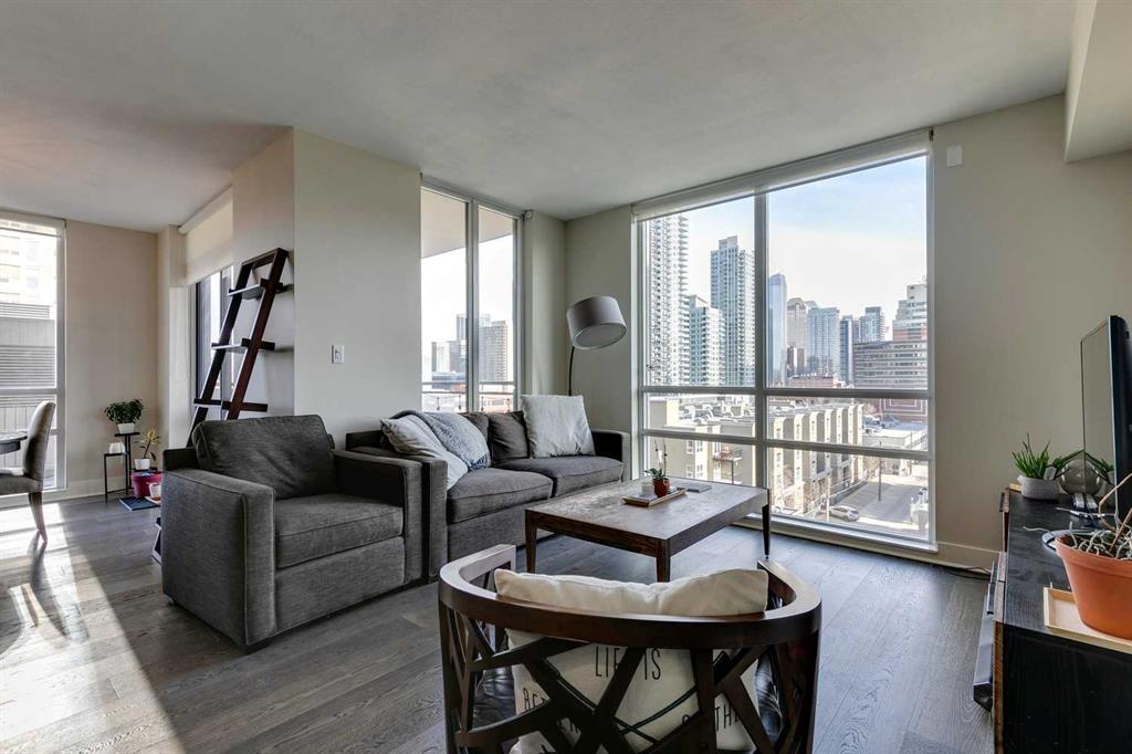 Welcome to Luna in the heart of Connaught! This stunning two-bedroom corner suite offers spectacular city skyline views and is just steps from the downtown core, river pathways, 17th Avenue, and all the vibrant amenities the Beltline has to offer. The spacious, executive condo features modern finishes and floor-to-ceiling windows that flood the space with natural light. The kitchen boasts quartz countertops, a top-of-the-line Fisher & Paykel stainless steel gas cooktop, a single convection wall oven and a large functional island—perfect for entertaining friends and family. Hardwood flooring upgrades add an extra touch of elegance to the main areas. The primary bedroom comfortably accommodates a king-sized bed and features ample closet space, while the luxurious 5-piece en-suite includes dual sinks, stylish under-mounted lighting, a separate shower, a soaking tub, and in-floor heating for added comfort. The second bedroom, located on the opposite side of the suite for extra privacy and is adjacent to a full bathroom with a shower. Step out onto the large covered balcony to enjoy your morning coffee while taking in the beautiful city views. Additional highlights include in-suite laundry, central A/C, and ample storage space. Amenities at Luna are exceptional, including two guest suites, an owners' lounge, a fitness center, a yoga studio, a steam room, a second-level Zen courtyard, guest parking, an outdoor terrace, a recreation room, and concierge services. This unit includes one underground titled parking stall. Don't miss this opportunity to experience luxury living in one of the city's most sought-after locations!