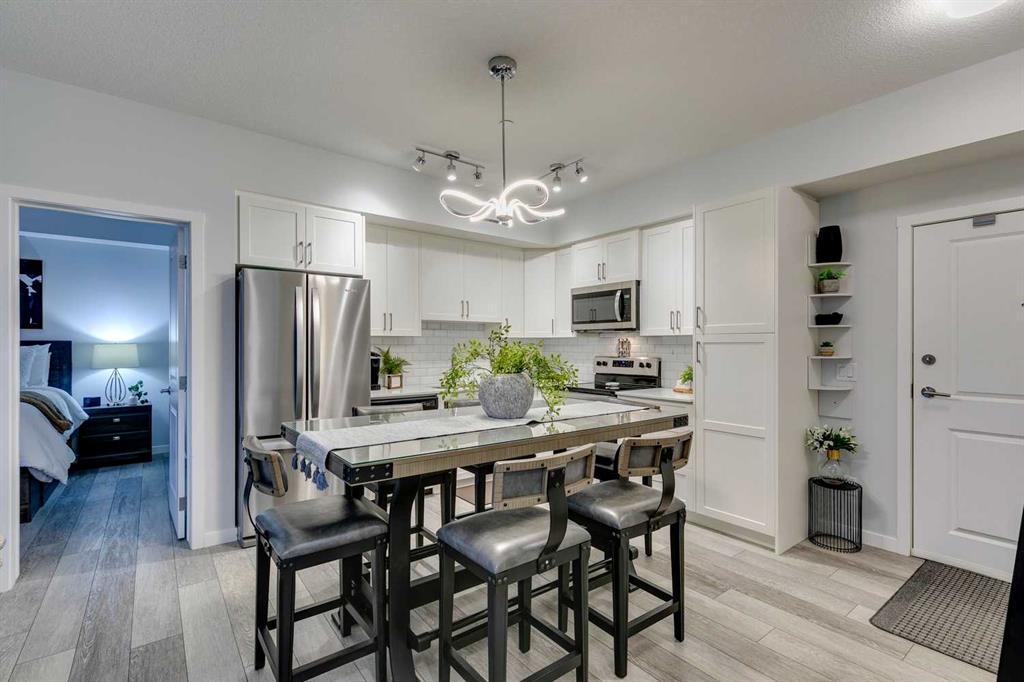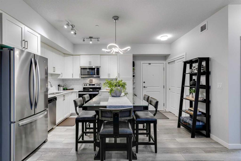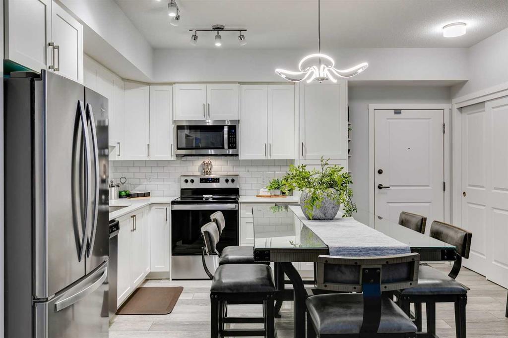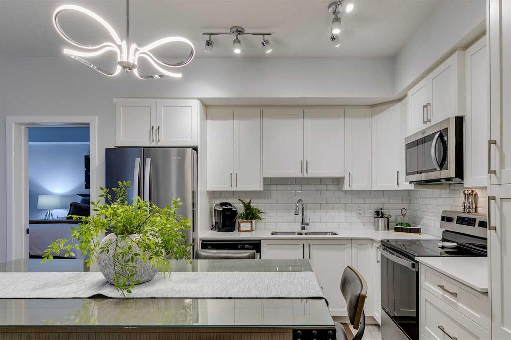 Public Remarks Modern design and stylish finishes create just what you have been looking in this extensively upgraded 2BR, 2BATH open concept condo…”The Mark 101” by Shane Homes. So much to offer here starting with the abundance of natural light the moment you walk in from the over-sized windows throughout. Open layout which is great for entertaining. The gourmet kitchen is beautifully crafted with loads of cabinetry, stone countertop, garburator, stainless appliances and a pantry too. The spacious primary with walk through closets leads you to your convenient 3-piece ensuite and the second bedroom is the perfect size for a guest room, home office or whatever you desire. The second bathroom and laundry complete this well-thought out design. Upgraded lighting throughout, A/C, Luxury Vinyl Plank and Ceramic Tile flooring, High Ceilings, Titled Underground Parking, Bike Storage and an assigned Storage Locker adds to your total comfort and convenience too! Ideally located in the popular family community of Sage Hill just a stone's throw to Sage Hill Crossing shopping/dining and steps to an extensive pathway system that wind throughout the community. This is your chance for turn-key condo living thats close to everything that matters. Have a look at the pictures then, call to book your appointment to view….but don’t delay or you will be sorry!.