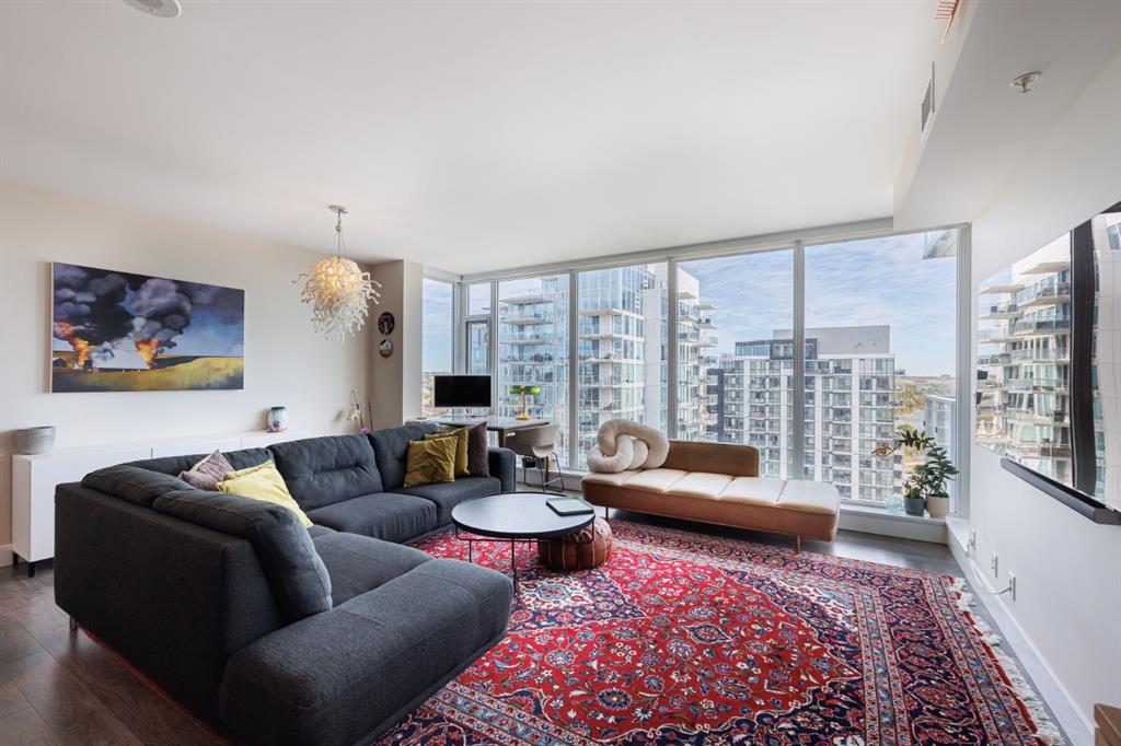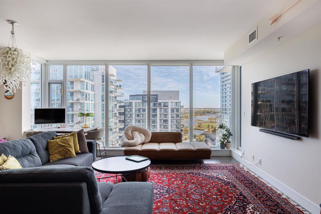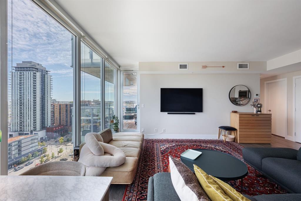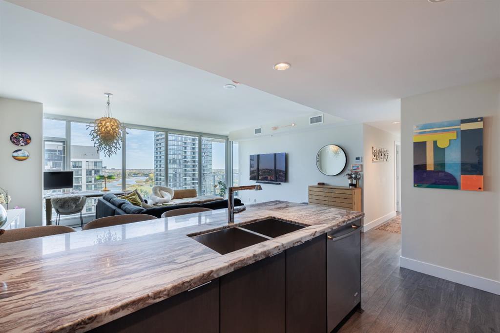 Welcome to luxury living at its finest in the heart of Downtown East Village. This exquisite 2-bedroom plus den, 2-bath condo in the prestigious Evolution building will impress you from the moment you step inside. Floor-to-ceiling windows offer breathtaking views of the river and mountains. The epitome of contemporary design, this unit features an open-concept layout that seamlessly integrates the living, dining, and kitchen areas. The gourmet kitchen is equipped with granite countertops, a gas stove, stainless steel appliances, and a convenient breakfast bar. The spacious primary suite leads to a luxurious 4-piece ensuite, complete with a separate shower, a granite-topped vanity, and plenty of storage. The den is thoughtfully designed with built-ins, providing ample workspace or additional storage. Additionally, the second bedroom offers generous closet space and is conveniently located near a 3-piece bath. Enjoy the comfort of heated floors in the bathrooms and in-suite laundry for added convenience. The private east-facing balcony, complete with a BBQ gas line and upgraded deck tiles, is perfect for entertaining or enjoying peaceful mornings. The unit also includes underground parking with a single parking stall, a storage locker, and access to bike storage. Building amenities are top-tier, featuring two state-of-the-art gyms, a sauna, steam room, party room, rooftop patio with two BBQ stations, and central air conditioning for added comfort. You'll also benefit from 24-hour security and concierge service. Nestled in a vibrant community, you'll be close to all amenities, including shopping, dining, entertainment, and public transportation. With direct access to the beautiful Bow River Pathway, perfect for walking, jogging, cycling, and enjoying scenic river views, this condo offers an unparalleled living experience. Don't miss the opportunity to make this exquisite property your new home.
