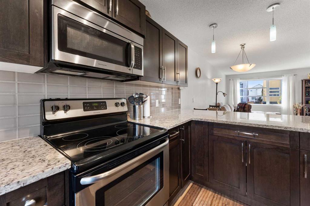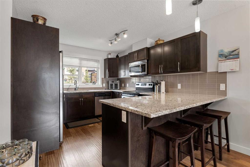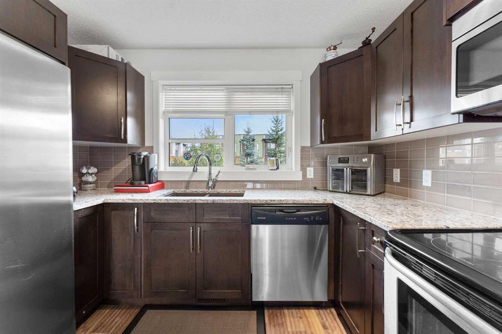 Welcome to your contemporary townhouse at trendy Coventry Station! This immaculate home features a bright and open design, highlighted by large windows that fill the space with natural light. Enjoy the elegant "hand-scraped" engineered hardwood floors throughout the main level, paired with stunning granite countertops in both the kitchen and bathrooms. The deep, rich-colored kitchen cabinets and stainless steel appliances create a stylish culinary space. Step out onto the gorgeous deck off the kitchen, which overlooks the serene courtyard green space and provides direct access via stairs. High-end finishes are tastefully incorporated throughout the home, adding a touch of luxury. Upstairs, you'll find a spacious master bedroom complete with a 3-piece en-suite and a walk-in closet, along with a second bedroom that also features a walk-in closet and a separate 4-piece bath. For your convenience, the upper level includes laundry facilities and an additional closet. This townhouse also offers a single attached garage and a versatile extra room that can serve as a den, home office, or additional storage. Situated in an outstanding location with easy access to Deerfoot and Stoney Trails, you’ll enjoy a variety of nearby shopping options. Just move in and enjoy! Don’t miss your chance to see this beautiful home—schedule your viewing today!