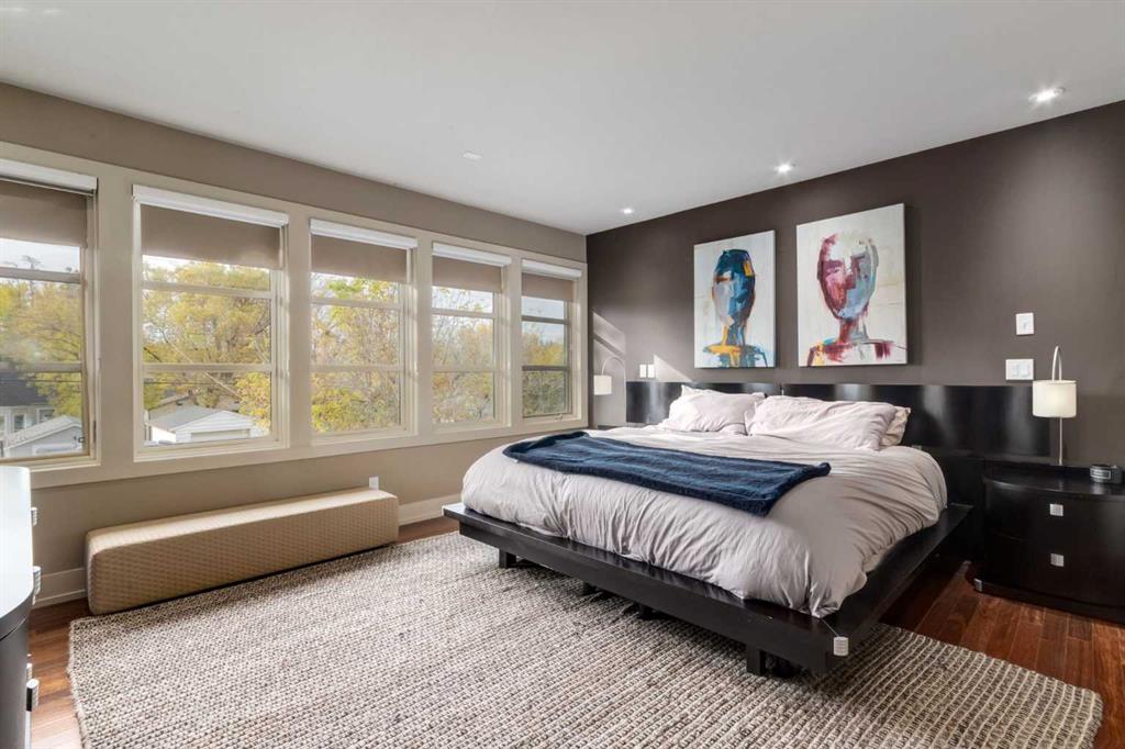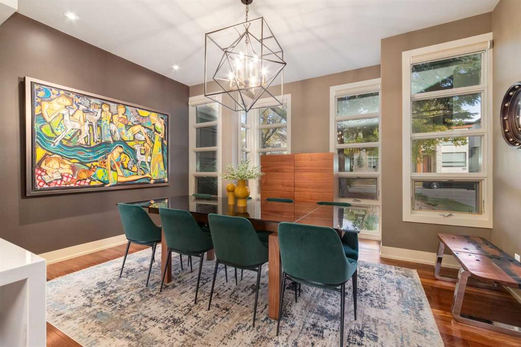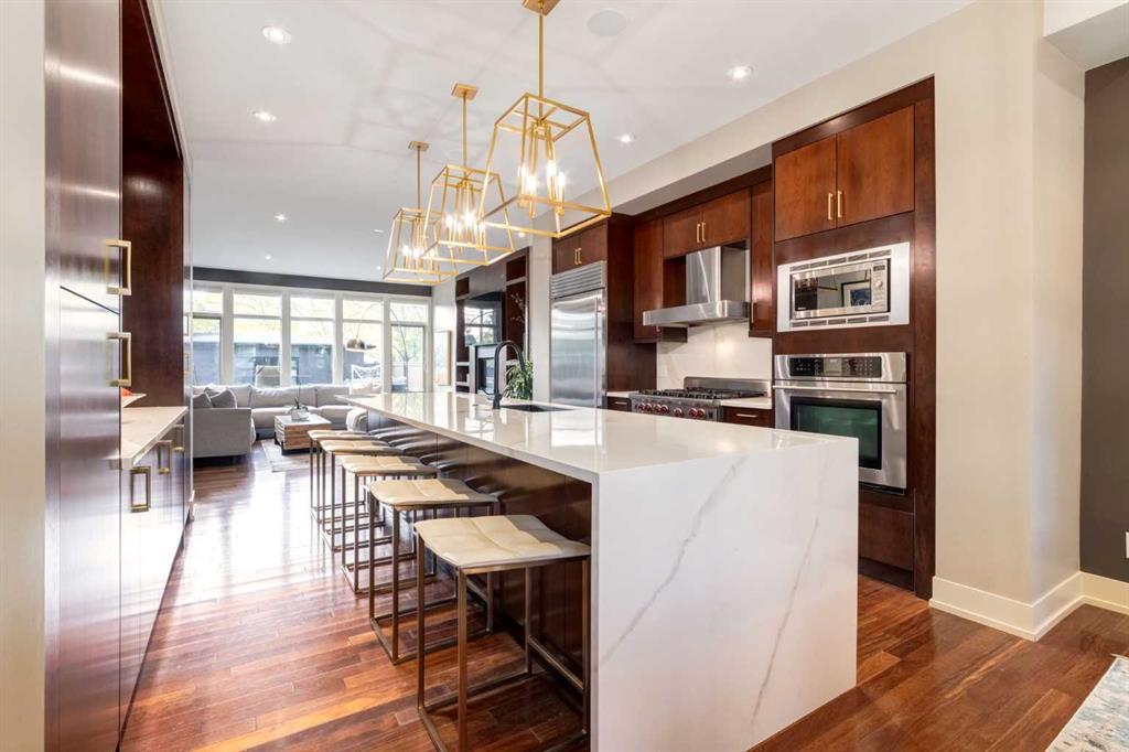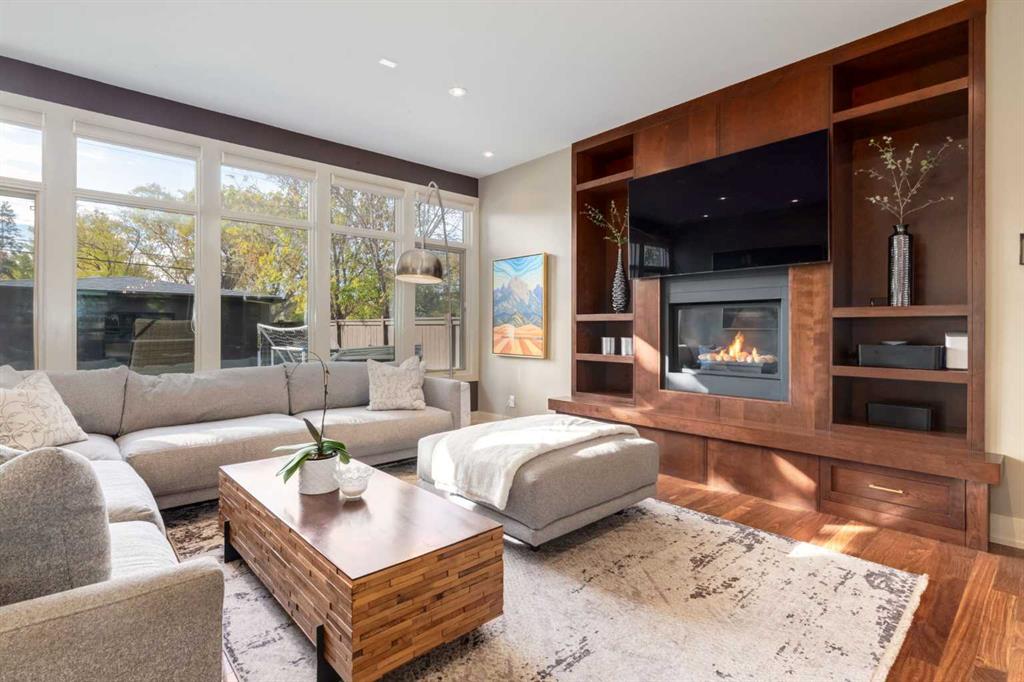 This modern masterpiece offers stunning curb appeal, enhanced by mature trees, professional landscaping, and aggregate concrete leading to the formal entrance. Inside, a formal den with a built-in bookshelf sets a refined tone. The open-concept great room features a striking dining area adorned with custom light fixtures and ample windows, seamlessly connecting to the chef’s kitchen, which features a sizeable sit-at island, coffee bar, 6-burner Wolf stove, Sub-Zero refrigerator, wall oven, and built-in microwave. The family room, with a gas fireplace and large windows, overlooks the sunny south-facing yard. Step through the patio doors to discover two-tiered patios, with the lower one featuring a double-sided gas fireplace adjacent to the formal living/piano room—ideal for entertaining and family fun. A custom open-riser staircase, topped with four skylights, leads to the upper level. You’ll find three spacious bedrooms and a well-equipped laundry room with a sink and folding table. The children’s bedrooms include walk-in closets and share a 5-piece Jack-and-Jill bathroom with dual sinks, separated from the bath for added convenience. The primary bedroom is a true retreat, featuring an electric fireplace, two separate walk-in closets, and a luxurious 7-piece ensuite with in-floor heat, a steam shower and a soaker tub. The finished basement with in-floor heat is equally impressive, offering a gas fireplace in the games room, a fourth bedroom, and a 5-piece bathroom with a sizeable post-workout shower. An exquisite wine room behind the wet bar provides space to store and display your prized collection. The theatre room and a gym complete this perfect entertainment space. This neighbourhood offers parks, playgrounds, a multi-sport community centre, and diverse eateries, all within walking distance. This is a gem with its elegant finishes and abundant local amenities.