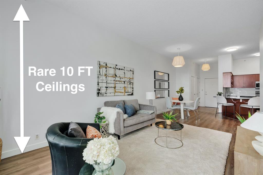 This stunning 2-bedroom, 2-full-bath Dover unit is a true testament to pride of ownership, featuring thoughtful updates and an open-concept living space with Rare 10-foot ceilings that create a spacious, airy atmosphere. With brand-new LVP flooring, stainless steel appliances, and fresh paint, this modern residence is the urban haven you’ll love coming home to. The energy-efficient building boasts large south-facing windows that flood the rooms with natural light. Cooking enthusiasts will appreciate the well-appointed kitchen, equipped with rich cabinetry for ample storage, a new subway tile backsplash, and a large granite island perfect for meal prep or casual dining. The breakfast bar peninsula seamlessly connects the kitchen to the dining and living areas, making entertaining a breeze. Step out onto the balcony, where a gas line makes barbecuing easy, all while enjoying sunny southern views. The spacious dining area is ideal for intimate dinners or larger gatherings, and the generous living room provides ample space for your furniture, creating a versatile environment for relaxation or hosting guests. Retreat to the primary bedroom, complete with recessed lighting, a large closet, and a luxurious 4-piece ensuite. A second spacious bedroom with ample closet space is located down the hall, along with the convenience of in-suite laundry that simplifies everyday chores. The elegantly finished 4-piece bathroom features a granite counter and dedicated storage area ensures your living space remains organized and clutter-free. This unit is move-in ready, allowing you to settle in and enjoy immediately. For added convenience, the condo includes one unassigned heated indoor parking stall and bike storage on the main level of the parkade. Building amenities cater to a modern lifestyle, featuring a dedicated concierge service from Monday to Friday, 24-hour security, and three high-speed elevators for easy access. Relax in the sunroom terrace on the 17th floor, where you can unwind and take in panoramic views. The prime location offers unbeatable convenience, with direct parkade access to Save-On-Foods, Tim Hortons, and the "Shops at Heritage" right next door. The Heritage LRT Station is just across the street, providing quick and easy transit access.For outdoor enthusiasts, nearby bike trails, Glenmore Reservoir, Fish Creek Park, and numerous green spaces offer endless recreation options. Major shopping centers like Walmart, Chinook Centre, and South Centre are only minutes away, along with a variety of restaurants, pubs, and amenities that make this location truly exceptional. Don't miss your chance to experience this incredible property!