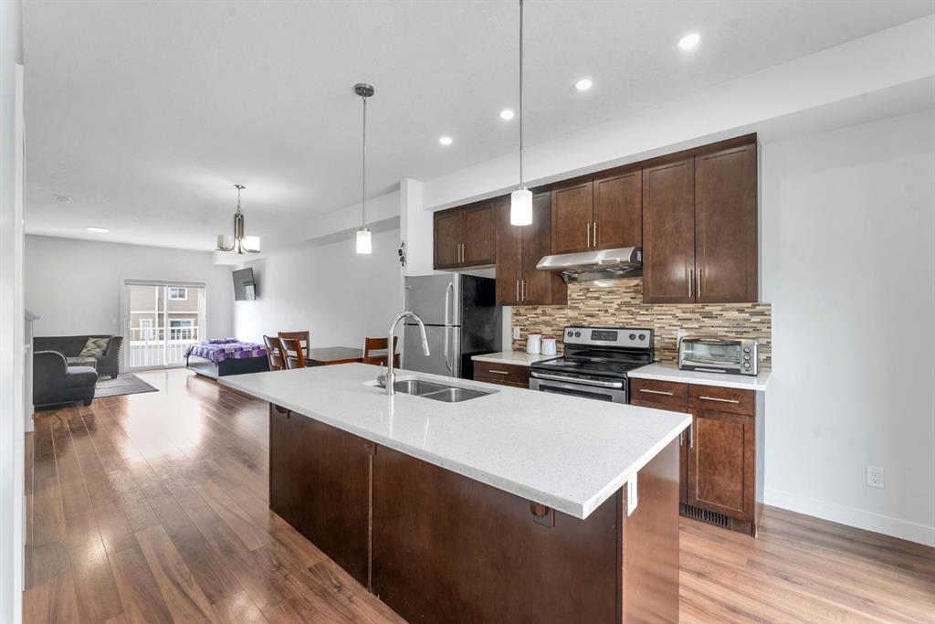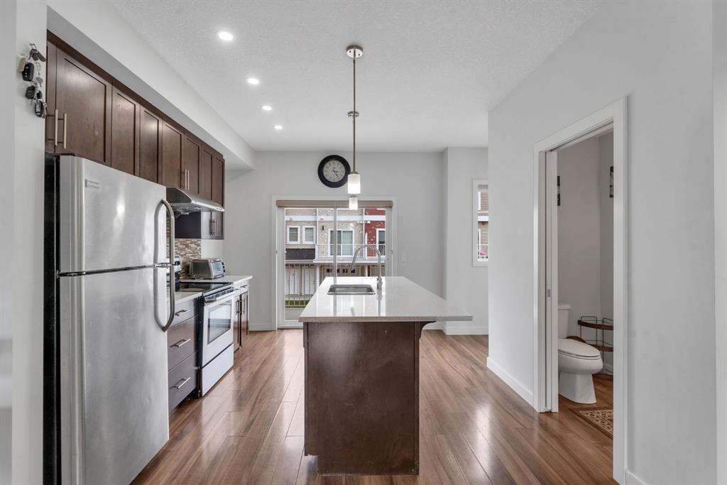 Come and discover this Immaculate 3 Bedroom, 2.5 bath Townhome nestled in the highly sought-after community of Redstone. This beautiful home features a double tandem garage, providing ample amount of parking and storage space. The main floor boasts an open floor concept, a spacious living area and dining area, with a convenient 2 piece washroom on the main floor. The kitchen is a chef's delight with quartz countertops, stainless steel appliances and elegant cabinetry. Upstairs, the primary bedroom is generously sized with its own ensuite offering the highest level of comfort and convenience. This large, inviting bathroom are your private retreats, meticulously designed with modern finishes that exude a sense of calm and relaxation. The laundry area is conveniently located within the unit, making household chores a breeze. There are numerous big size windows in the entire house offering ample amount of natural sunlight. Just steps away from the bus stop this property is one of the most desirable location for easy transit access. Proximity to Future School Site, a perfect choice for families planning for the future. This home is perfect for those seeking both style, comfort, and convenience. Most recent work done - NEW PAINT, NEW RUG, NEW POD Lights in entire house. With its prime location and desirable features, properties like this don't stay on the market for long. Located close to shopping malls, and just 10 minutes from the Airport, Cross Iron Mills, and minutes away from Stoney Trail. This home offers both luxury and convenience in a sought-after neighbourhood. Call you favourite realtor to book a private tour!
