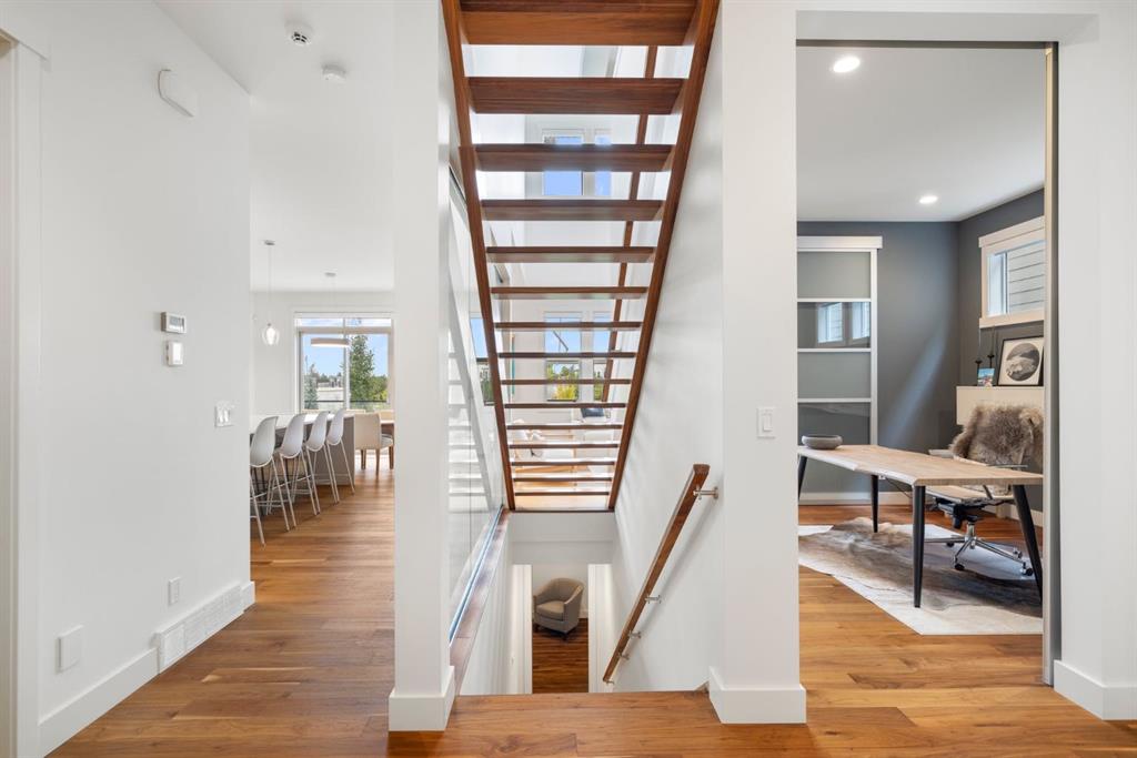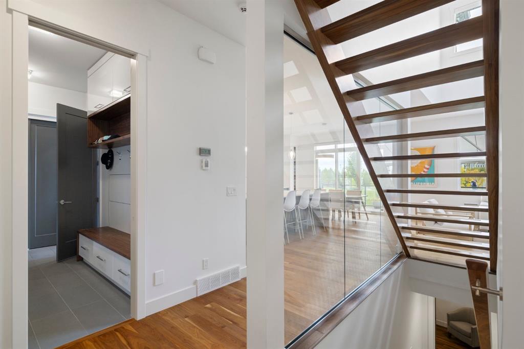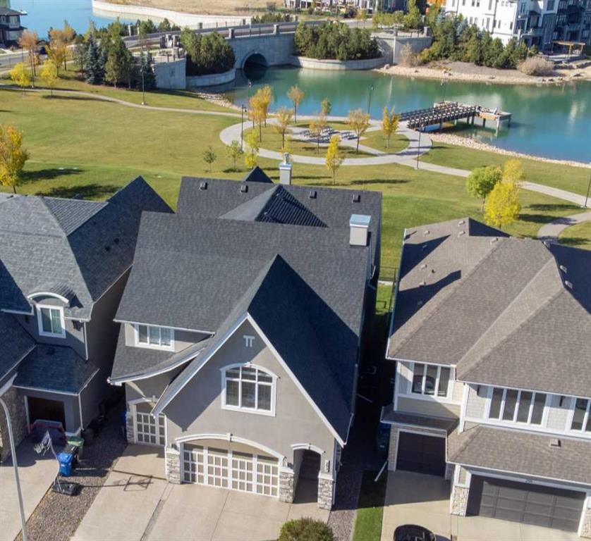 Welcome to your own slice of paradise on Mahogany Lake. A stunning mid-century modern lakefront home presents mountain views with unparalleled blend of luxury & tranquility awaits. Your new home offers a perfect retreat for those craving elegance, nature & resort living within the city that includes year round activities for everyone to love. From the moment you walk through your private grand entrance & step into a light-filled open living area with soaring 10’ and 19’ ceilings you will appreciate the premium finishes that are unique to this modern design. The gourmet chef’s kitchen is a culinary enthusiast’s dream. Adorned with high gloss cabinetry, beautiful appliances, herring bone tile, built-in wine racks & show stopping over-sized quartz waterfall island, THIS is where memories are made! Flowing through the open concept main level you will find a living room with an open ceiling to above complete with fireplace and floor to ceiling windows. A walk-through executive office with modern sliding doors, a powder room, large walk-in coat closet, massive back mudroom/entryway & plenty of stylish built in storage throughout round out this floor. Heading up the beautiful open riser staircase, the upper level presents a large bonus room overlooking the main level living space that includes a coffee station equipped with beverage fridge & granite countertop. The principal bedroom is nothing short of a luxurious sanctuary. Impeccable flow & updated lighting, a cathedral ceiling in the bedroom encompasses your perfect retreat to cozy up in front of a designer gas fireplace & spectacular lake/Rocky Mountain views. Spa-like ensuite includes large jetted shower, stand-alone soaker tub & dual vanities that takes you into the MUST SEE walk-in closet with its glamorous glass display units and built in storage for all your favourite fashion. Walking through the upper level, you will find two additional generously-sized bedrooms, main bathroom with double sinks & laundry room. Wired-in speakers are found in the bonus room, principal bathroom and walk-in closet. The fully finished basement offers plenty of natural light, with an additional bedroom, 4-piece bathroom, a rec/family room, gym area with mirrored walls & extra storage space. With lake access directly from your back yard & breathtaking west (sunset) views, you can easily relax, enjoy, & bring entertaining from the dining & living room out through sliding patio doors onto an oversized deck newly upgraded with composite boards, motorized retractable awning and gas BBQ outlet. Lake living is highlighted by unlimited outdoor activities including outdoor lounging, beach days, SUP, kayaking, fishing & volleyball in the summer & endless skating pathways to explore in winter. Upgrades/updates include a finished & insulated TRIPLE garage, keyless entry, central A/C, upgraded lighting throughout, app controlled stair lighting, remote controlled Hunter Douglas blinds. Don’t miss out on this rare opportunity - call today!