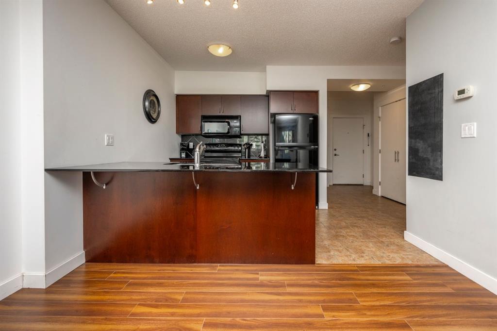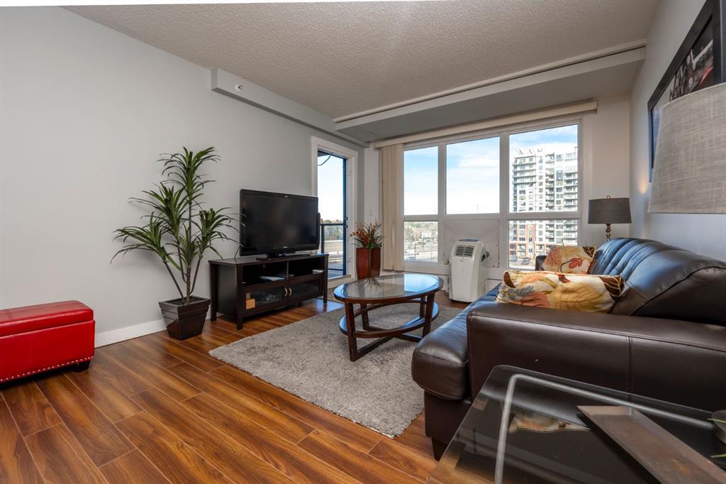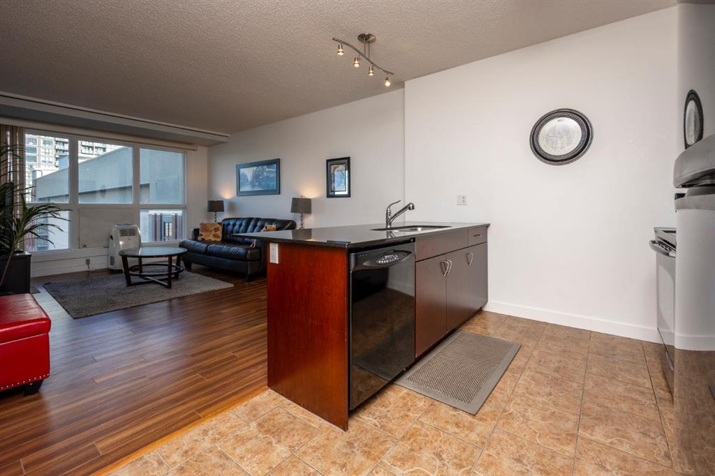 This bright and affordable 717Sqf, 5th floor, North facing, one-bedroom + den, one bathroom is perfect for the first time buyer or investor. Unit has plenty of natural light from its large windows. The kitchen has granite countertops which can be utilized as a breakfast bar, ample cabinet space, black appliances with tiled floor. The spacious living and dining area opens onto a private balcony with a gas BBQ hookup. The den is suitable for many applications, office, pull out couch etc. The good sized 4-piece bathroom, in-suite laundry within storage room are convenient and practical. One heated common parking stall is included, additional stalls can be rented by the building management if required. Plenty of visitor parking utilizing online registration system. The building amenities include roof top patio & sunroom on the 17th floor with panoramic views of the Rocky Mountains and the city. Property location is ideally situated in the heart of the SW (Haysboro) steps away from the Heritage LRT station for convenient quick commutes downtown etc. Numerous shops, services, restaurants, parks are also just outside your door. Convenience of direct walking access into the Save on Foods through the building parkade increasing rental desirability. Utilities are dealt with through Westcorp (building management) and paid directly to them within a bundled package helping to keep costs reasonable for owners. Book you showing today, property is priced to move.