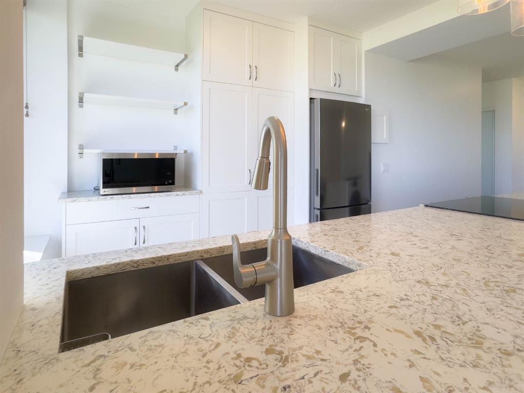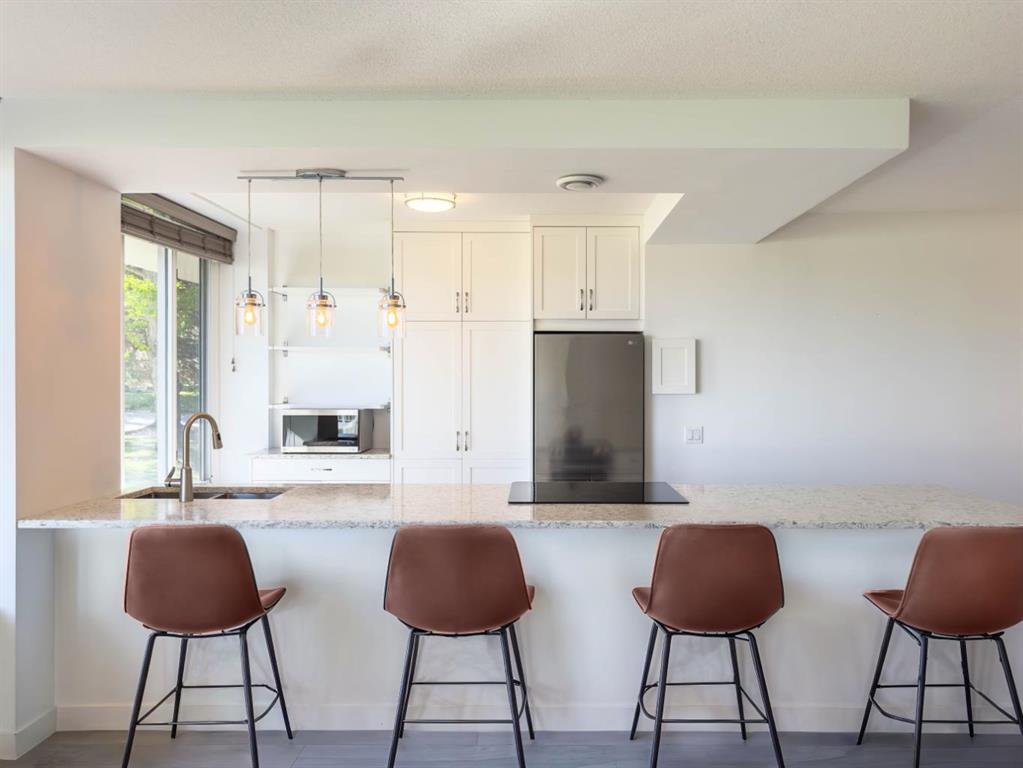 Welcome to the serene and meticulously maintained Rideau Towers. This main floor unit underwent a complete renovation in 2018 and is still in amazing condition. The generously sized one-bedroom, one-bathroom unit is bright and open, featuring an updated kitchen with stainless steel appliances and a stunning quartz countertop that adds a modern touch to the space. The massive countertop island creates a perfect spot for entertaining friends. Large south-facing windows flood the space with natural light, overlooking a private green space. Rideau Towers is an inner-city oasis, surrounded by parks and situated just above the Elbow River. An outdoor pool is there to enjoy in the summer. Parking and storage are included. The unit also boasts high-quality laminate flooring that was replaced within the past year. Located just minutes from the grocery stores, restaurants, and shops of 4th Street and 17th Ave, this is an opportunity you don’t want to miss.