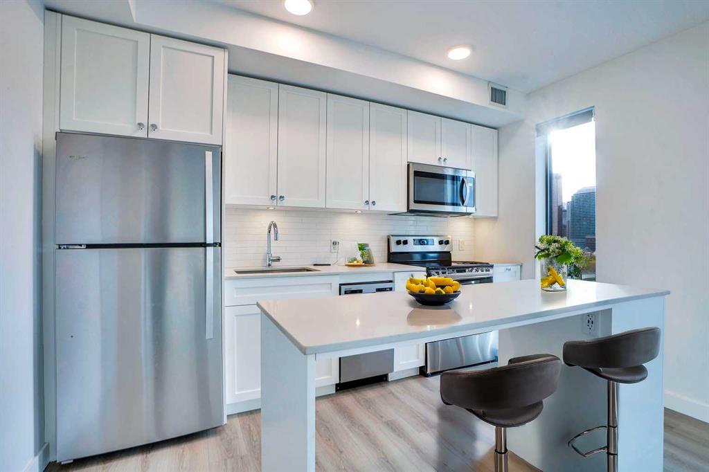 This stunning unit condo, nestled between Bridgeland and Crescent Heights, offers a fantastic opportunity for downtown Calgary living or short-term rental investment with great Airbnb potential! Developed by Minto Communities, this 1-bedroom, 1-bathroom unit seamlessly blends modern comfort with the ultimate in urban convenience. Step into a bright, open-concept space filled with natural light, thanks to its South-facing balcony. The kitchen features a sleek design with quartz countertops, stainless steel appliances, a large island with seating, and the convenience of in-suite laundry This building is equipped with advanced smart security, featuring facial recognition, video calling, and package locker integration, giving you peace of mind and ease of access. The resident engagement system keeps you connected to your neighbors and virtual concierge services. Plus, enjoy a spectacular rooftop patio with firepits, barbecues, and uninterrupted views of the downtown skyline—perfect for hosting friends. There's also an indoor workspace for your professional needs. Location is everything here! You’ll be just steps from shops, parks, playgrounds, the scenic river pathways, and the Bridgeland LRT station, with downtown Calgary just minutes away. Whether you’re seeking a prime investment property or a vibrant place to call home, this condo offers the best of both worlds in one of Calgary’s most desirable neighborhoods. Don't miss this incredible opportunity! Book your private viewing today to checkout the condo and views.