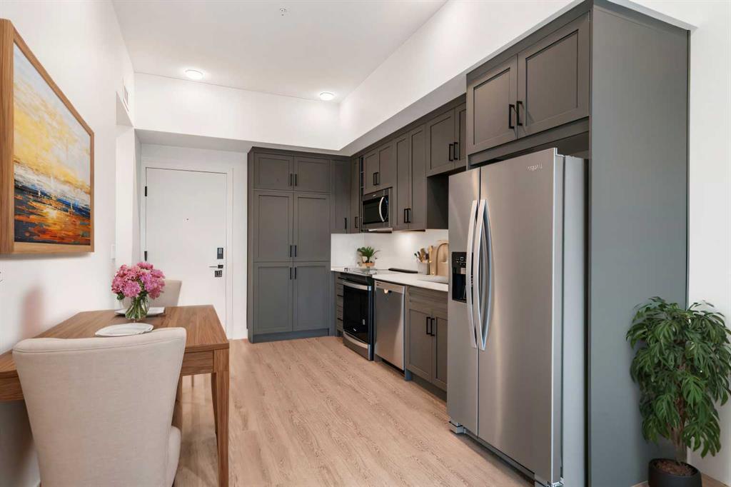 Public Remarks Experience urban living at its finest in this charming top-floor 1-bedroom, 1-bathroom condo in the heart of the University District. This modern condo features 10-foot ceilings and sleek vinyl plank flooring throughout, creating an open and airy atmosphere. Enjoy the well-appointed kitchen with modern appliances, in-suite laundry, and a contemporary bathroom with a stand-up shower. Benefit from the added convenience of a designated underground parking stall for secure, weather-protected parking with direct access to the building. The building also offers an on-site gym just down the hall from the unit and additional storage on the same floor. With no one above you, you can enjoy extra peace and privacy. In addition, just a few steps away, there is a Save on Foods, McDonald’s, movie theater, various restaurants and many more amenities. This prime location is minutes away from the University of Calgary, Market Mall, and the Foothills and Children’s hospital. Don’t miss your chance to live in this vibrant and convenient location!