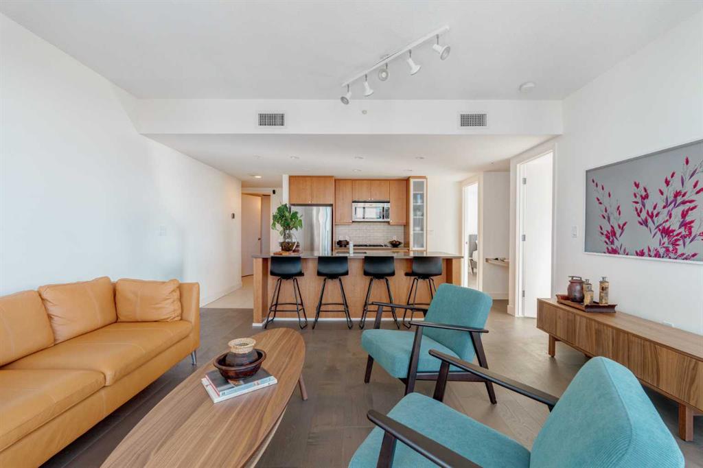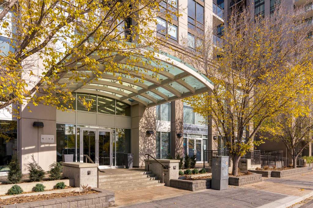Boasting spectacular views, this 2 bedroom 2 bathroom SW facing corner unit located in the desirable NOVA building in the heart of Calgary's Beltline will not disappoint! Ceiling to floor double glazed windows frame a spectacular 4-season view of the city, Mount Royal and mountain views to the west! Each unit in this building has its own individually controlled heating and air conditioning system. The owner has recently installed a entire suite humidifier and an Ecobee "Smart" thermostat which can be controlled remotely or on-site to ensure a comfortable temperature and humidity level in the unit at all times. The kitchen, living room and bedroom has also recently had 3/4" Premium Vintage hardwood engineered flooring with a 7" wide plank installed giving the space a luxurious and sophisticated feel. The 9 foot ceilings throughout enhance the spaciousness and superb layout that this unit offers. The primary bedroom is laid out perfectly for a king size bed and night stands opening onto a double sided walkthrough closet . There is a private four piece bathroom wth tub and shower which completes the suite. The 2nd bedroom is a good size and is a great second bedroom or office/den with corner windows reinforcing the spectacular panoramic views. The kitchen features a top end stainless appliance package with a gas cooktop, Fisher & Paykel refrigerator & oven and a Bosch stainless dishwasher. The large kitchen island with quartz countertops and sink overlooks the living room and has bar seating for four , making a dining room table optional. A built in desk/niche area is a great workspace with shelving above for additional storage and display possibilities. A second 3 piece bathroom with oversized glassed shower is a great guest or family bathroom. A large storage/laundry room with brand new LG full size appliances completes the unit. The NOVA building offers so much to it's residents that adds huge value! The unit comes with one titled parking stall situated the the heated underground secured parking area with loads of visitor parking and a separate caged storage unit. Building amenities include a fully equipped fitness centre with stream room, private showers and change rooms. Enjoy the lounge area when you are entertaining friends which has a bar, feature fireplace, pool table, & comfortable seating/gathering brining friends together. Two fully furnished guest suites make it easy for you to host family and friends. 24 hour concierge service and full time security make this an awesome building for those who want a little more safety and lock and leave ease. Pets are also permitted with board approval . With a walk score of 98 ( Walker's Paradise), a transit score of 86 (Excellent Transit) and a bike score of 92 (Biker's Paradise), this is a unit that not should be overlooked.