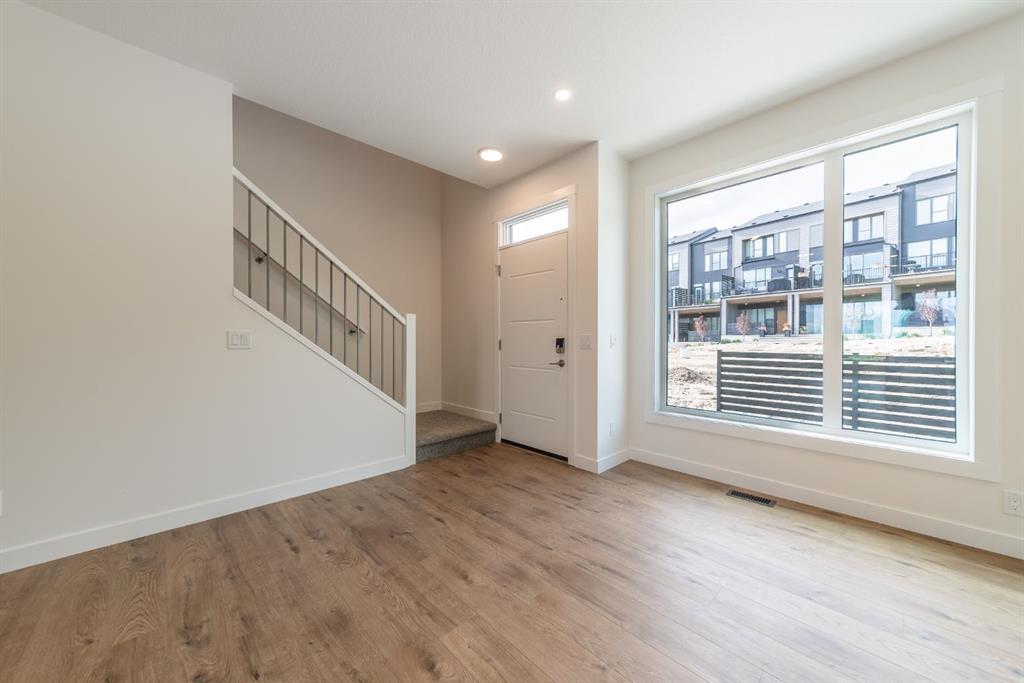 This brand-new home is ready for IMMEDIATE POSSESSION, featuring 3 bedrooms, 2.5 bathrooms, an office/flex space, a double attached garage, and two outdoor living areas, including an impressive 300-square-foot rooftop patio! The ‘Rouge’ is an urban townhome at Crown Park, offering nearly 2,200 square feet of interior living space and almost 500 square feet of outdoor space. The open-concept main living area is thoughtfully designed with a spacious layout, showcasing 9' ceilings and oversized windows that flood the home with natural light from morning to night. At the center of this home is the gourmet kitchen, perfectly positioned between the dining area and the main living room, making it an ideal space for entertaining. It features a gas cooktop, built-in microwave and oven, range hood, a large quartz island with seating, and elegant design details throughout. A generous west-facing ground-level patio stretches across the home, overlooking the central courtyard, with direct access from the main living area. Upstairs, the expansive primary bedroom includes a walk-in closet and a full ensuite with dual sinks and a walk-in shower with tile surround. Two additional well-sized bedrooms, a laundry area, and a full bathroom complete the second level. The 17' x 18' rooftop patio offers breathtaking views with east and west exposure, perfect for soaking up the sun year-round. The lower level features a welcoming foyer with storage and an office/flex room, ideal for a home office, media room, or gym. The private double attached garage ensures your vehicles and valuables stay safe and warm throughout the year. Additional upgrades include A/C rough-in, natural gas lines for BBQs on both patios, and a comprehensive 3-year extended workmanship warranty program. This stunning property provides all the conveniences of downtown living without the congestion. Located just minutes from downtown Calgary, Crown Park offers a unique opportunity to own a beautiful, brand-new home in a picturesque setting.