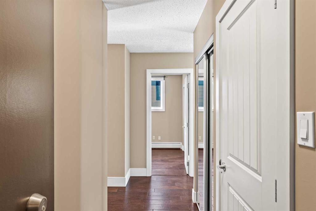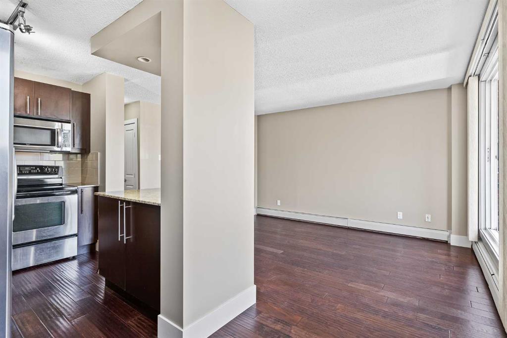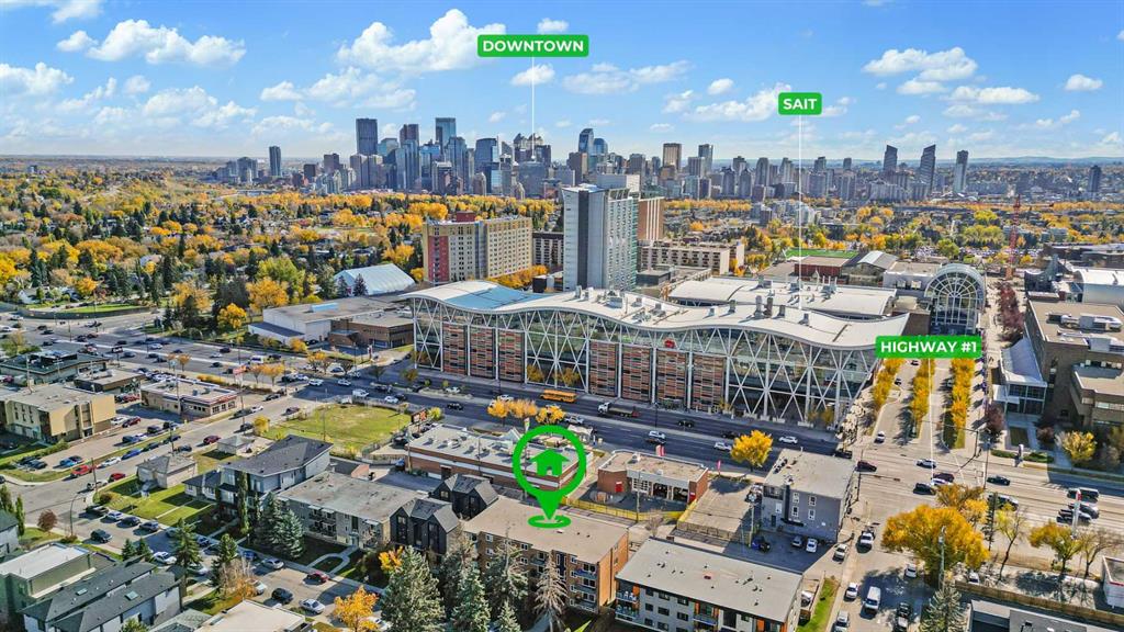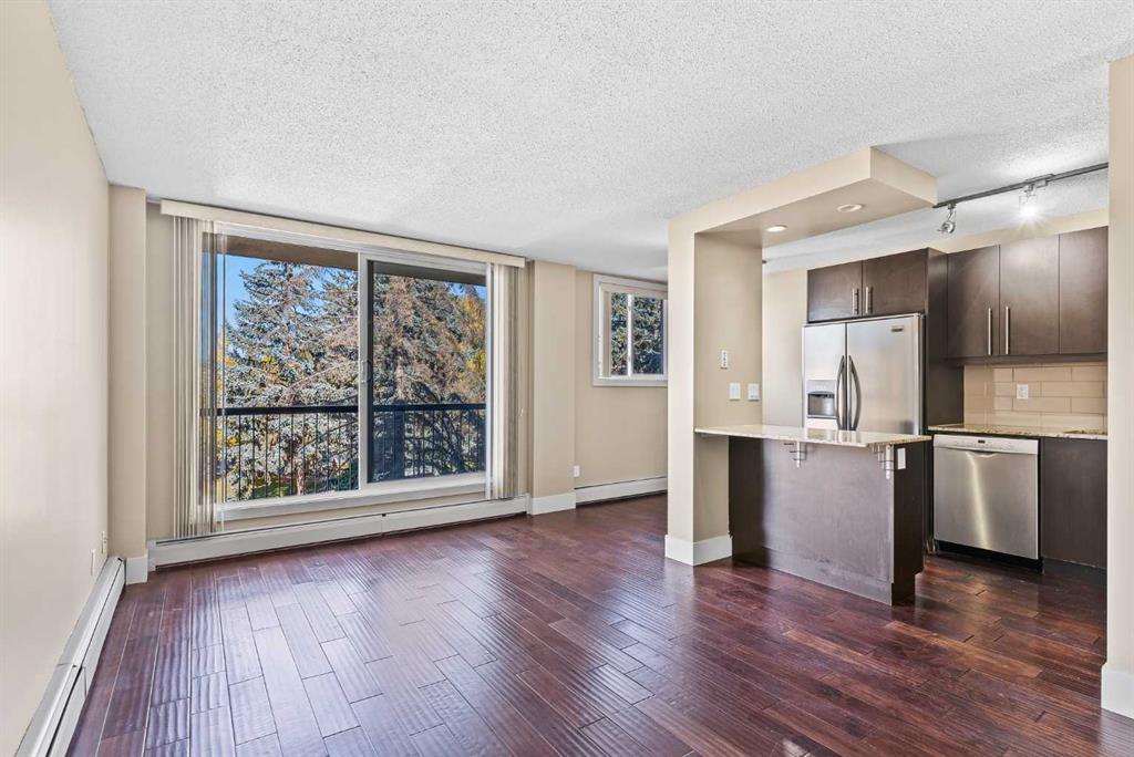 Welcome to The EDGE on the 17th! Say goodbye to downtown and SAIT parking troubles with this ideally located concrete building, just a 2-minute walk from SAIT and the LRT. This third-floor, corner-unit, 2-bedroom apartment offers a spacious open floor plan. The elegant kitchen features premium cabinetry with brushed metal hardware, granite countertops in both the kitchen and bathroom and a sleek stainless steel appliance package. Hardwood flooring graces the kitchen and bath, while the living area showcases rich, engineered walnut hardwood in a deep coffee tone. The unit also includes in-suite laundry with a combination washer/dryer. Enjoy quick access to Kensington’s vibrant pubs, restaurants, trendy shops, and Calgary’s city center and bike paths—perfect for any lifestyle. With views of the Capital Hill community and Nose Hill Park, this unit offers the ideal blend of comfort and style. An assigned off-street parking stall is included. The building has been fully upgraded with high-efficiency boilers, copper plumbing, updated electrical and fire monitoring systems, a new intercom, windows, and oversized patio doors. Easy to show—contact your favourite real estate agent to book a private viewing today!