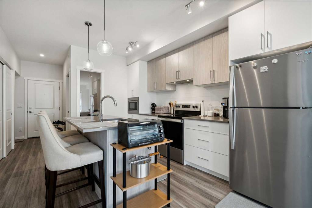 Welcome to 614 Sage Valley Common! This stunning TOP FLOOR 1 BEDROOM + 1 BATH + DEN at Q CONDOS might be just what you've been searching for! Step into your modern open layout that features a bright living room and den, complimented by beautiful views of the rolling farmland outside. The chef-inspired kitchen is a dream for those that enjoy cooking with ample counter space, quartz countertops, contemporary flat panel cabinetry, all the appliances, and wide-plank LVP flooring throughout. Crafted by the award wining Morrison Homes in Sage Hill, this beautiful condo is nestled in the vibrant Sage Hill Quarter! An ideal blend of urban convenience, and contemporary living that you won't want to miss!
