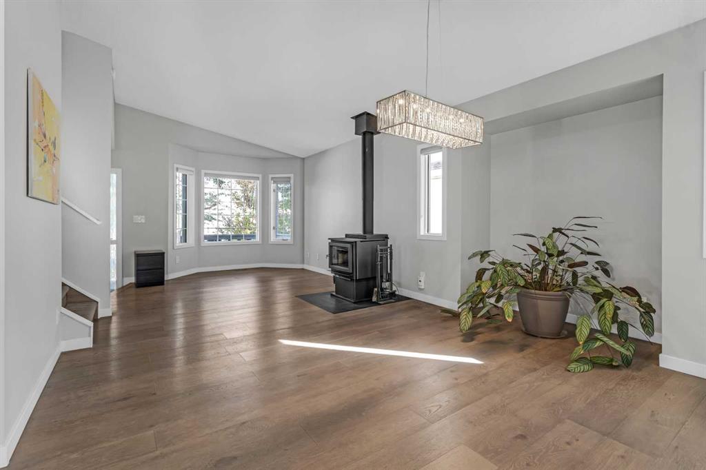 This stunning 2-storey home boasts over 1700 sq ft of renovated living space, perfect for a growing family. The main floor features a beautifully updated kitchen, ideal for the home chef, plus an elegant formal living and dining room with a wood burning stove, perfect for entertaining. Bay windows and vaulted ceilings add architectural interest and create a bright and airy atmosphere. Relax in the sunken family room, complete with a modern fireplace, offering a cozy space for gatherings. Engineered hardwood flooring with a mix of white tile flooring accent the home. Upstairs, you'll find a spacious primary bedroom with a luxurious ensuite bathroom. Two additional bedrooms offer ample space for children or guests. The finished basement adds even more living space with 2 bedrooms, a large game room, perfect for a home theatre, play area, or gym, and another full bathroom. The south facing backyard provides sun throughout the year, while a greenbelt/walking path is located just behind the property. This move-in ready home offers the perfect blend of modern updates and classic charm. Recent upgrades include wood stove installed in 2022, attic insulation (R60) top up, water heater (2022), and NO POLY-B in the home. Book your showing today!