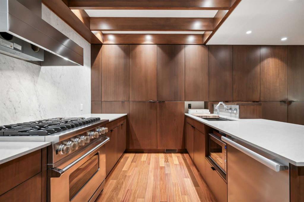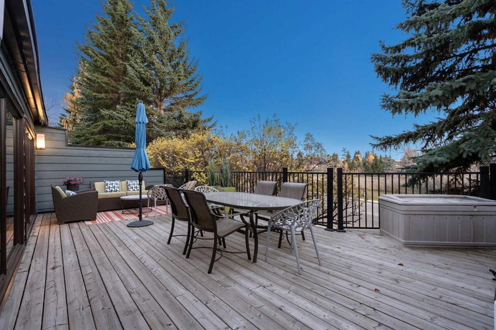 Public Remarks Welcome to this stunning executive townhome nestled in the serene surroundings of one of Calgary’s best neighbourhoods, Varsity! This impressively renovated home offers a rare opportunity to own one of only 16 units in a secluded enclave. The interior designer's brilliance is immediately evident, with beautiful details throughout. The dramatic two-storey fireplace serves as the focal point, while soaring vaulted ceilings, skylights, and expansive windows showcase the beautiful South-facing exposure. This home has been completely renovated to the highest standards in a classic mid-century modern style, providing the perfect space to live, entertain, and relax. The kitchen looks straight out of the pages of Architectural Digest, featuring a custom-designed Merit kitchen with a Kohler sink, Miele dishwasher and refrigerator, a Viking 6-burner dual-fuel range, and a striking slab backsplash. Each bedroom boasts its own full en suite bathroom with custom millwork, offering exceptional comfort and privacy for family and guests. The primary bedroom is a true retreat with custom closets, exposed beams, and a designer en suite complete with a Victoria and Albert volcanic limestone soaker tub and Hansgrohe fixtures. The main floor powder room has a designer flair, featuring engineered leather wallpaper, a wood-accented ceiling, and a custom vanity. The lower level is equally impressive with custom sapele wood millwork, creating a perfect space to unwind with family. Additional updates include newer windows throughout (automatic on the main floor for ease of use), custom wood shutters on the lower level, a new garage door, updated furnaces and air conditioning units, and exotic Brazilian hardwood flooring throughout the main and upper levels, with engineered leather flooring on the lower level. Ideal for those seeking a lock-and-leave lifestyle without compromising on space, this prestigious development offers unmatched tranquility and privacy, while being conveniently located near the University of Calgary, Market Mall, the Children’s and Foothills Hospitals, and top-tier schools. Adjacent to the Silver Springs Golf Course and surrounded by lush trees and green space, homes in this exclusive estate rarely come to market, as owners cherish the exceptional lifestyle it provides.