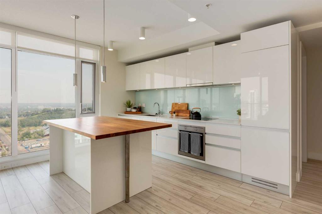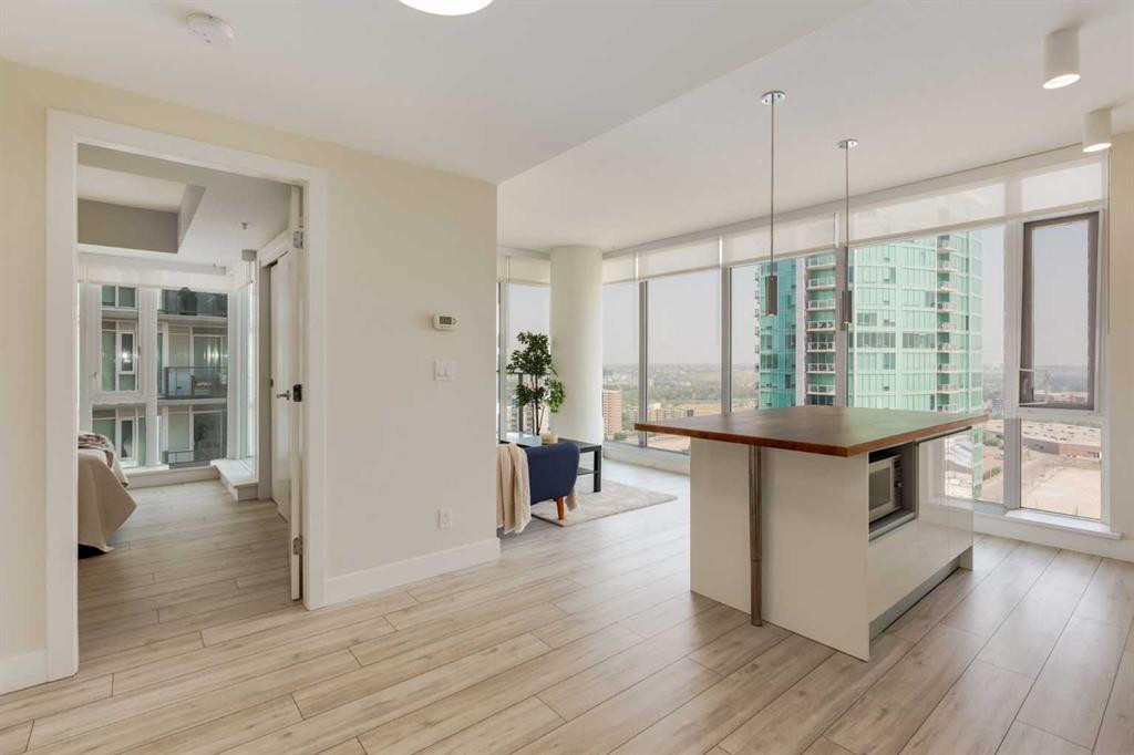 Welcome to the Guardian! This 22nd floor corner unit has amazing city views from every window and 2 balconies to enjoy! The open floor plan features a pristine white kitchen with quartz counters, central island with seating and plenty of cabinets, a living room surrounded with floor to ceilings windows and access to your large covered balcony. There are 2 primary bedrooms each with their own ensuite and the one has a private balcony with views south of Calgary and Stampede Park. This executive style unit has porcelain tile throughout, new laminate flooring in 2023 and insuite laundry with brand new washer & dryer. You also get a titled storage unit and 1 leased parking stall to complete this unit. The Guardian has much to offer from the fitness centre, workshops, concierge, and social rooms to only being steps away from transit, Stampede Park and minutes walk to 17 Avenue and the downtown core. Air BNB's are allowed (with approval), amazing opportunity for a first time buyer or investor.