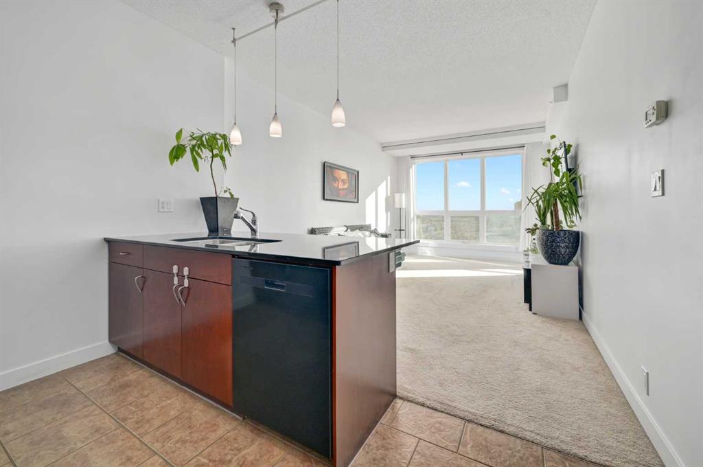 Public Remarks ~~~Stunning Mountain Views – South-Facing 19th Floor Gem~~~ | Mountain Views | 1 Bed + Den - 1 Bath | 713 SQFT | Underground Parking | Close to LRT and Amenities | Welcome to this exceptional south-facing unit featuring stunning mountain views. Exceptional rental potential and pet friendly complex. As you enter, the foyer opens to a spacious living area with large, bright windows and a functional layout. The home includes a well-appointed kitchen, featuring a centre island and granite counter tops. Additionally the living room is spacious, and the den is perfect for an office or spare bed. The 4-piece bath, and bedroom are well appointed and sized. This unit also offers in-suite laundry and a large balcony with unobstructed views and gas hook up. Enjoy close proximity to many restaurants, easy access to Heritage LRT, Save-On-Foods, and nearby shopping. This is a fantastic location within the complex—don't wait to book your private showing!