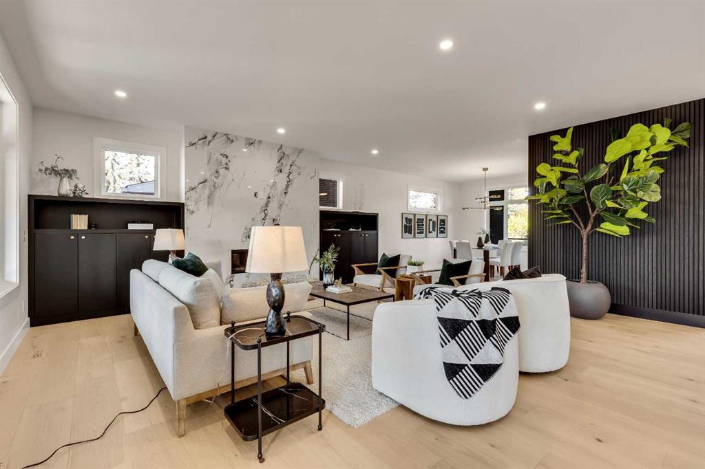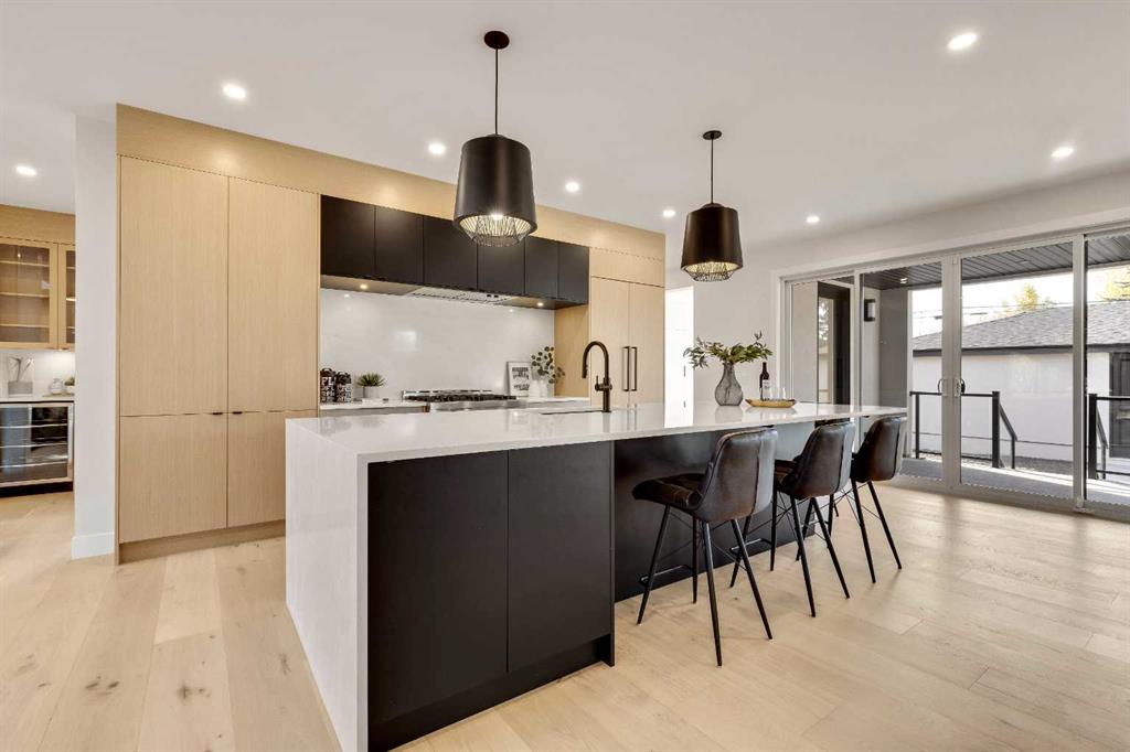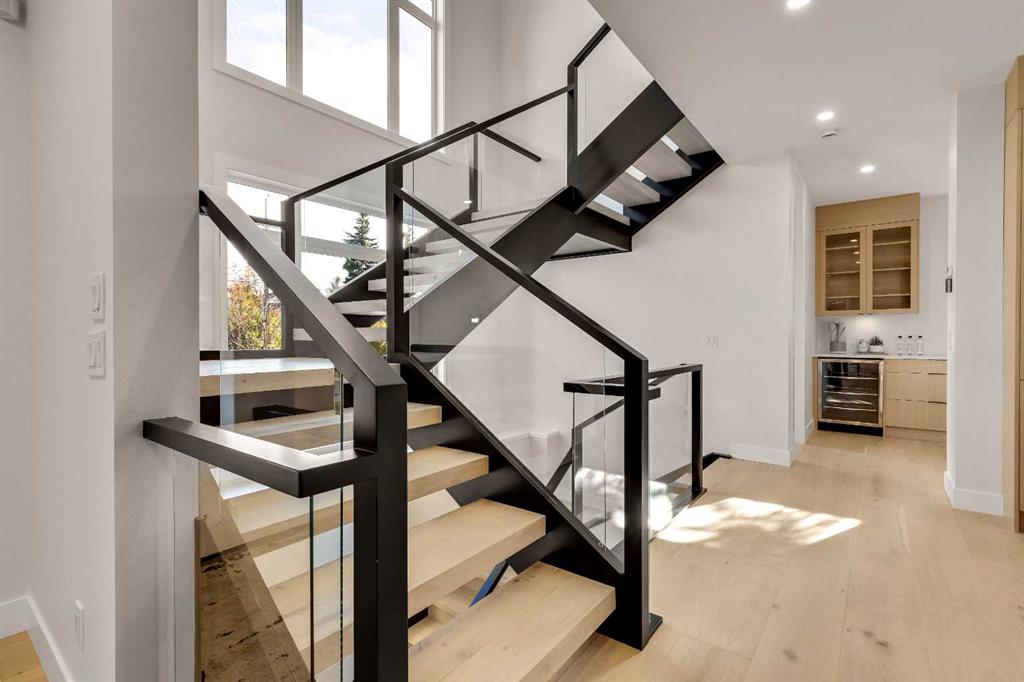 LOCATION, LOCATION, LOCATION! Nestled in the heart of Bowness and located on the most sought-after street of Bow Crescent just steps away from the Bow River, this stunning property features over 4,300 sf of developed space and well-appointed high end custom finishings. Expertly designed and crafted by Elegant Homes, this is truly a one-of-a-kind home. The curb appeal is captivating featuring modern design elements, aluminum paneling, metal roofs, and a covered east facing front porch. As you enter the home, you are greeted by an expansive main floor with an open concept design, clean and bright, featuring a large living room with a stunning inset gas fireplace and ceiling height porcelain tile surround, custom millwork, massive windows, and an elegant dining area. 9.6" White Oak engineered hardwood floors throughout the main and upper floors, plus stairs up and down. The Chef's kitchen with two-tone custom cabinetry, oversized waterfall quartz island, full height quartz backsplash, multiple drawers and high-end stainless steel appliances with paneled fridge provide function and practicality for everyday cooking and entertaining plus easy access to the rear deck through the 12' sliding patio doors. The butler pantry offers additional space for storage plus a prep sink and beverage fridge. The private tech office will function well off the main living area with custom built-in desk and shelfing. A rear mud room with custom lockers plus large walk-in closet provide ample storage. The spectacular open staircase with glass railings and open hardwood risers highlight the living space. The upper level offers 3 spacious bedrooms, a good sized laundry room with sink, quartz countertop and lots of cabinet storage. The primary bedroom features an incredible spa-like ensuite with designer tile, an elegant soaker tub, large shower with 10mm glass and bench, Dual vanities with quartz counters, undercabinet lighting, heated tile floors and a private water closet. The oversized master closet features a walk thru into the laundry room. A desk for two finishes off the upper floor. The finished basement features a large rec room along with a full wet bar and built in custom shelving, 4th bedroom and 4 pc. bathroom. Other highlights of this stunning home include 8' high passage doors, Kohler plumbing package including a Touch faucet in the kitchen, designer lighting, rough ins for AC and in-floor heat in the basement and an oversized covered rear deck with glass railings providing the perfect space for entertaining and relaxation regardless of the weather. The oversized detached 3-car garage, fully landscaped, irrigation system with wide open West facing rear yard finish off this incredible home. This property is ideally located for the growing family with easy access to the Bow River pathways, close to schools and shopping, minutes from Downtown and a quick exit to the mountains! This home is a must see and will be sure to impress with all the attention to detail and expert design!
