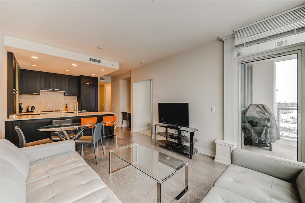 Furnitures can be included in the sale, long term lease can be in place) Welcome to the prestigious Waterfront condo in the heart of Downtown! This upscale complex offers over 6000 sq.ft. state of the art amenities including CONCIERGE SERVICE, FITNESS FACILITIES, INDOOR WHIRLPOOL, SAUNA, MOVIE THEATRE, PRIVATE OWNERS SOCIAL LOUNGE, OUTDOOR GARDEN PATIO, VISITOR PARKING, CAR WASH and so much more! Located along the Bow River and Princess Island Park. Walking distance to Chinatown, East Village, Eau Claire Market and amazing shops & restaurants. This charming 1 bedroom 1 bath unit located on the 19th floor features 533 sq.ft of living space, built-in computer desk, 9 ft. ceiling, hardwood floors, city and River views and a gourmet kitchen with Quartz counter-tops, full heights cabinetry, gas cook top and built-in features. A generously sized bedroom connects with a walk-thru closet and direct access to the 4 piece bathroom from the bedroom or the living room and the in-suite laundry completes this unit. Comes with 1 parking and 1 storage locker. It's perfect for families of any size or as an investment property. Book your private showing today!