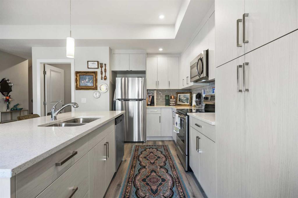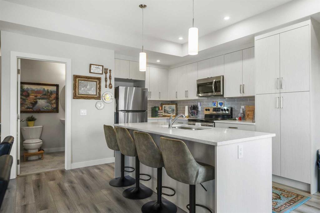 ***OPEN HOUSE SATURDAY NOV 9 from 1-3PM*** Step into this beautifully designed end-unit townhouse by Slokker Homes, where modern elegance meets functional living. This 3-bedroom, 2.5-bathroom residence offers just over 1500sqft of meticulously planned space, complete with a single attached garage and an additional driveway parking spot. Perfectly positioned in a sought-after location with picturesque views of the Canal, this home exudes sophistication and warmth. The open-concept main floor is an entertainer’s dream, featuring soaring 10-foot ceilings, wide-plank vinyl flooring, and an abundance of natural light from the surrounding windows. The sleek, modern kitchen is outfitted with stylish white cabinetry, stunning quartz countertops, stainless steel appliances, and a spacious central island with ample seating—perfect for culinary creations or casual gatherings. Upstairs, the expansive primary bedroom offers a private sanctuary with a luxurious 4-piece ensuite and a generous walk-in closet. Two additional well-proportioned bedrooms, a 4-piece bathroom, and a conveniently located laundry room complete the upper level. Enjoy the ease of low-maintenance living in a prime neighborhood with easy access to the city’s finest amenities, schools, shopping, playgrounds, and a quick 15-minute commute to Calgary. This exceptional property offers both style and convenience—schedule your private showing today!