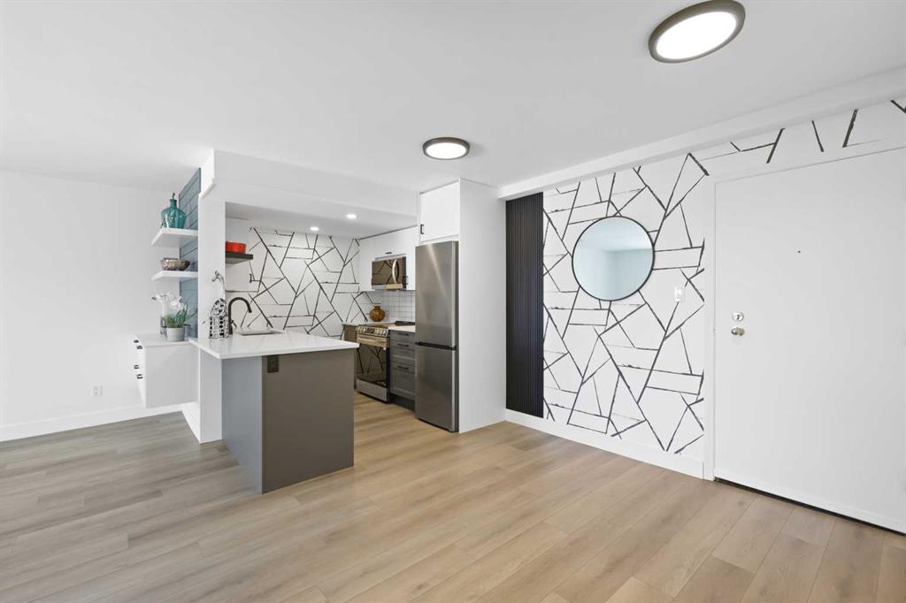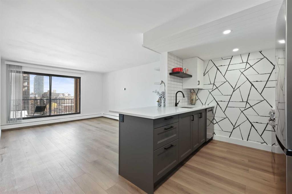 PROFESSIONAL RENOVATIONS JUST COMPLETED! QUALITY FINISHINGS AND DESIGNER STYLE await you! ELECTRICITY INCLUDED IN THE LOW CONDO FEES. Be the first to live here. Ready and waiting for a new owner!. This beautiful spacious 1 bedroom condo boasts 632 square feet and features a LARGE open living area, a large bedroom and a designer 4 piece bath. INSUITE LAUNDRY TOO with a new washer/dryer combo. Additional common laundry on site if needed. This home has 1 assigned parking spot in the underground heated and secure parkade. The large balcony is spacious for entertaining and relaxing. This home features a designer kitchen that will thrill the chef in the family. Upgraded NEW stainless steel appliances including a range with air fryer functionality and new 1 ¼” quartz countertops. All appliances come with warranties. Beautiful luxury vinyl plank waterproof flooring and gorgeous wallpapered feature walls with built-in floating shelves and floating cabinets take this home to another level. New designer LED lighting throughout. New black out cellular blinds included. PETS WELCOME! 1 dog or 1 cat (max weight 35 lbs). Well maintained building with a large common area foyer and 2 elevators. Leave your car at home! Walk everywhere! A must see property! Book your appointment today!!