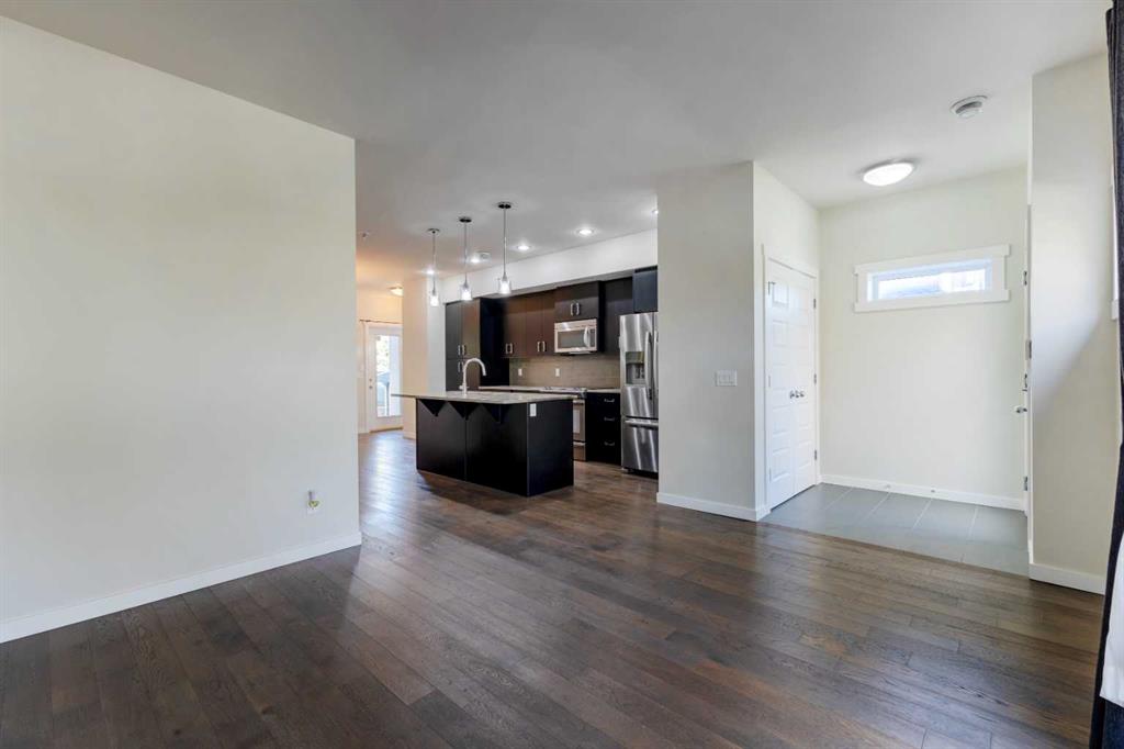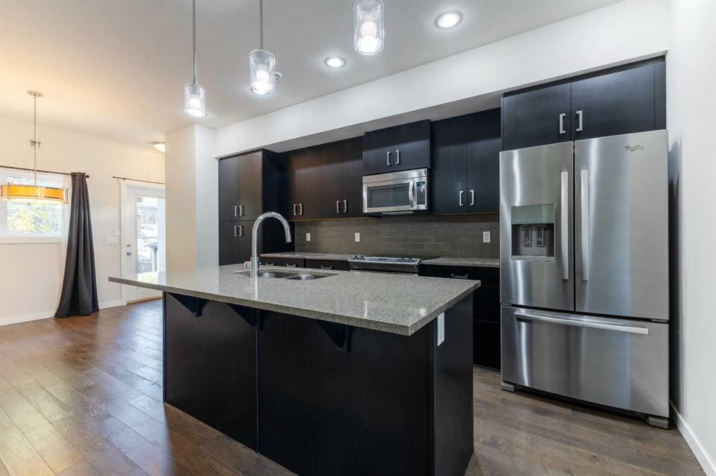 Discover modern comfort and convenience in this impeccable 3 bedroom, 2.5 bath large CORNER TOWNHOME built by Crystal Creek Homes in the popular community of Killarney, centrally located off 17 Ave SW, minutes commute to DOWNTOWN. **MOVE IN READY!! NEW PAINT THROUGHOUT, HUGE PRIMARY BEDROOM & LUXURIOUS 5 PIECE ENSUITE** Stepping inside, you will feel right at home with over 1730 sq ft of living space with spacious 9 ft ceilings, elegant hardwood flooring and fresh paint throughout. The open-concept layout connects the comfortable living room with lots of natural light, kitchen, and good sized dining area, which leads to the gorgeous back deck with a gas line and mature trees, creating the perfect atmosphere for indoor and outdoor living. The kitchen features stainless steel appliances, large center island with quartz countertops, espresso-darker stained wood cabinets with backsplash. The 2 piece bath and under stairs storage completes the main level. Second level you will discover a flex/game room, two good sized bedrooms, one with a walk in closet, 4-piece bathroom and convenient hidden laundry. These rooms offer versatility to turn into a home office, or a home theater room. Stepping on to the 3rd level you will walk into your Primary retreat featuring a huge walk in closet, and luxurious 5 piece ensuite with large soaker tub, water closet, dual vanities and separate oversized shower. THE PRIMARY BEDROOM ALSO LEADS ONTO A PRIVATE EAST FACING BALCONY WITH BONUS STORAGE ROOM. Detached garage with assigned parking stall. Walking distance to Killarney Aquatic & Recreation Centre, parks, and playground. Minutes to downtown, shopping, schools, LRT and bus stops, trendy 17th Avenue and all amenities to enjoy in Killarney with easy access to major roads. Inner-city living at its best! Call for your private showing!