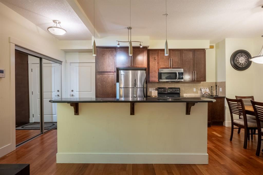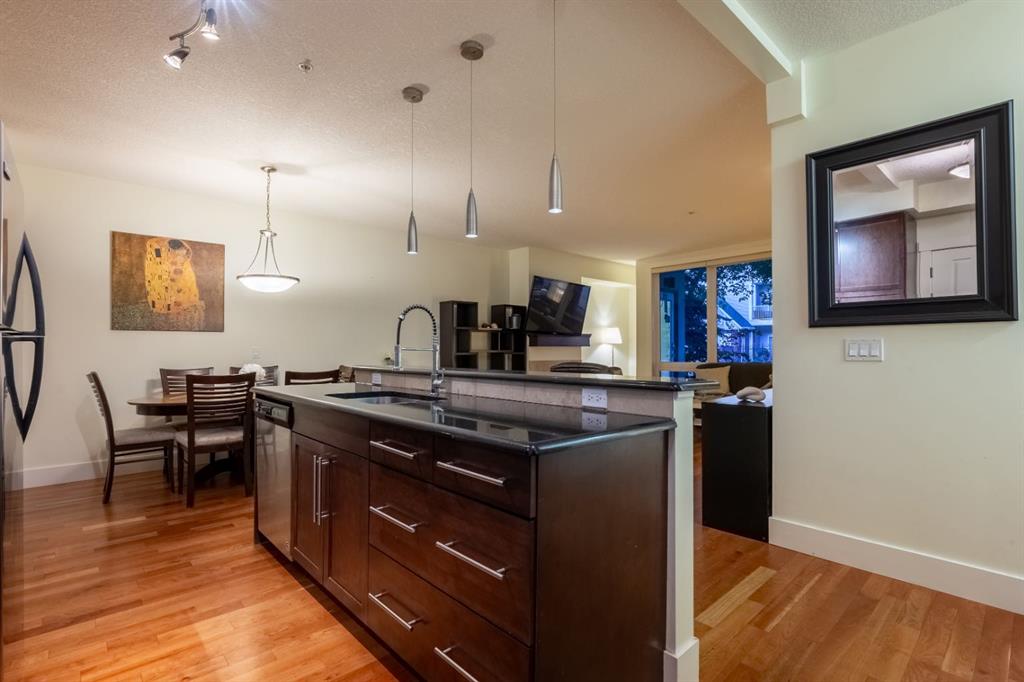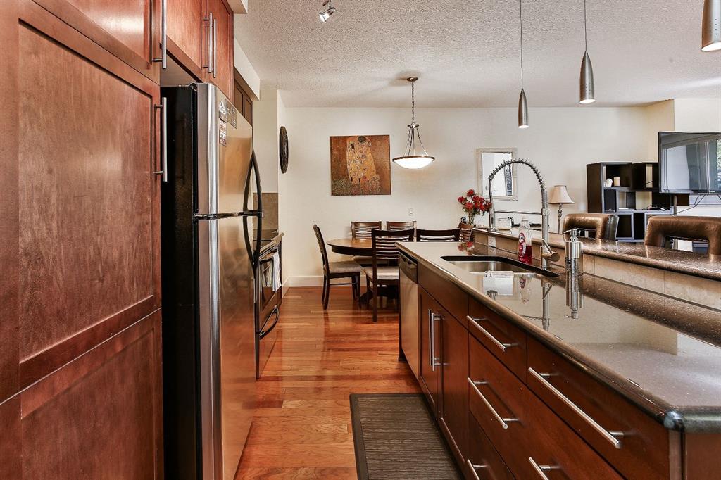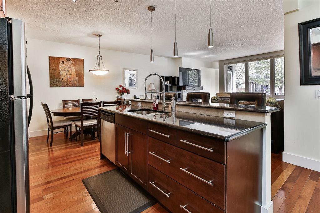 Located in the heart of Bridgeland, this desirable two-bedroom condo hosts exemplary finishes, a premium location and a rare design that encompasses nearly one thousand square feet of living space! This is the perfect live-in or rent-out investment and it is located within a premier boutique building of only sixteen units! This coveted corner unit has its own personal front door through the walk-up patio. This allows you to have the best of both worlds, a low maintenance lifestyle living in a condo, but the benefits of having your own entrance which makes it feel more like home. From the moment you walk in, your will be impressed by the meticulous care and thoughtful design of this home. The open concept design has 9’ ceilings and features stunning hard wood floors under a plethora of natural light from the many windows throughout the space. The beautifully appointed kitchen has luxurious finishes with a neutral palette that is timeless in design. The kitchen showcases extended cabinetry, complimented by granite countertops, full-sized professional appliances and designer backsplash. The extravagant island has space for four and a rare and welcomed formal dining area sits adjacent to the island. The dining room could be flex space or an in-home office – or with this generous square footage you can have both! From here, the dining area seamlessly transitions into the living room, an unforgettable space for friends and family to gather. The living room is adorned with light as it hosts beautiful windows and a floor to ceiling glass door that accesses your picturesque patio, a retreat for summer nights with your loved ones. A spectacular feature of this condo is that this unit offers a desirable street view from the balcony and the raised balcony ensures privacy as it is enveloped with its serene and lush landscaping, a private outdoor oasis! When your day comes to an end, unwind in your primary retreat. The bedrooms are ensconced on one of the unit offering the ideal configuration for privacy and versatility between guests or roommates. The primary has space for a king-sized bed alongside a spacious closet. The second bedroom is ample in size and can be used as a guest room, office or gym. The four-piece bath sits in between the bedrooms and has matching granite counter tops with an extended vanity! This unit features in-suite laundry and in our winter months you will love your heated, underground parking stall. For those with furry friends, this complex backs directly unto a small off leash park. Bridgeland is an award-winning community with walkability to Downtown Calgary and quick access to transit. The area is affluent & offers top-rated restaurants, coffee shops, grocery store, schools a dog park and a plethora of natural pathway systems alongside the Bow-River and Princess Island Park. Perfect for those looking to right-size, this townhome has exceptional value & leaves nothing to be desired! No weight restriction on pets (board approval), furniture negotiable