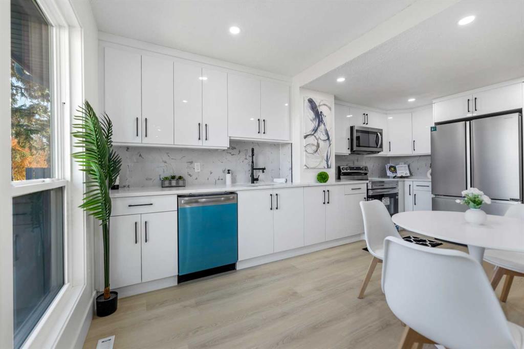 FULLY RENOVATED END UNIT WITH SEPARATE ENTRANCE TO BASEMENT. A fantastic 3-bedroom, 1.5-bathroom townhouse with lots of potential in a very convenient location! This bright and clean 2-storey unit in a well-managed complex offers comfortable living with a generous layout. The whole house is adorned with beautiful VINYL plank flooring, adding a touch of elegance and ease of maintenance. The main floor features a living room and kitchen with large windows that let in an abundance of natural light, along with a half bathroom. The upper floor boasts a large primary bedroom with 2 other bedrooms and the main 4-piece bathroom. The full-size developed basement provides additional living space and flexibility for various uses. With its own separate entrance, it offers privacy and convenience, making it ideal for a recreation room, home office, or even a guest suite (roughed in full bath). UPGRADES INCLUDE : BRAND NEW KITCHEN WITH QUARZ COUNTERTOP, BRAND NEW APPLIANCES WITH 1 YR WARRANTY, NEW VINYL PLANK FLOORING THROUGHOUT, BATHROOMS, ELECTRICAL FIXURES, SOCKETS AND SWITCHES, FRESHLY PAINTED, ETC.. I The unit comes with an outdoor parking stall just steps away from the front door. This townhome is steps away from all level of schools and within walking distance to Thornhill Aquatic & Recreation Centre, the public library, and the Superstore. It's also within walking distance to Centre Street. This strong location offers quick access to all areas of the city by car or public transit, and easy access to downtown within a 15-minute drive. Schedule your viewing today and make this charming house your new home!