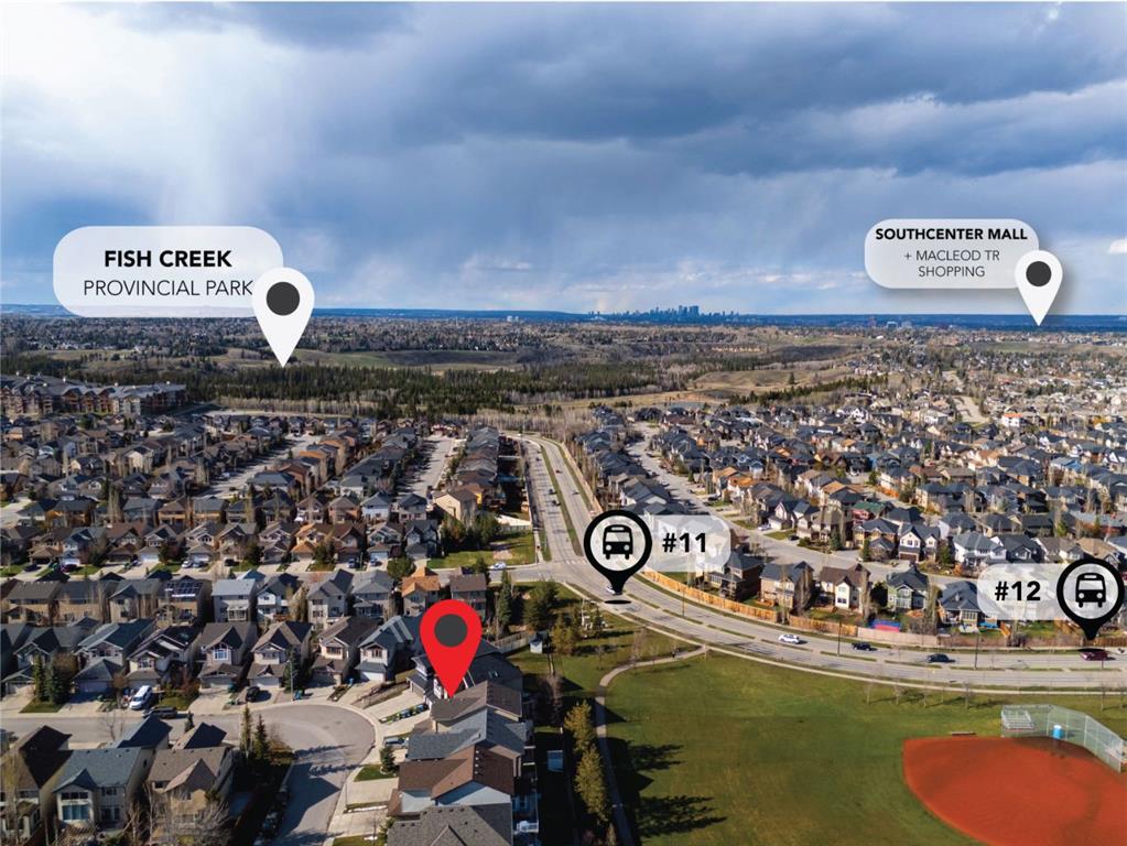 ****All the furniture seen in the home is included in the sale price**** Nestled in a peaceful cul-de-sac, this impressive two-story walkout basement home offers over 2,690 sq. ft. of developed living space on one of the LARGEST LOT in the area, backing onto an expansive GREEN SPACE, with a bus stop conveniently located right behind the house. The exterior was fully refreshed in 2021 with STUCCO, ROOF, EAVES TROUGHS, AND GUTTERS, offering a sleek, modern appeal. The bright, airy foyer leads to a versatile office/flex room perfect for working from home. The kitchen is a chef’s dream, featuring rich dark wood cabinetry, stainless steel appliances including a GAS RANGE, a large island with a breakfast bar, and a walk-through pantry for added convenience. The living room is bathed in natural light and features a cozy stone-surround gas fireplace with elegant white shutter blinds. From the breakfast nook, sliding doors open onto a spacious deck with a gas BBQ hookup, offering stunning views of the green space—perfect for summer gatherings. This home has a CENTRAL AIR CONDITIONER to keep you comfortable year-round and an underground irrigation system to maintain a pristine lawn effortlessly. A beautiful hardwood staircase leads to the upper level, where you’ll find a large bonus room, a luxurious master suite with an ensuite, two generously sized bedrooms, and a 4-piece bathroom. The fully finished WALKOUT BASEMENT adds even more living space, complete with a stylish stone wet bar, a fourth bedroom, and another 4-piece bathroom. Just a short walk to nearby schools and close to Fish Creek Park and its amenities, this home combines space, convenience, and peaceful surroundings for a truly exceptional living experience.